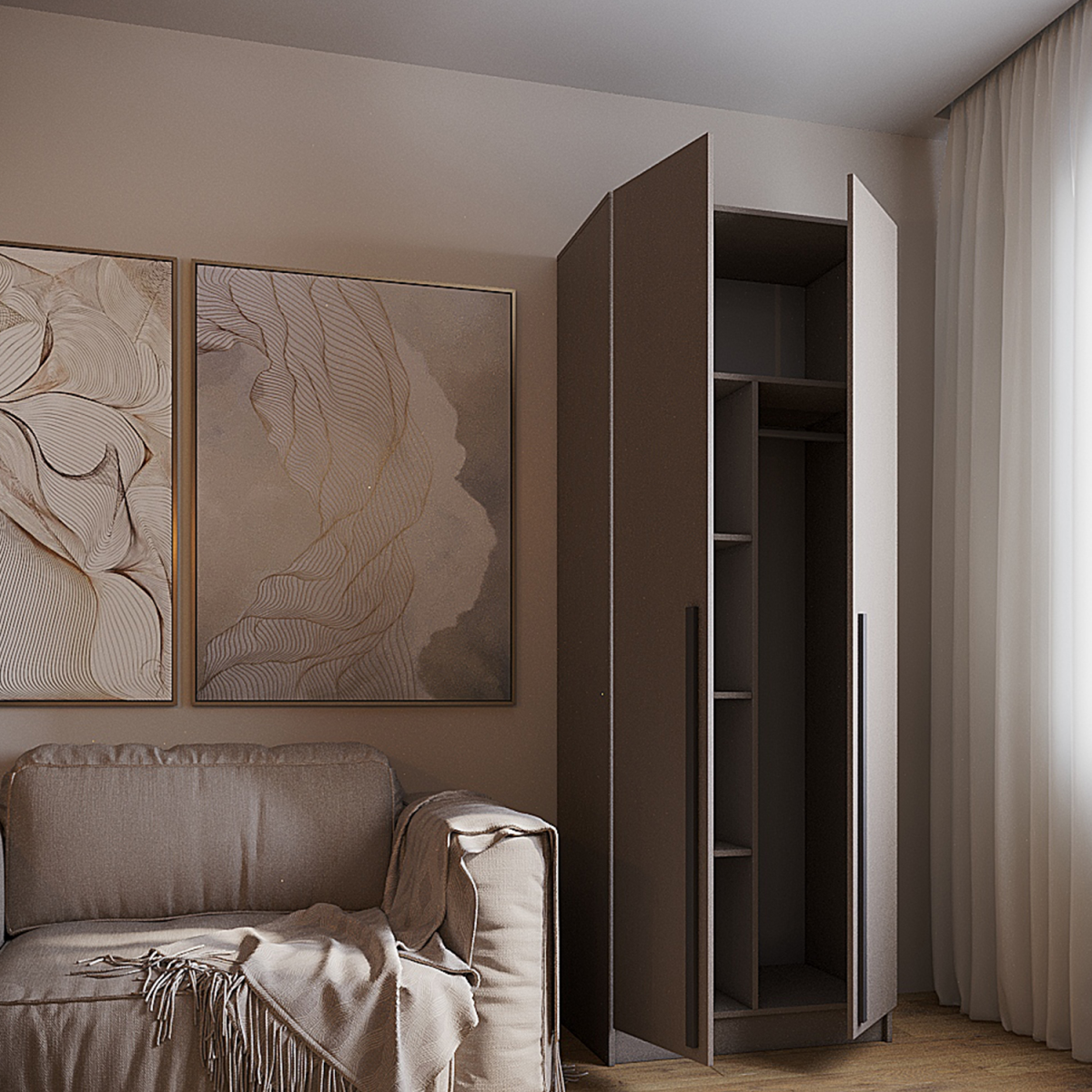 Шкаф Бостон 800 двухстворчатый, выполнен в цвете Бежевый/Глиняно-серый. Распашной шкаф для одежды выполненн из практичного ЛДСП, предназначен для хранения одежды, обуви, головных уборов и аксессуаров. Для этого в шкафу имеется вместительное отделение с штангой и пятью практичными полками. Удлиненные ручки МДФ черного цвета придают оригинальности простому лаконичному дизайну шкафа. Размеры шкафа: 800х2200х500 (ШхВхГ). Инструкция и вся необходимая фурнитура предусмотрена в комплекте.