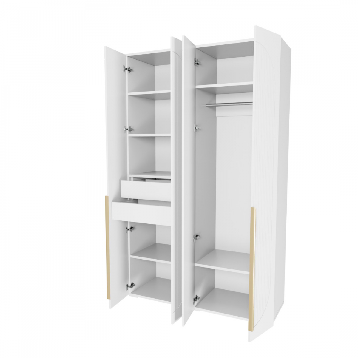 Шкаф оснащен металлическими ручками, петлями с доводчиками и шариковыми направляющими.