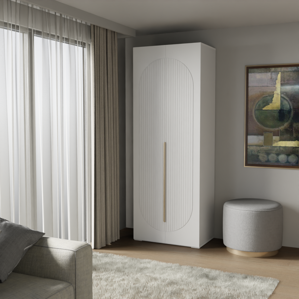 Шкаф Фиеста 80 см в белом цвете с фасадами из МДФ и корпусом из прочного ЛДСП – идеальное решение для организации хранения в спальне или прихожей. Этот вместительный распашной шкаф с габаритами 80,2х220×50 см предлагает оптимальное сочетание элегантного дизайна и практичной функциональности.