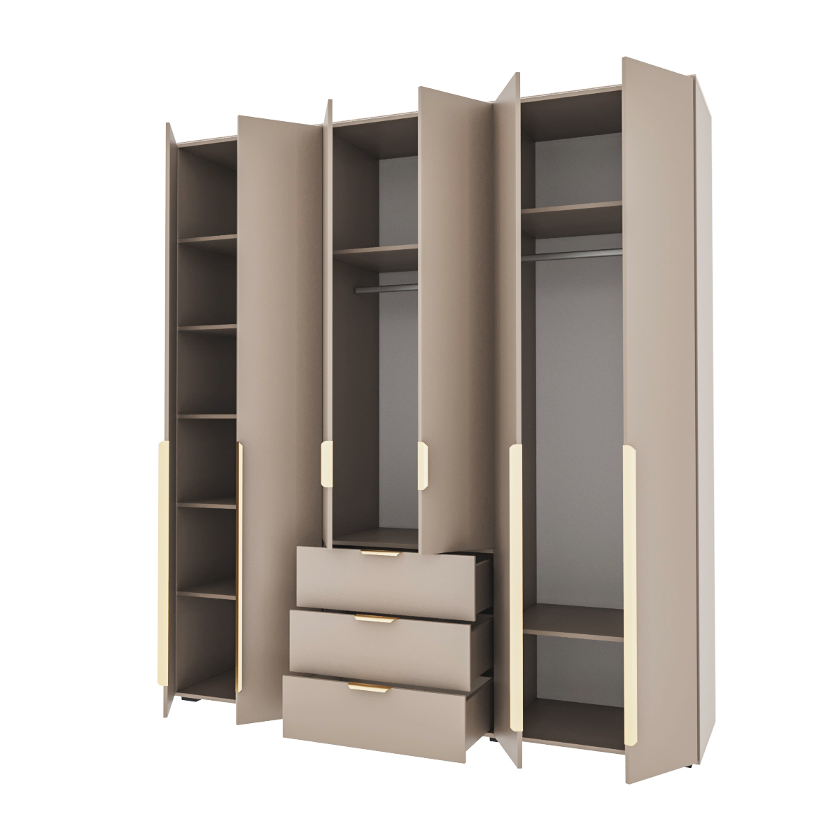 Шкаф наполнен 8ю вместительными полками, 3мя выдвижными ящиками на шариковых направляющих, а также имеется 2 отдела с штангами для вешалок.