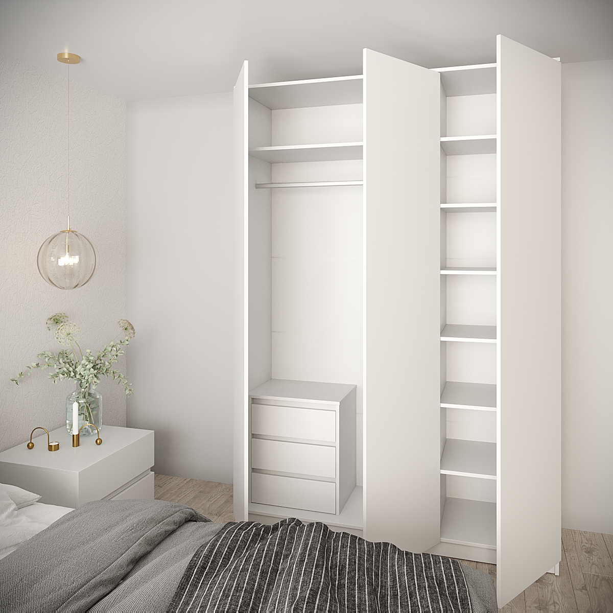 Шкаф МИКА 1500 выполнен в Белом цвете. Трехдверный, практичный и многофункциональный шкаф для вашей комнаты, которая позволит вам хранить большое количество вещей компактно и удобно. Шкаф наполнен 8-ю пвместительными полками, одной длинной штангой, а также вроен комод из 3 ящиков. у шкафа отсутствует лицевая фурнитура , дверцы без ручек, открываются нажатием при помощи выталкивателей с магнитным окончанием, которые идут в комплекте к каждой двери. 3 ящика втроенного комода выезжают на шариковых направляющих полного выдвижения.