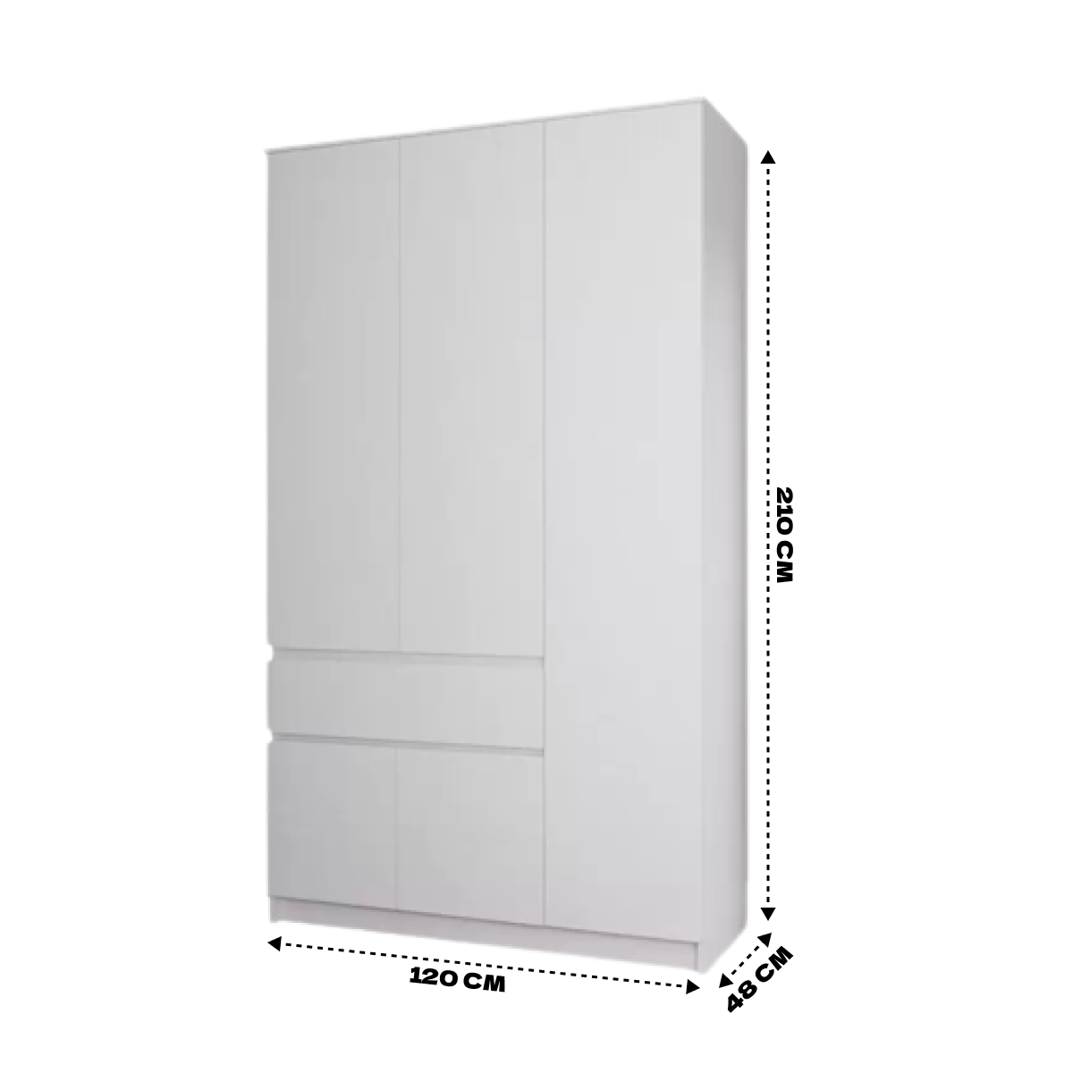 Шкаф 3х створчатый, в цвете - Белый, для одежды и белья с 1 ящиком. За распашными дверями штанга и полки, вместительный ящик. Зона хранения ящика 710*400*120. Размеры шкафа 1200х2100х480.