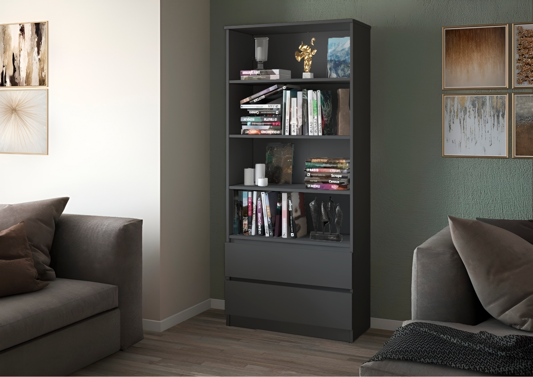 Стеллаж "Мальм", выполнен в цвете Графит с 2-мя выдвижными ящиками. Стеллаж подходит для использования в гостиной, детской, спальне, прихожей, офисе или рабочем кабинете. Стеллаж выполнен из кпрочного материала - ЛДСП, с ящиками на шариковых направляющих полного выдвижения. Выполнен без ручек , открывание ящиков выполняет фасад. Размеры стеллажа: 804х1800х350 (ШхВхГ). Инструкция и вся необходимая фурнитура предусмотрена в комплекте.