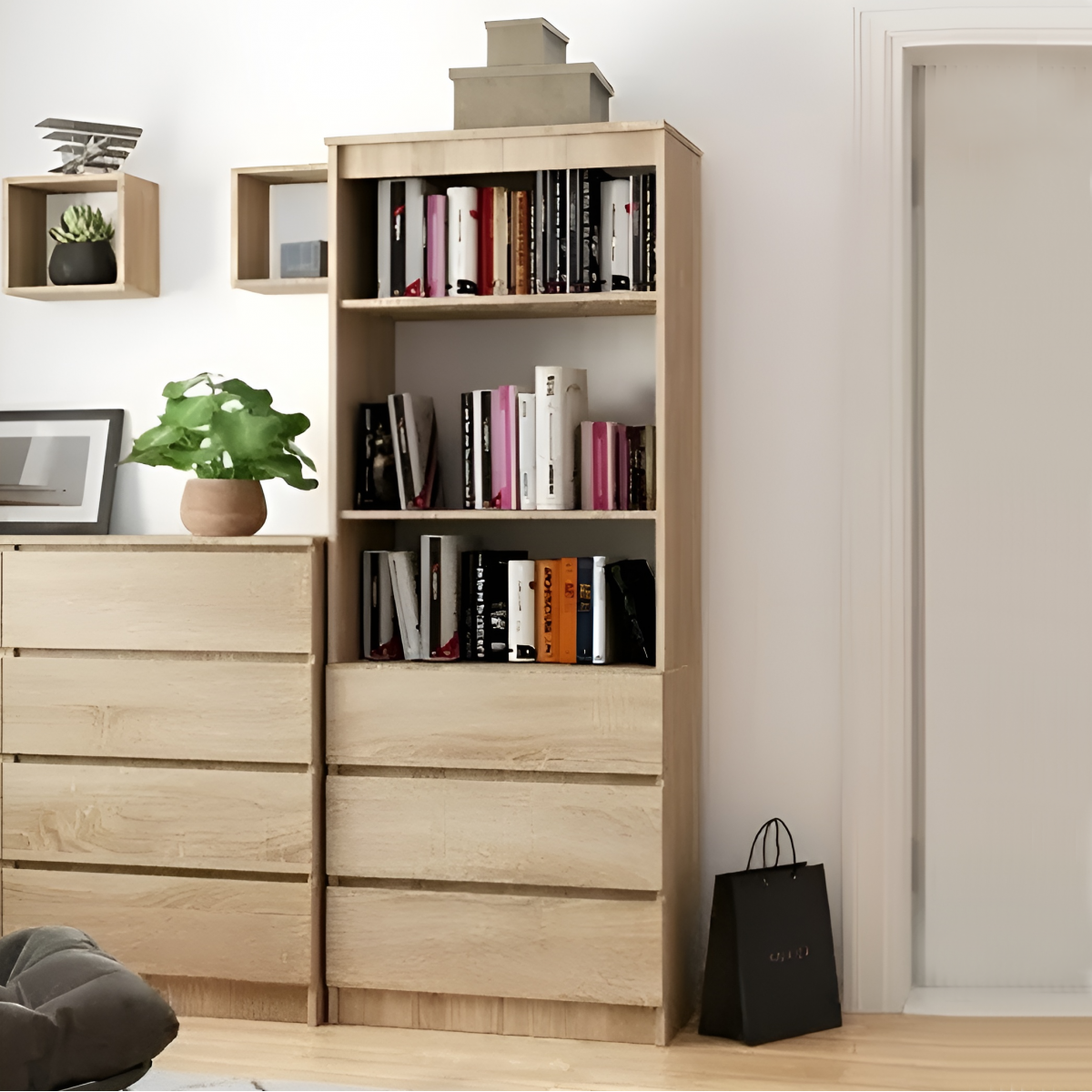 Стеллаж Сура (3 ящ) в цвете Сонома, выполнен в стиле Икеа, производство Россия. Стеллаж цвета Сономы имеет открытые полки и 3 ящика на роликовых направляющих,соединение элементов мебельной конструкции с помощью эксцентриков. Отличное решение для организации хранения книг, декора, игрушек, различных мелочей и вещей. Вместительные 3 ящика для белья позволяют разместить постельные принадлежности, вещи, документы и др. Стеллаж подходит для гостиной, спальни, детской, балкона, прихожей и даже кухни.
