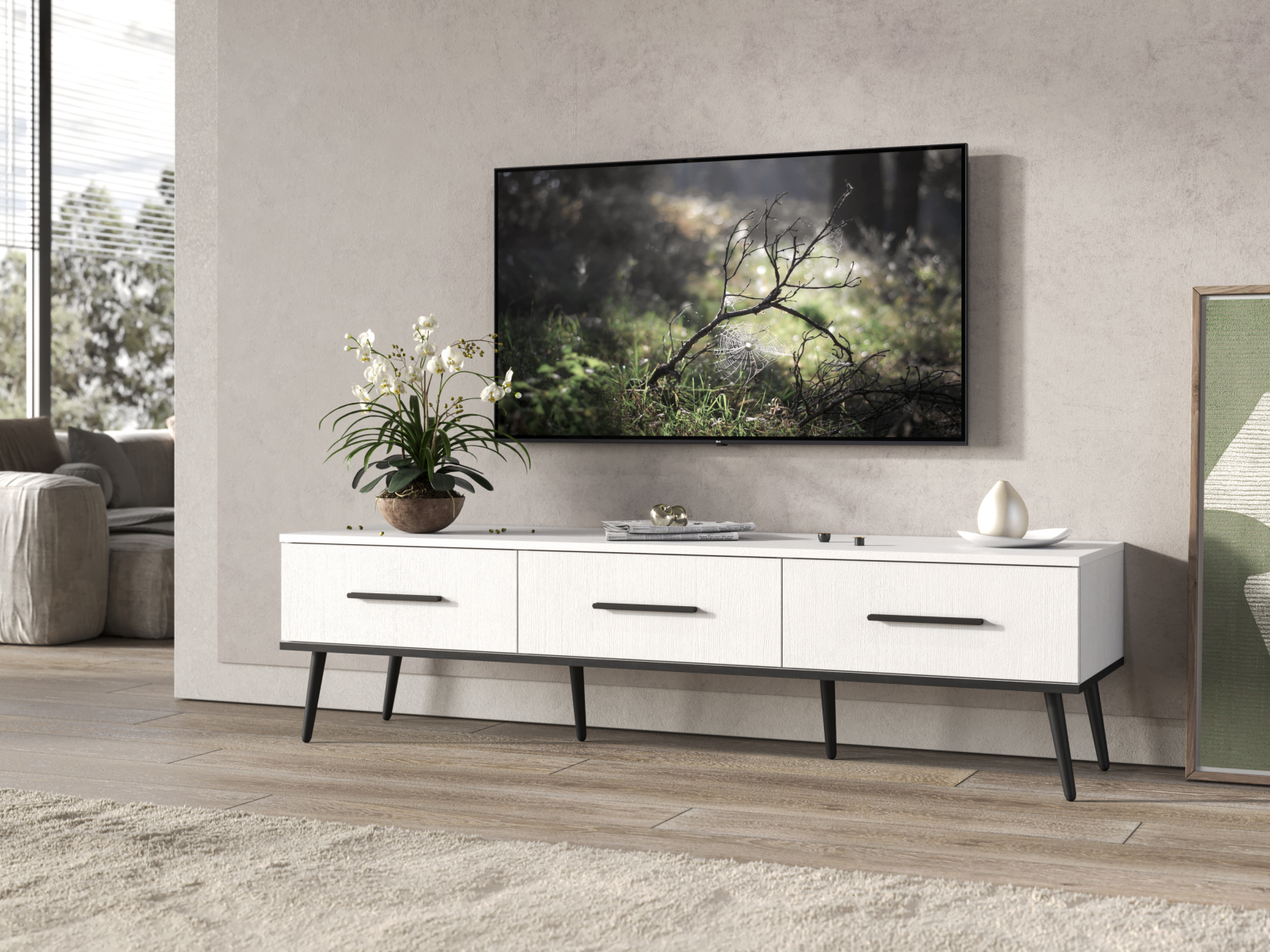 Тумба изготовлена из высококачественного материала ЛДСП в Белом цвете, что придает ей элегантный и дорогой вид. Благодаря своим размерам - 165,2х44х45 (ШхВхГ), тумба обладает достаточной вместительностью для размещения различных мультимедийных устройств и аксессуаров, таких как приставки, роутеры, игровые консоли и многое другое.