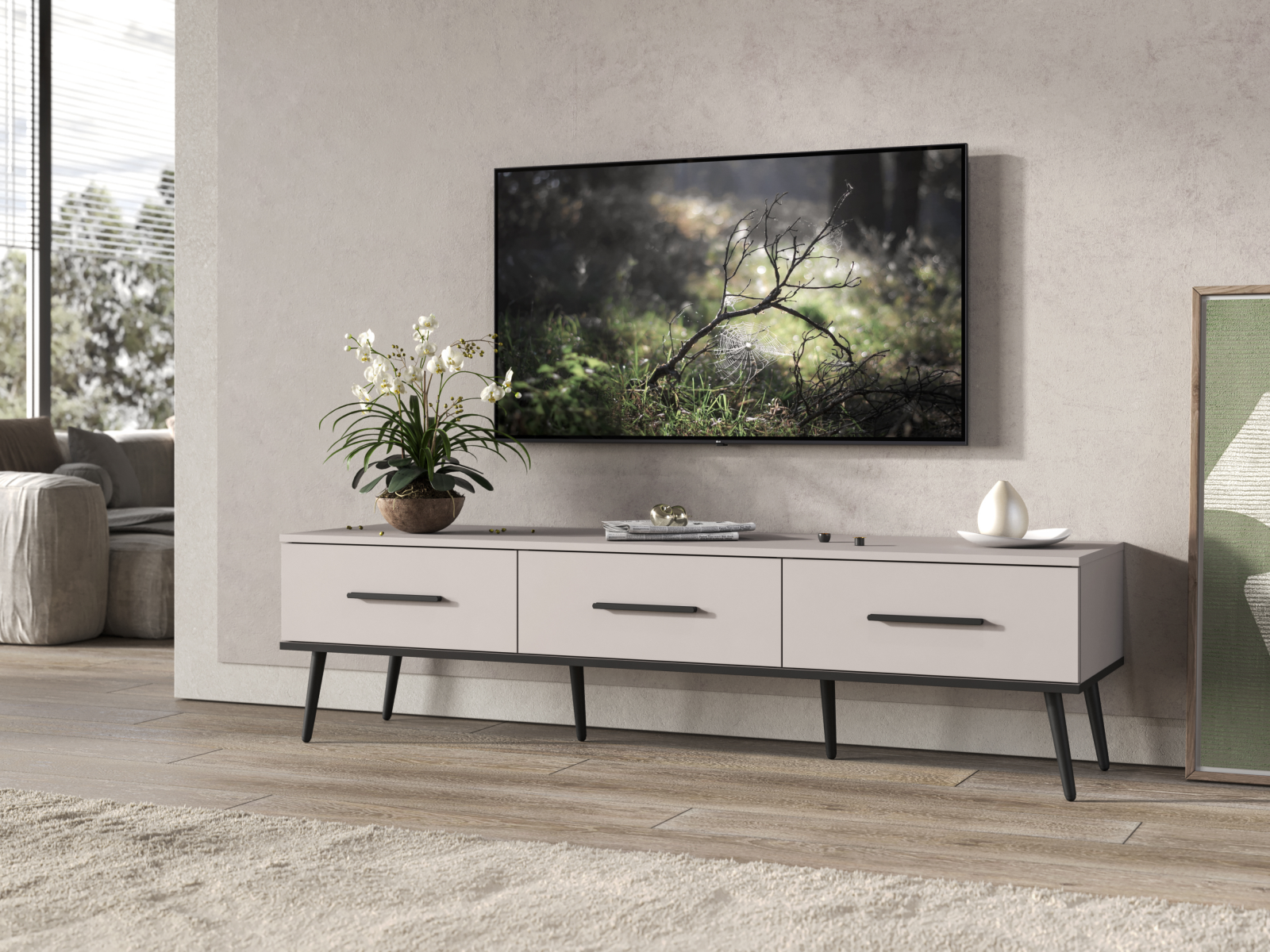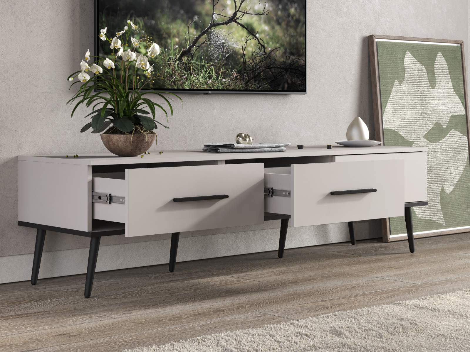 Тумба изготовлена из высококачественного материала ЛДСП в цвете Кашемир, что придает ей элегантный и дорогой вид. Благодаря своим размерам - 165,2х44х45 (ШхВхГ), тумба обладает достаточной вместительностью для размещения различных мультимедийных устройств и аксессуаров, таких как приставки, роутеры, игровые консоли и многое другое.