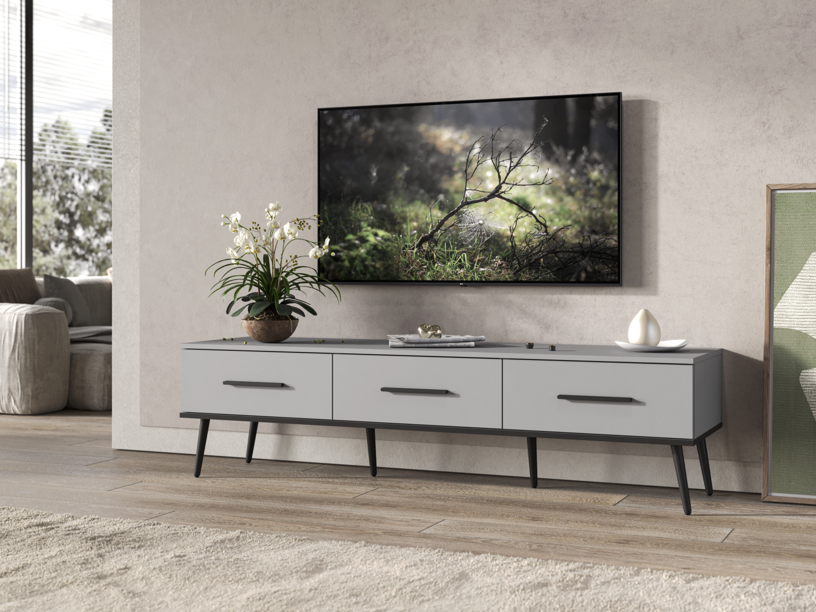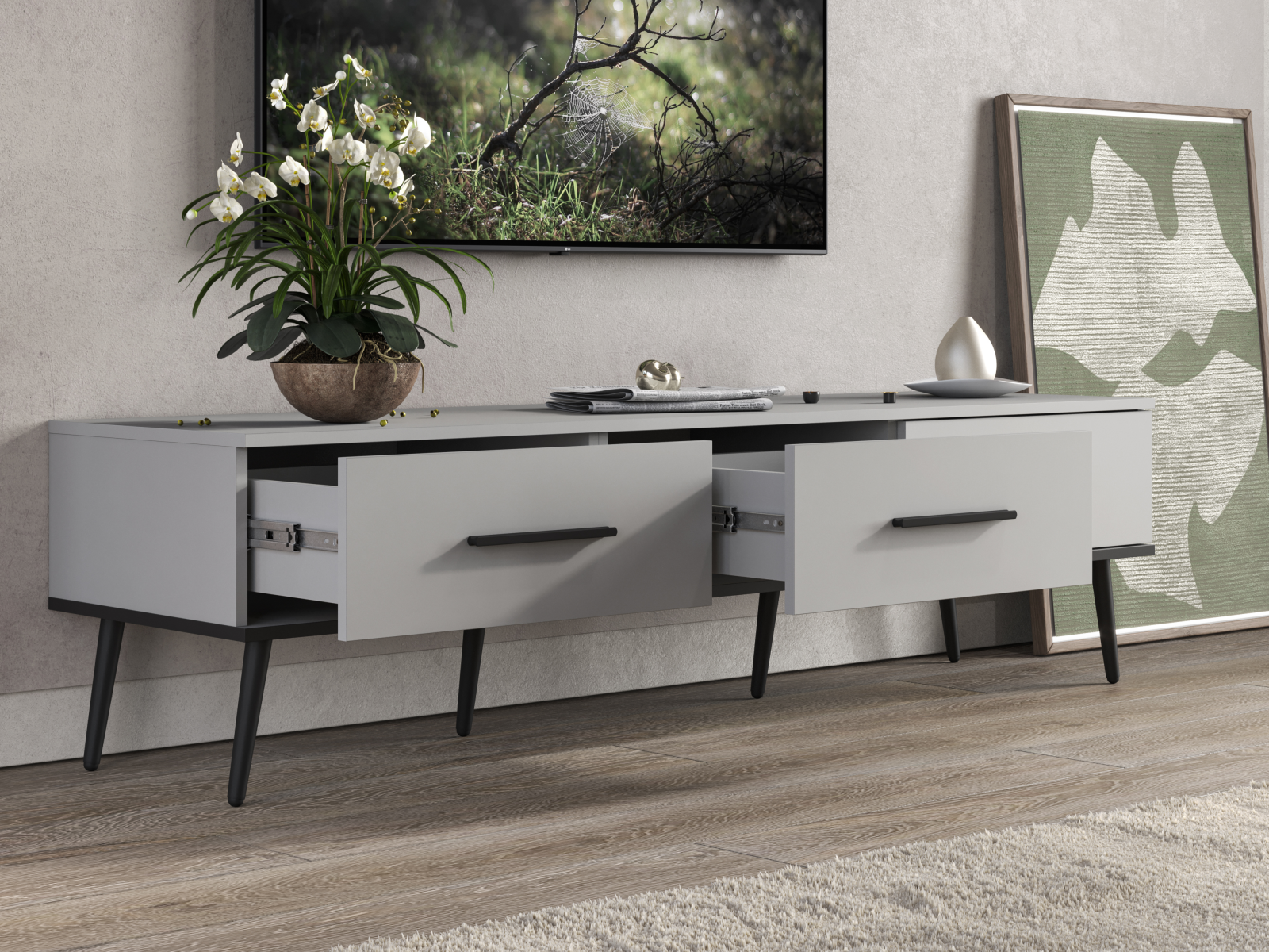 Тумба изготовлена из высококачественного материала ЛДСП в цвете Шиншила серая, что придает ей элегантный и дорогой вид. Благодаря своим размерам - 165,2х44х45 (ШхВхГ), тумба обладает достаточной вместительностью для размещения различных мультимедийных устройств и аксессуаров, таких как приставки, роутеры, игровые консоли и многое другое.