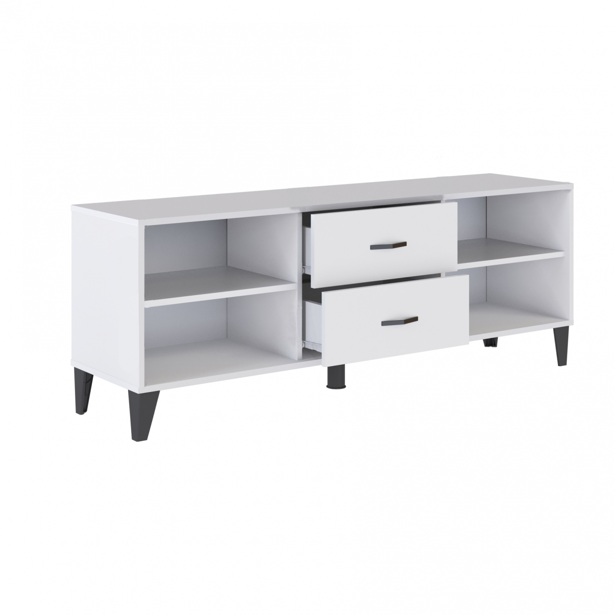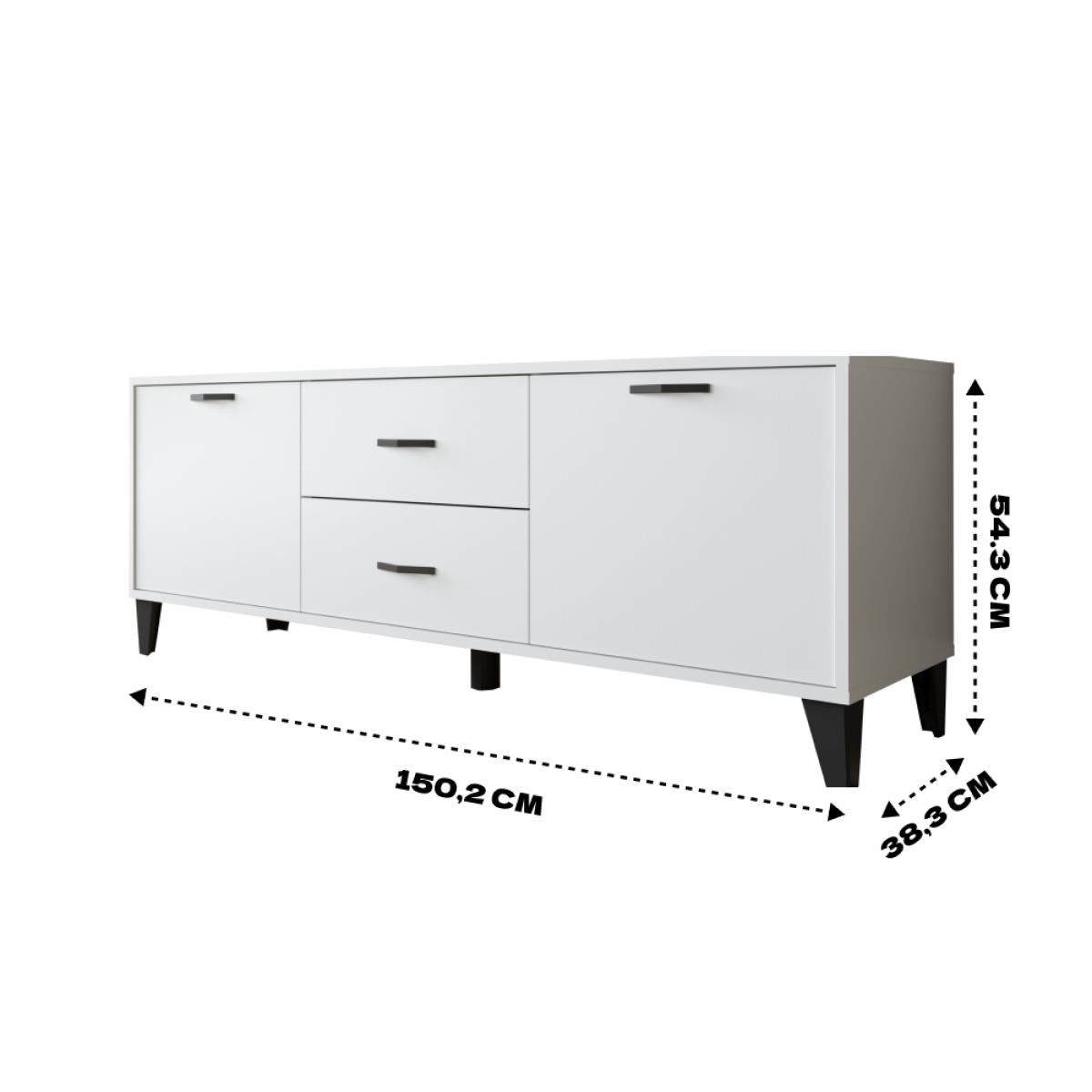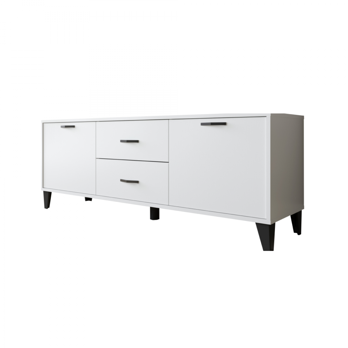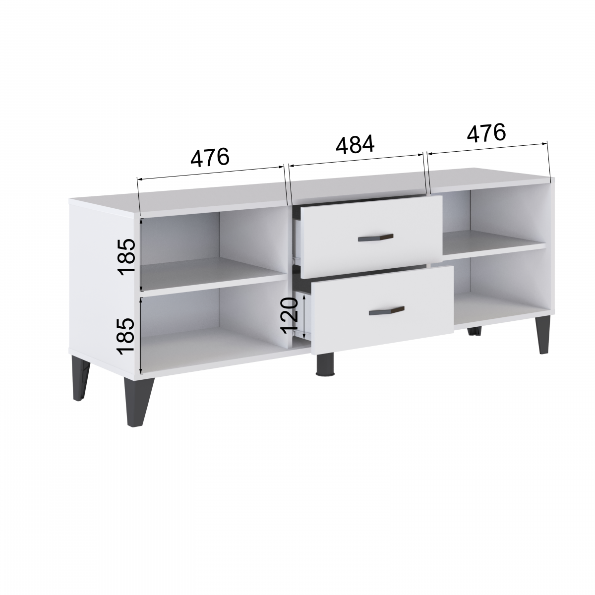 Тумба ТВМ-6 под ТВ выполнена в белых оттенках, имеет 2 распашные дверки и 2 выдвижных ящика. Тумба позволяет хранить различные аксессуары, кабели, документы внутри ящиков и за дверками, что помогает сохранять визуальную чистоту и порядок в гостиной комнате. Тумба выполнена из качественного и прочного материала - ЛДСП от «Kronospan». Тумба ТВМ-6 оснощена пластиковыми опорами 125 мм в черном цвете. Выдвижные ящики оснащены роликовыми направляющими, направляющие металлические, роликовые «Gelony» / «Marshall, петли без доводчика «Gelony» / «Marshall» / «Brilon». Также тумба оснащена лицевой фурнитурой - металлические ручки, черного цвета. Максимальная распределенная нагрузка на верхнюю крышку тумбы - не более 15 кг. Инструкция и вся необходимая фурнитура предусмотрена в комплекте.