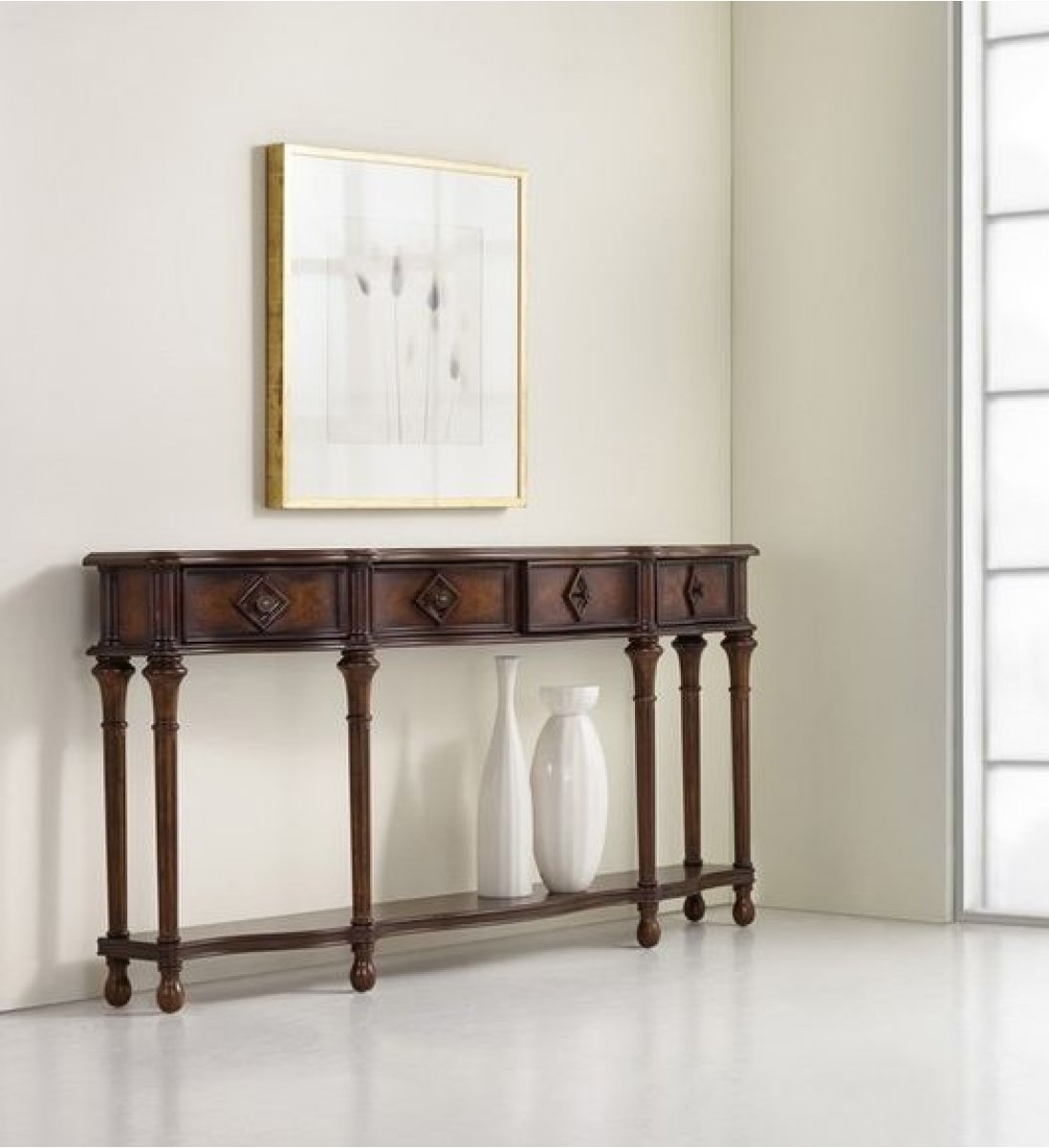Консоль GLAMUR с поразительным классическим дизайном создает уютную атмосферу в любом помещении, изготовленная из шпона вишни и каштана с отделкой из темного дерева. Консоль с 4 выдвижными ящиками отличается стильным дизайном при компактных размерах. Длинный, узкий силуэт этого предмета с его изящной формой делает его образцом для узкого фойе. Он имеет четыре ящика и точеные ножки, соединенные фигурной полкой.