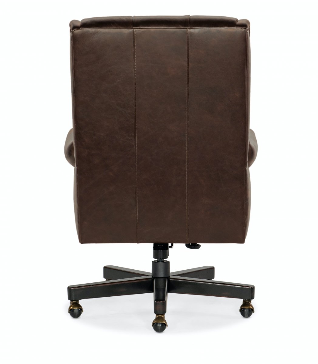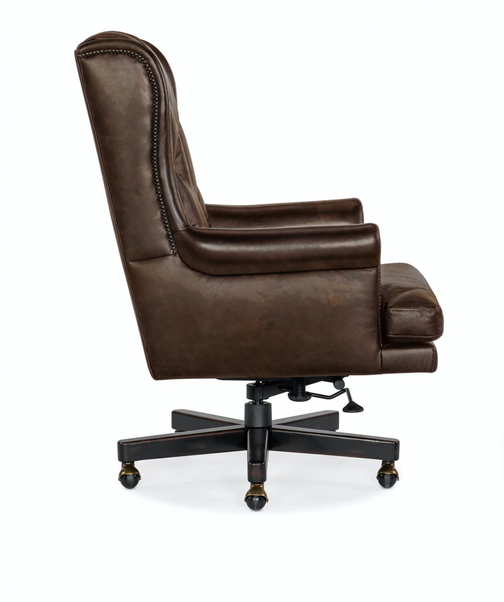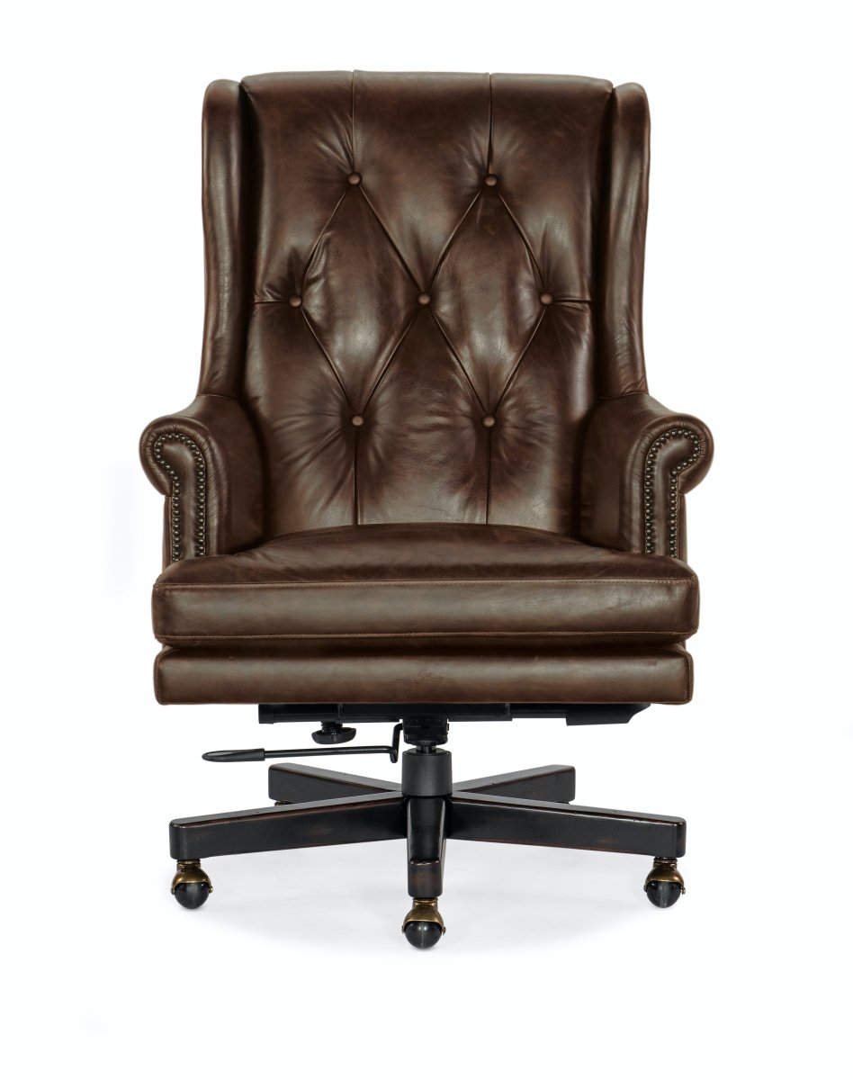 Чудесное офисное кресло, выполненное в классическом традиционном стиле. Деревянная основа, выкрашенная в черный цвет, отлично сочетается с кожаной обивкой. Кресло дополнительно декорировано пуговицами на спинке и аккуратными гвоздиками. Такое кресло несомненно сумеет вписаться практически в любой интерьер и станет отличным приобретением. Оснащено роликами и поворотным механизмом.