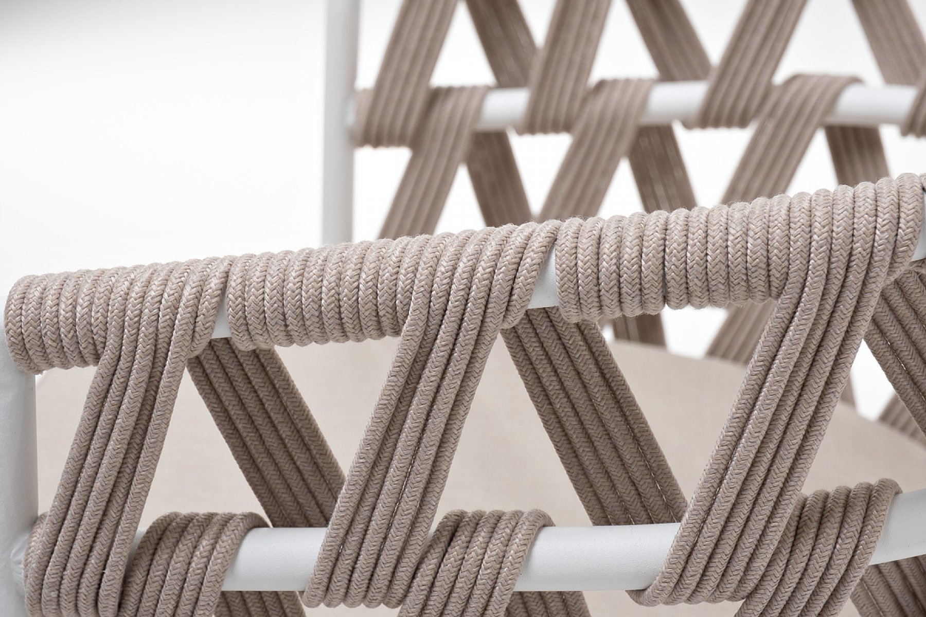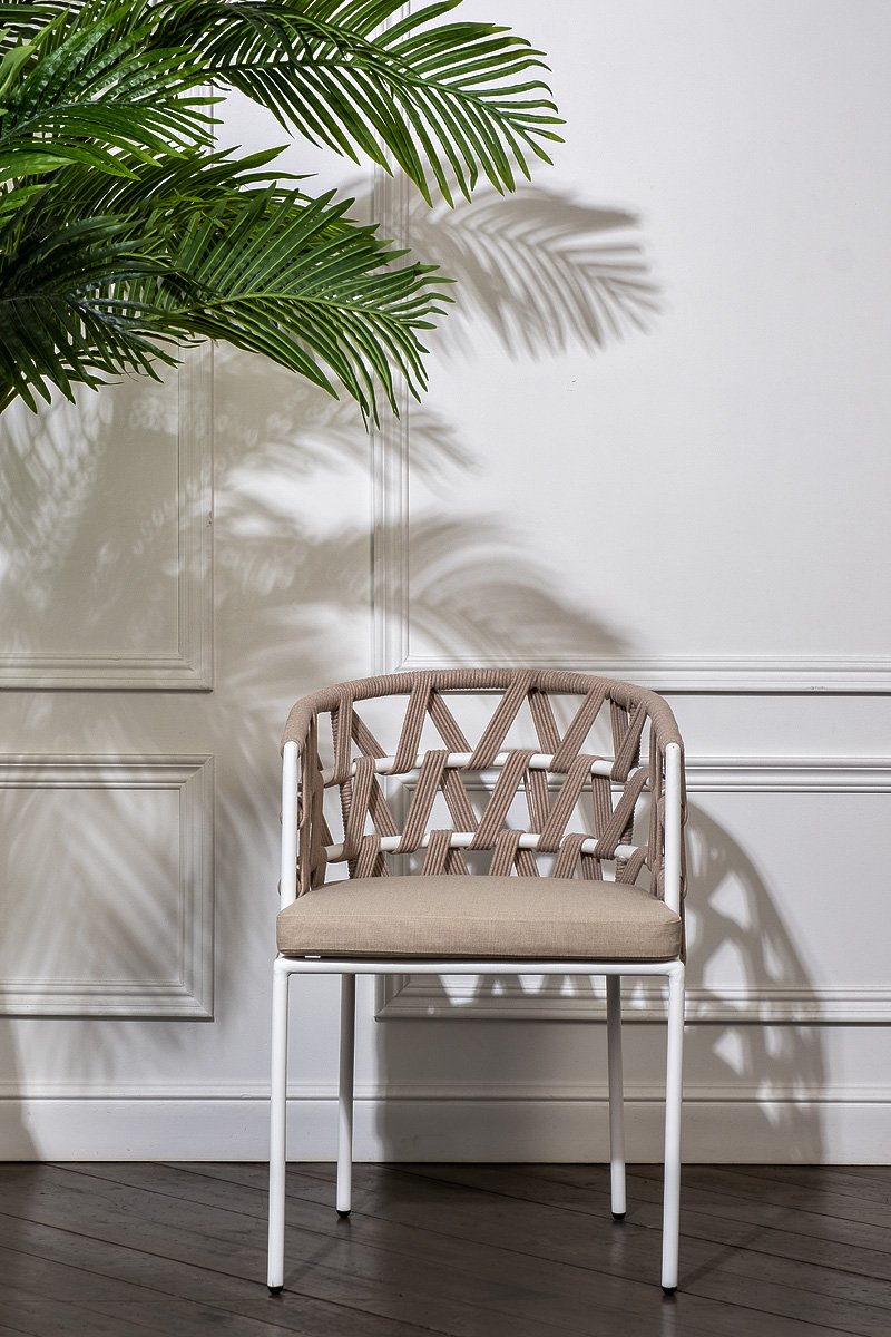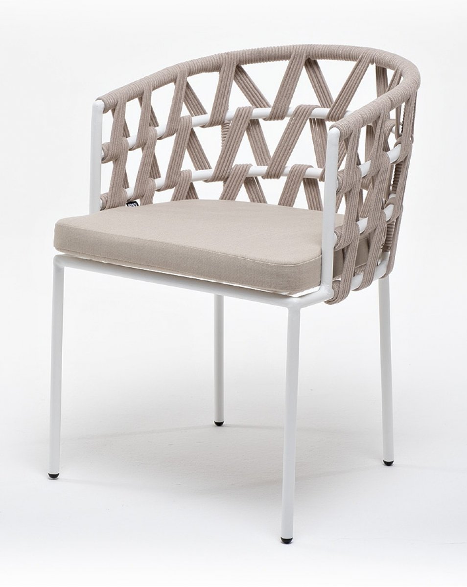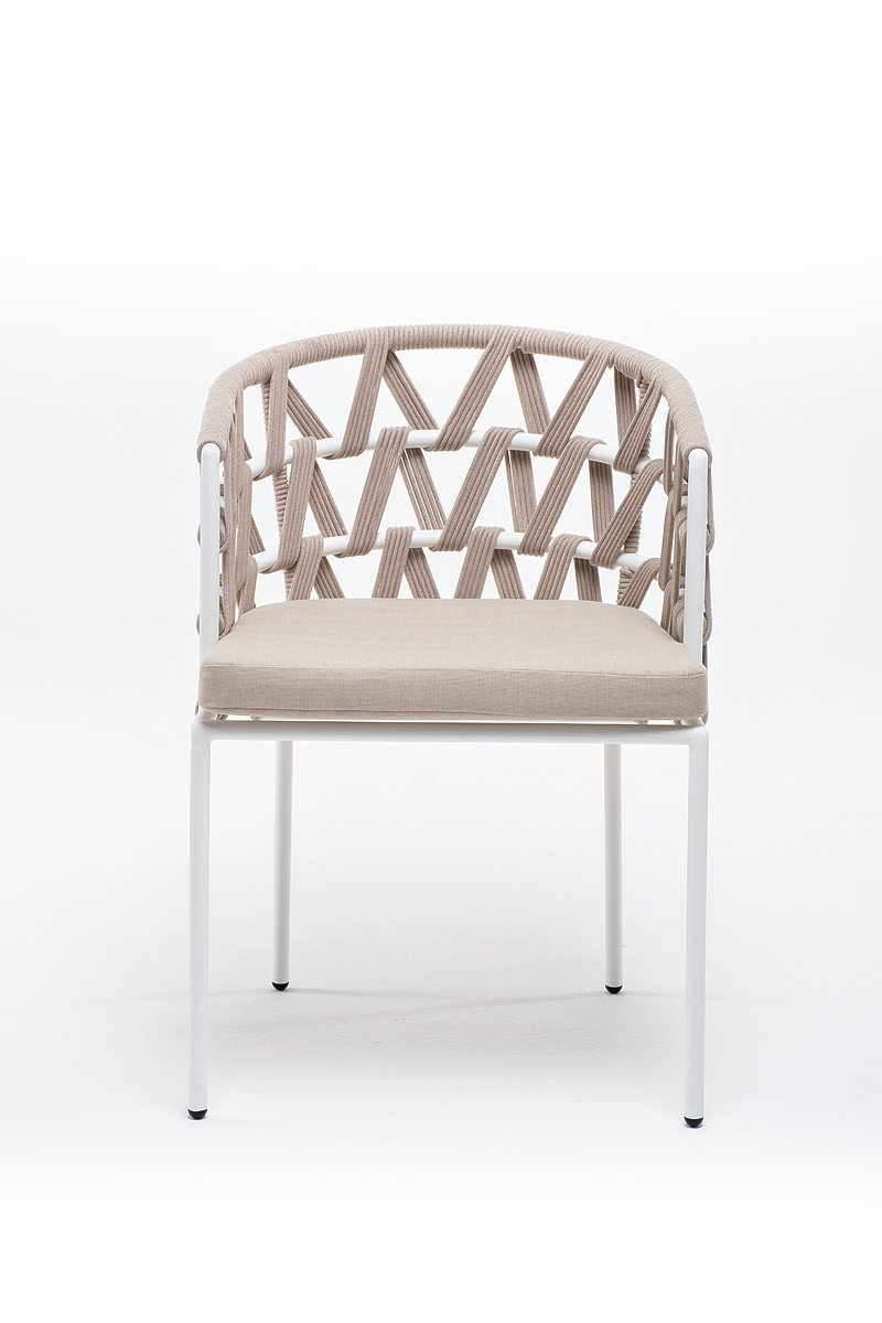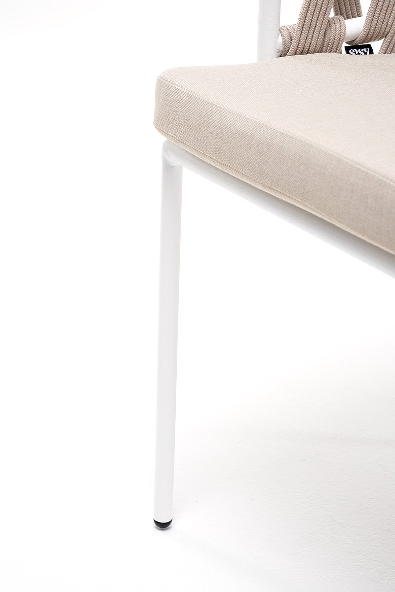 Диего стул плетеный из роупа, каркас из стали белый муар, роуп бежевый круглый, ткань бежевая 052