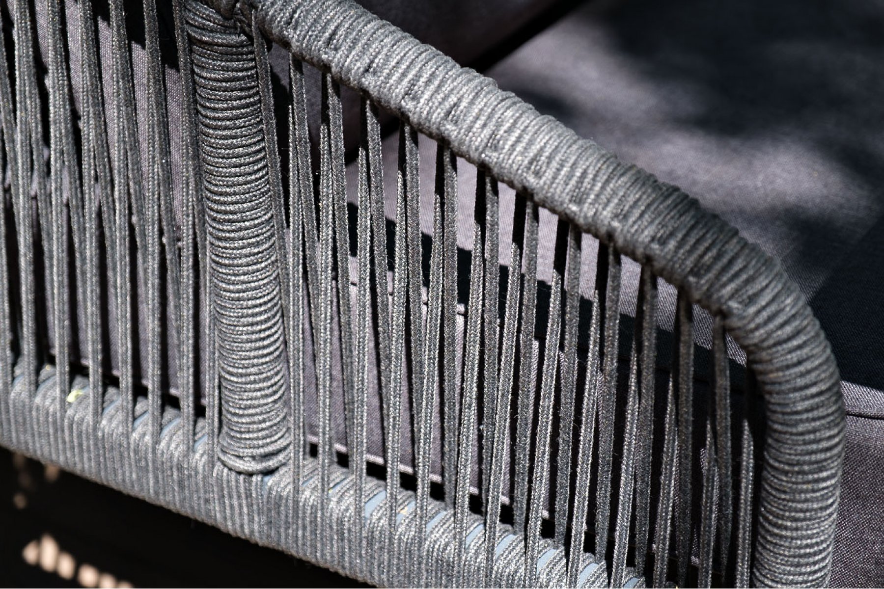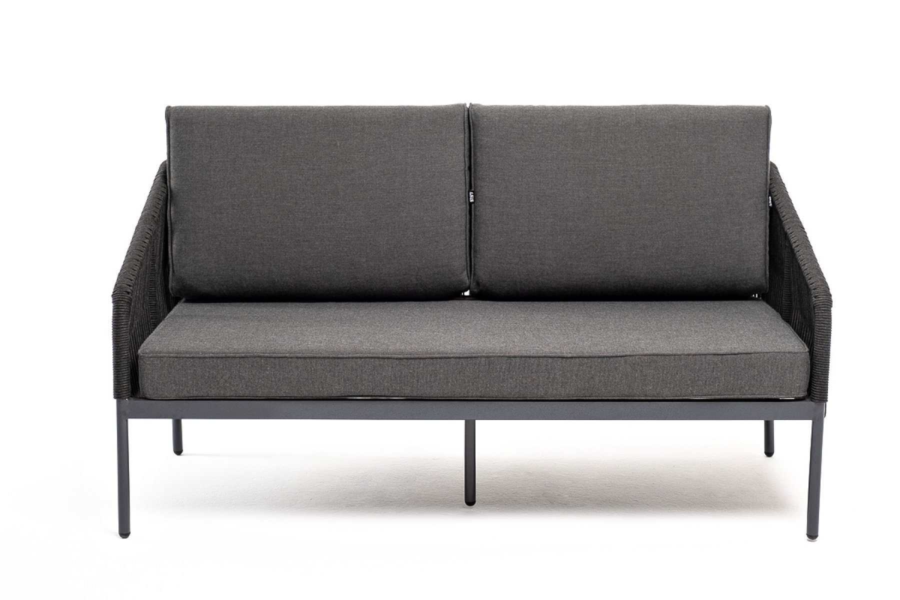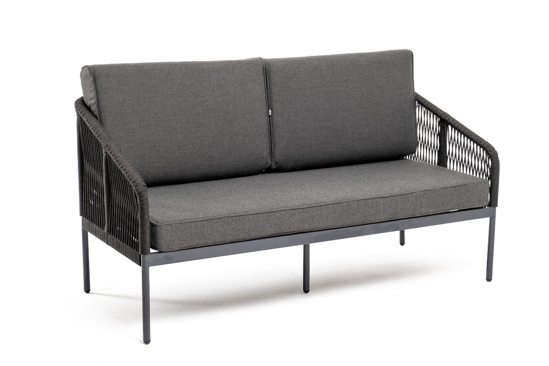 Канны диван 2-местный плетеный из роупа, каркас алюминий темно-серый (RAL7024) муар, роуп темно-серый круглый, ткань темно-серая 027