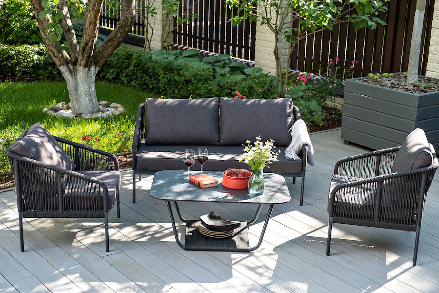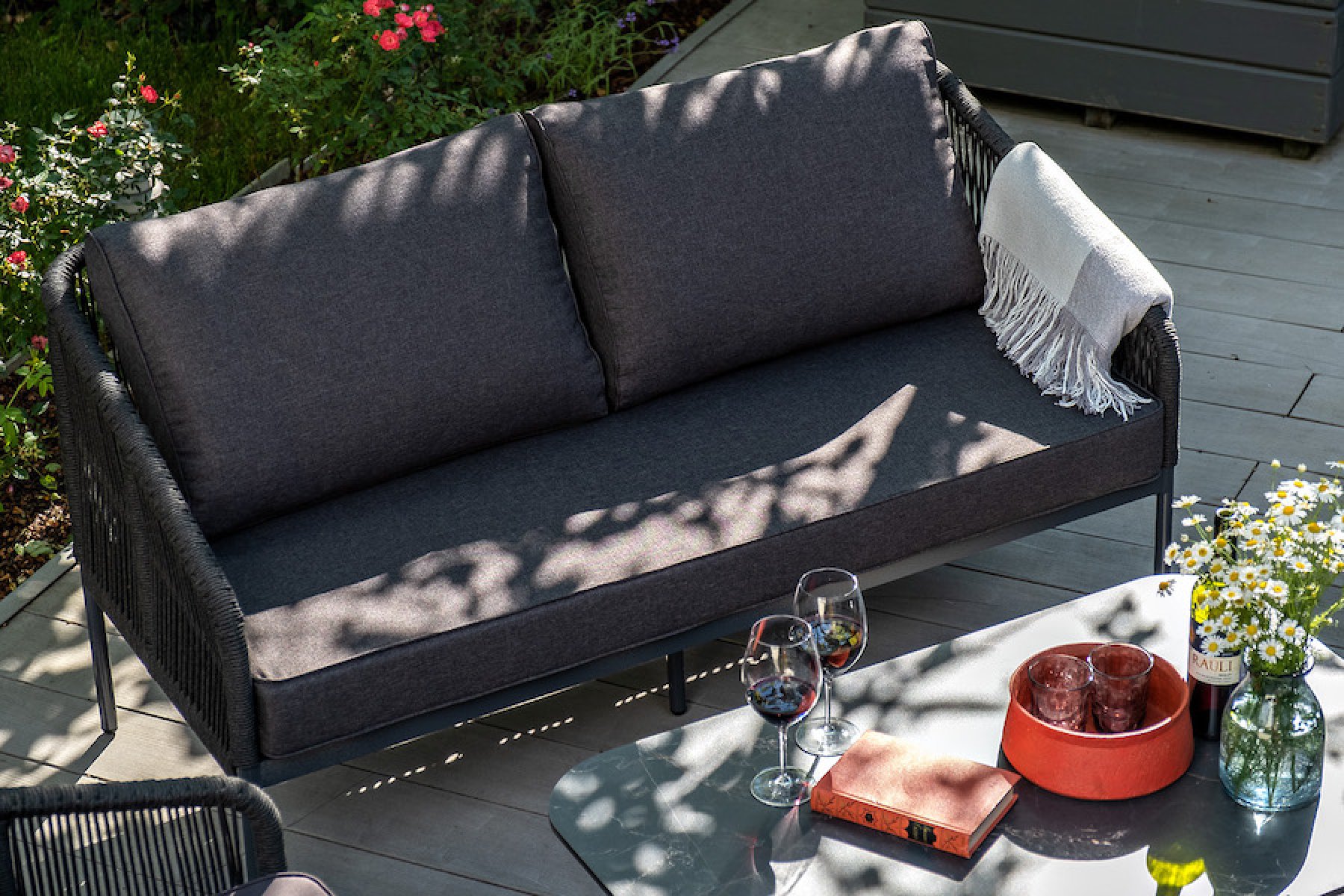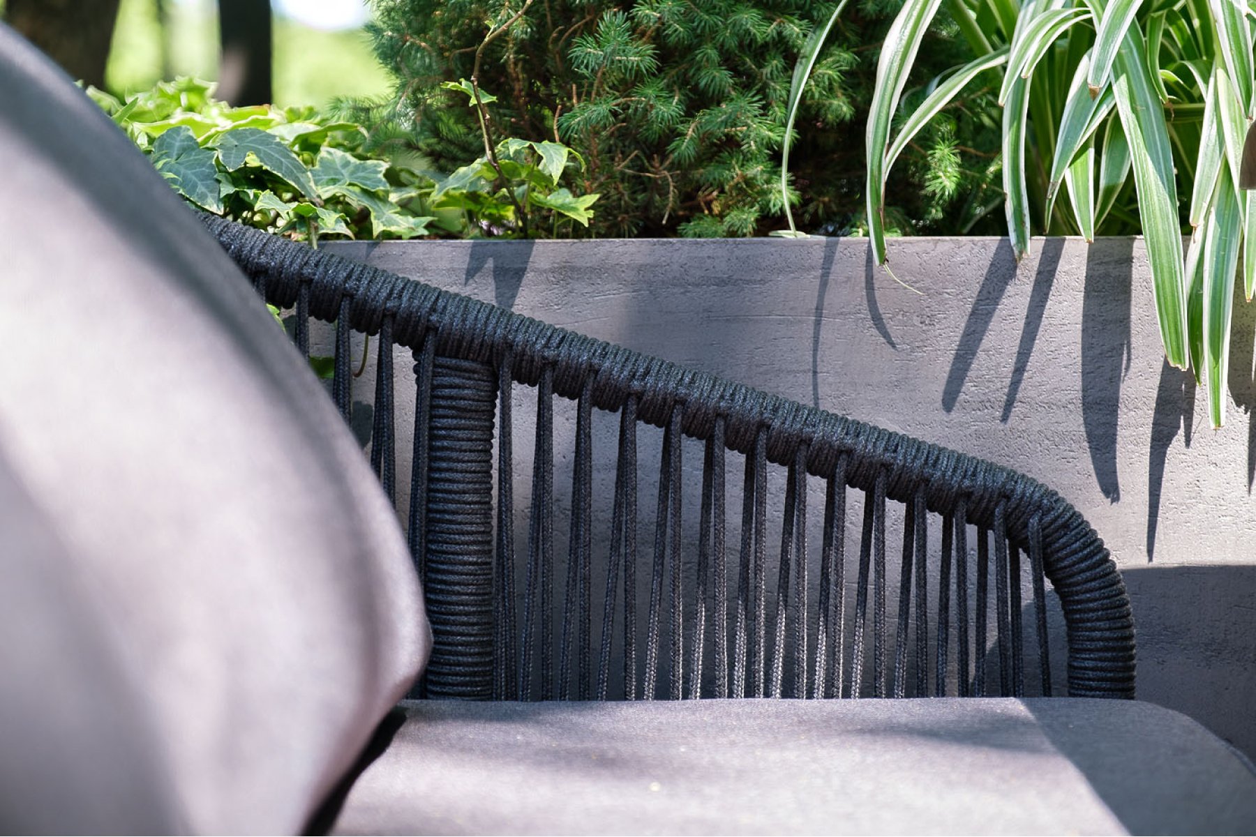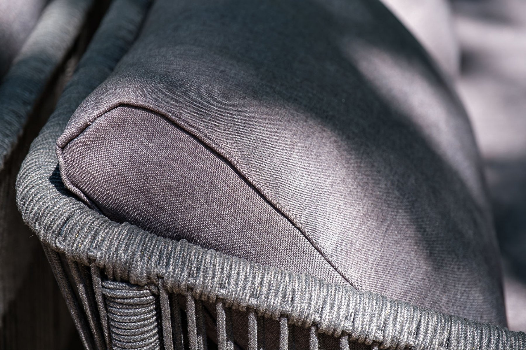 Канны диван 2-местный плетеный из роупа, каркас алюминий темно-серый (RAL7024) муар, роуп темно-серый круглый, ткань темно-серая 027