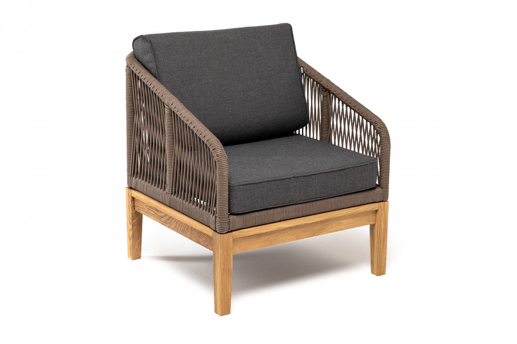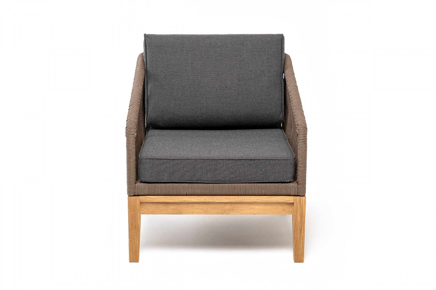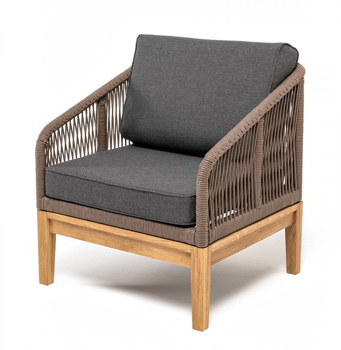 Канны кресло плетеное из роупа, основание дуб, роуп коричневый круглый, ткань темно-серая 027