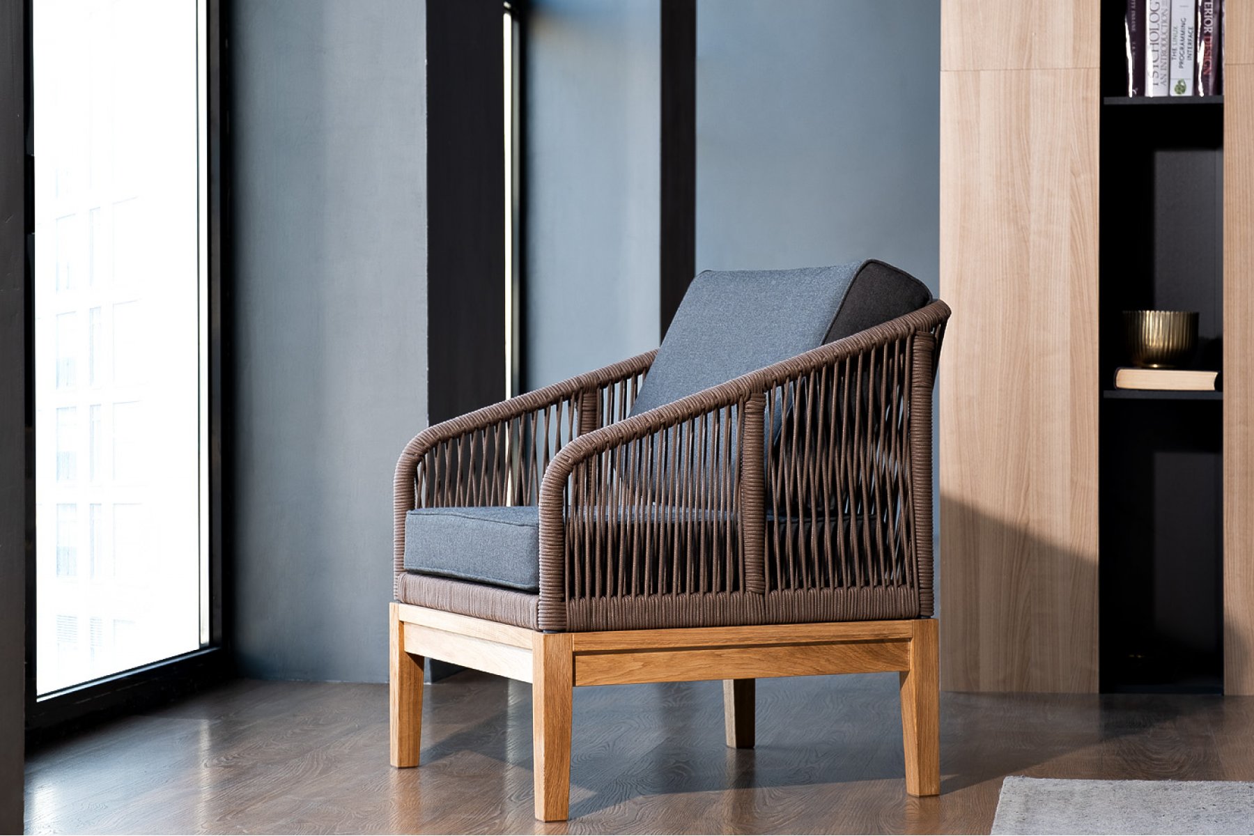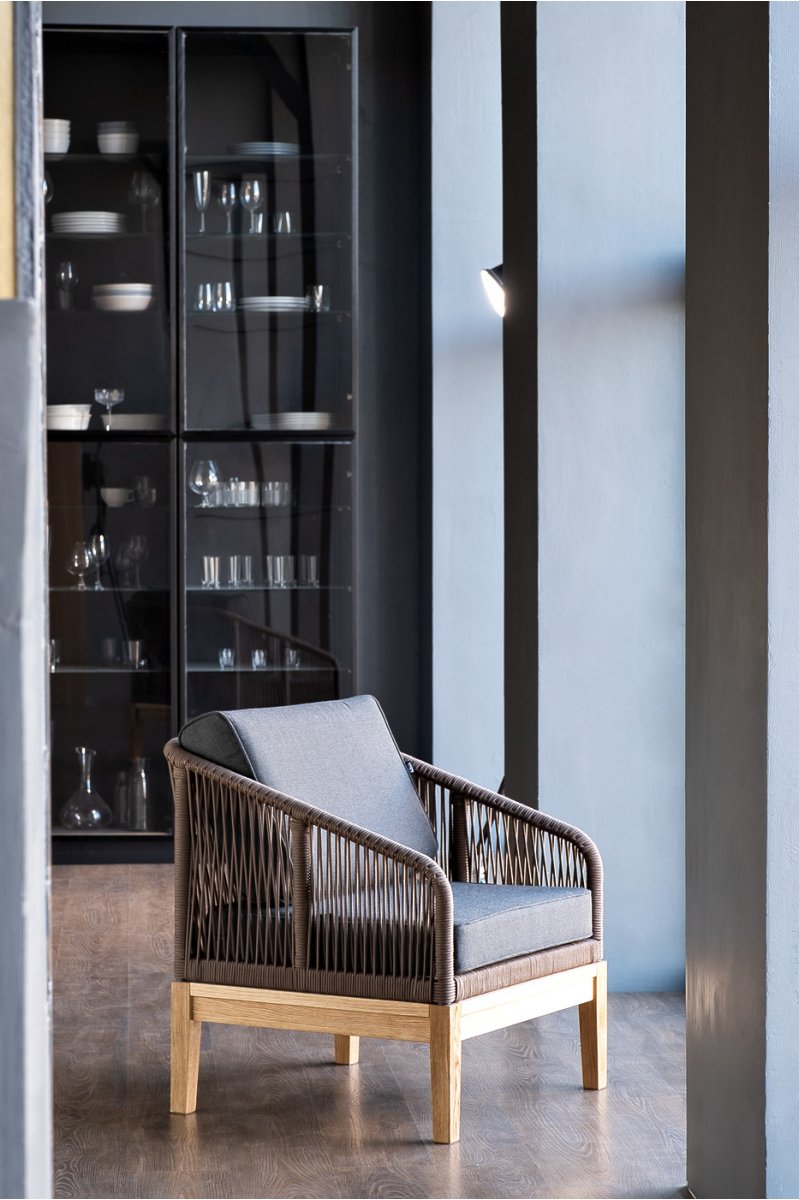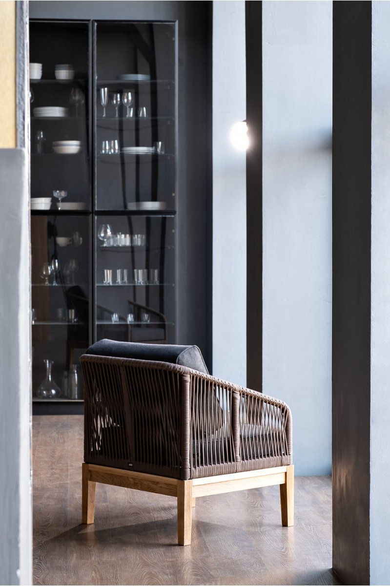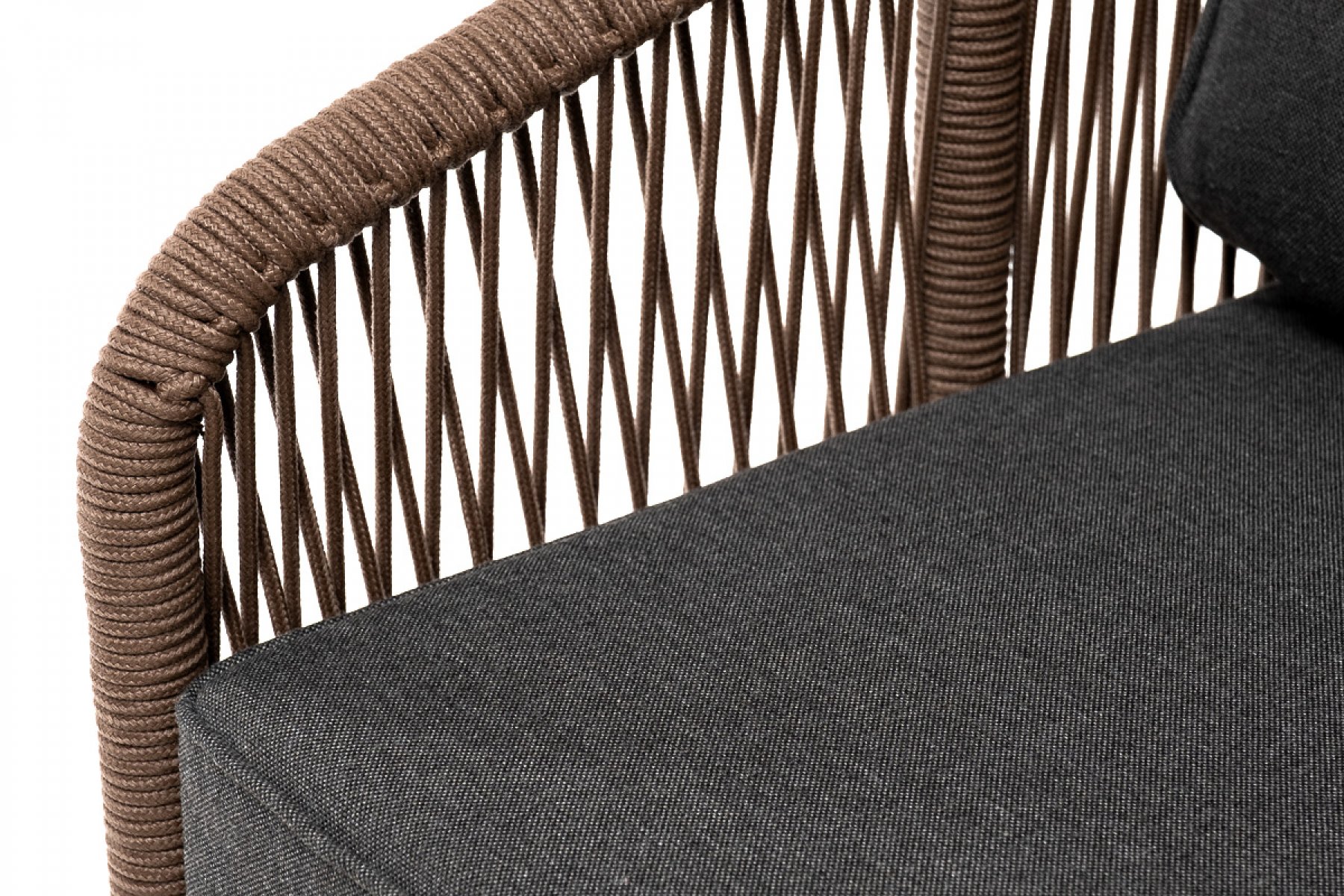 Канны кресло плетеное из роупа, основание дуб, роуп коричневый круглый, ткань темно-серая 027