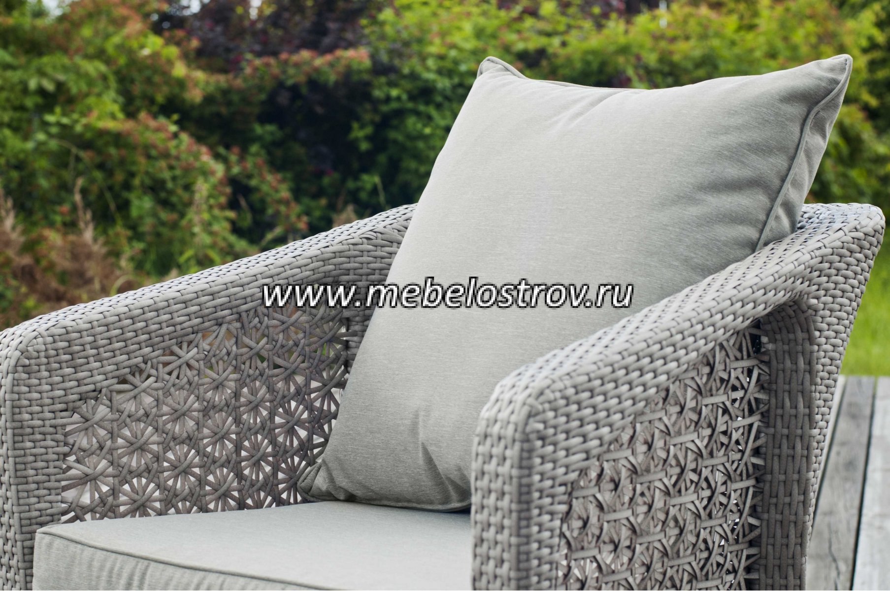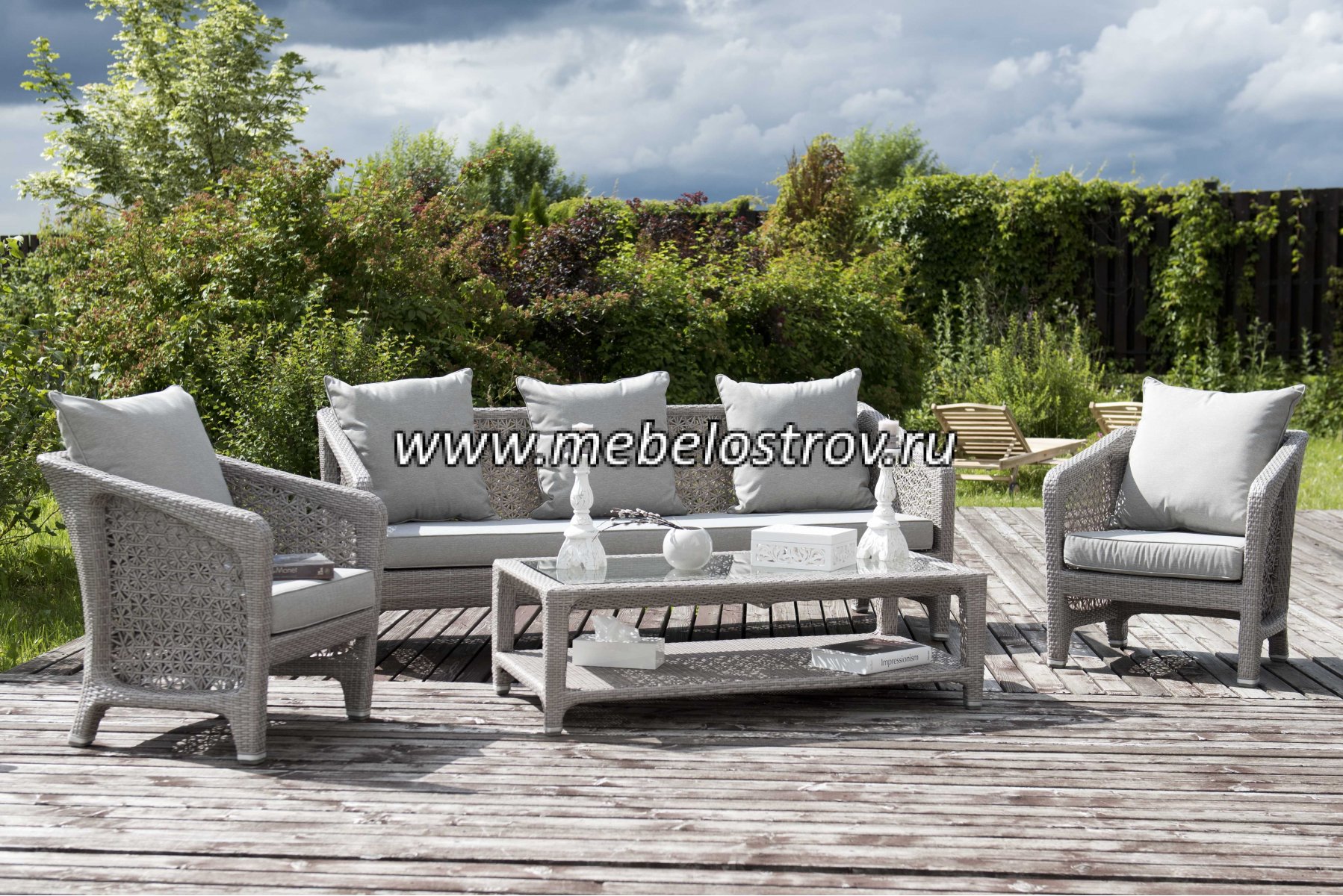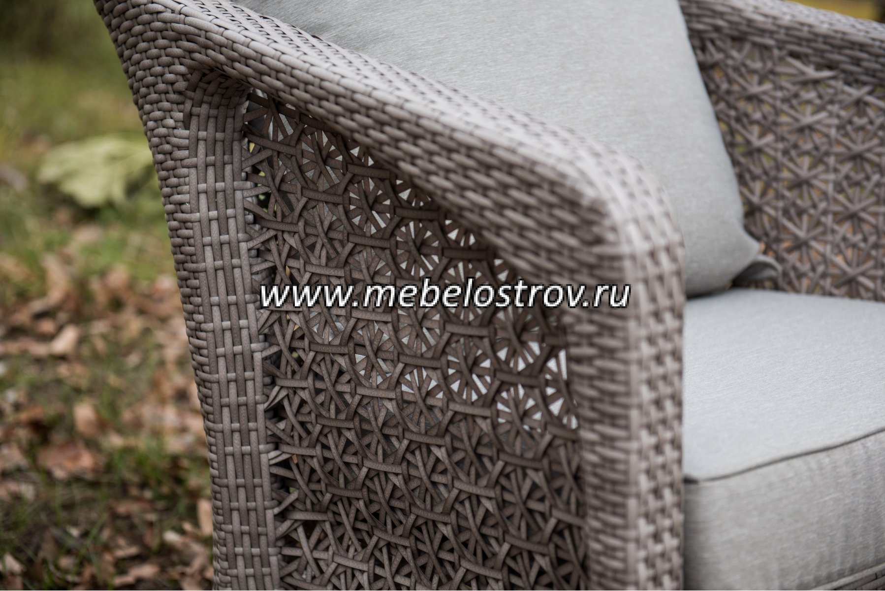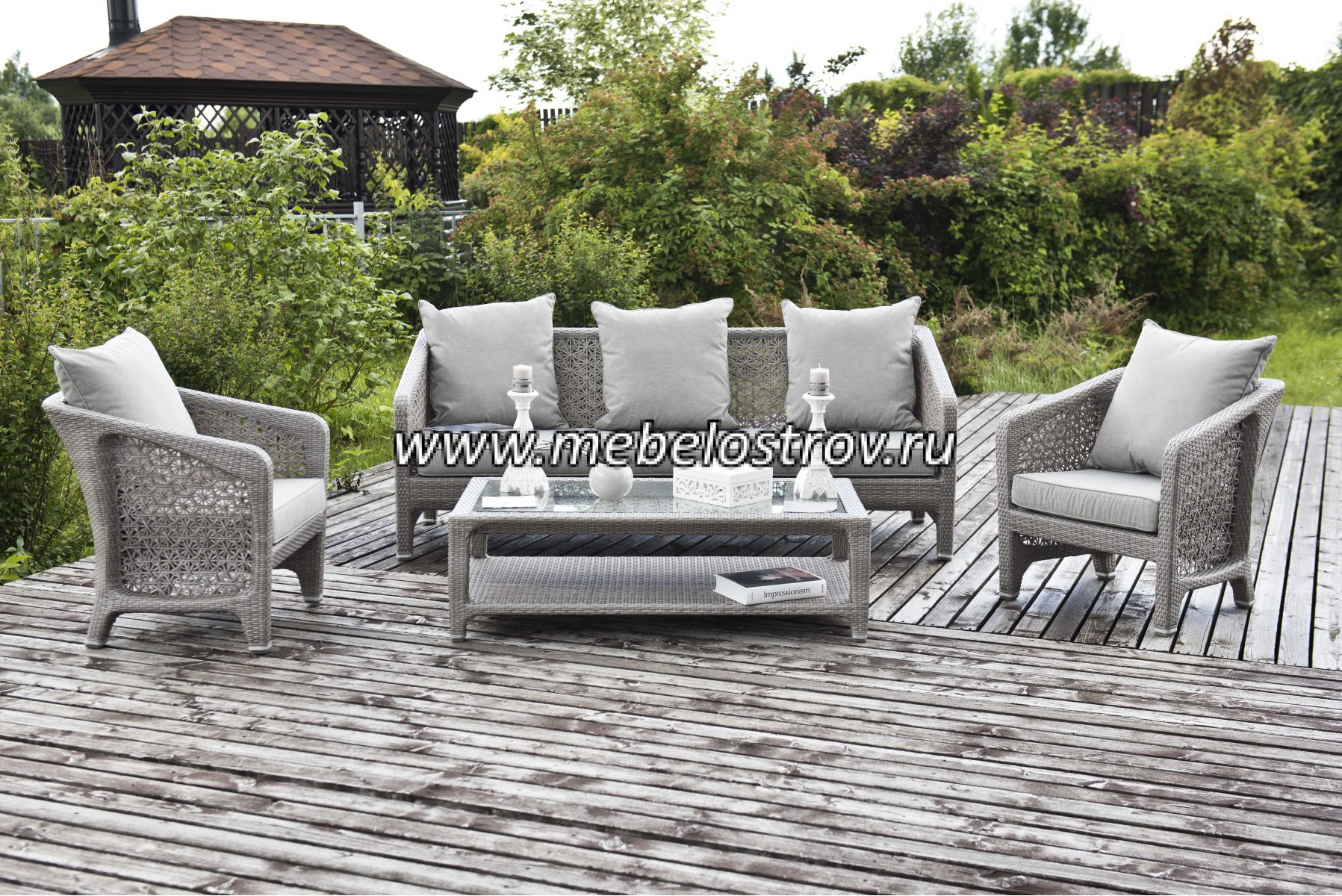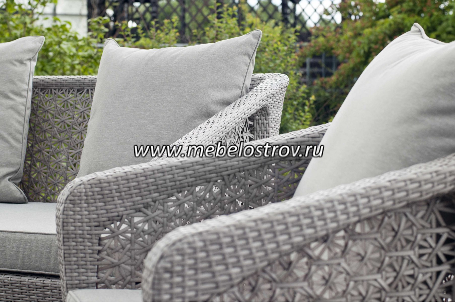 газет и журналов. Алюминиевый каркас, искусственный ротанг, ручное плетение. Диван и кресла оснащены подушками со съемными чехлами
