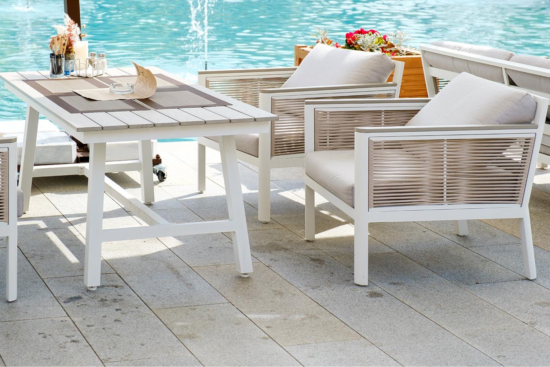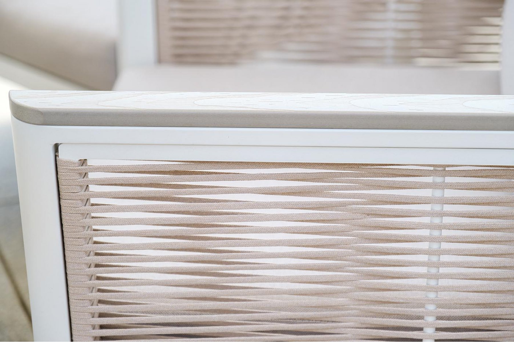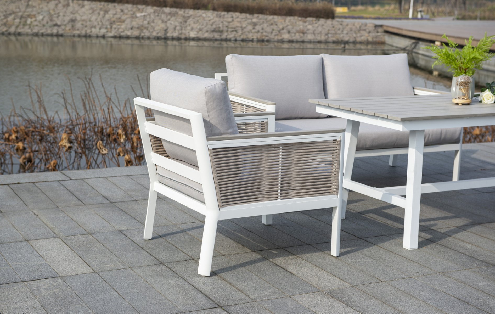 Сан Ремо кресло плетеное из роупа садовое, каркас алюминий белый, роуп бежевый, ткань бежевая