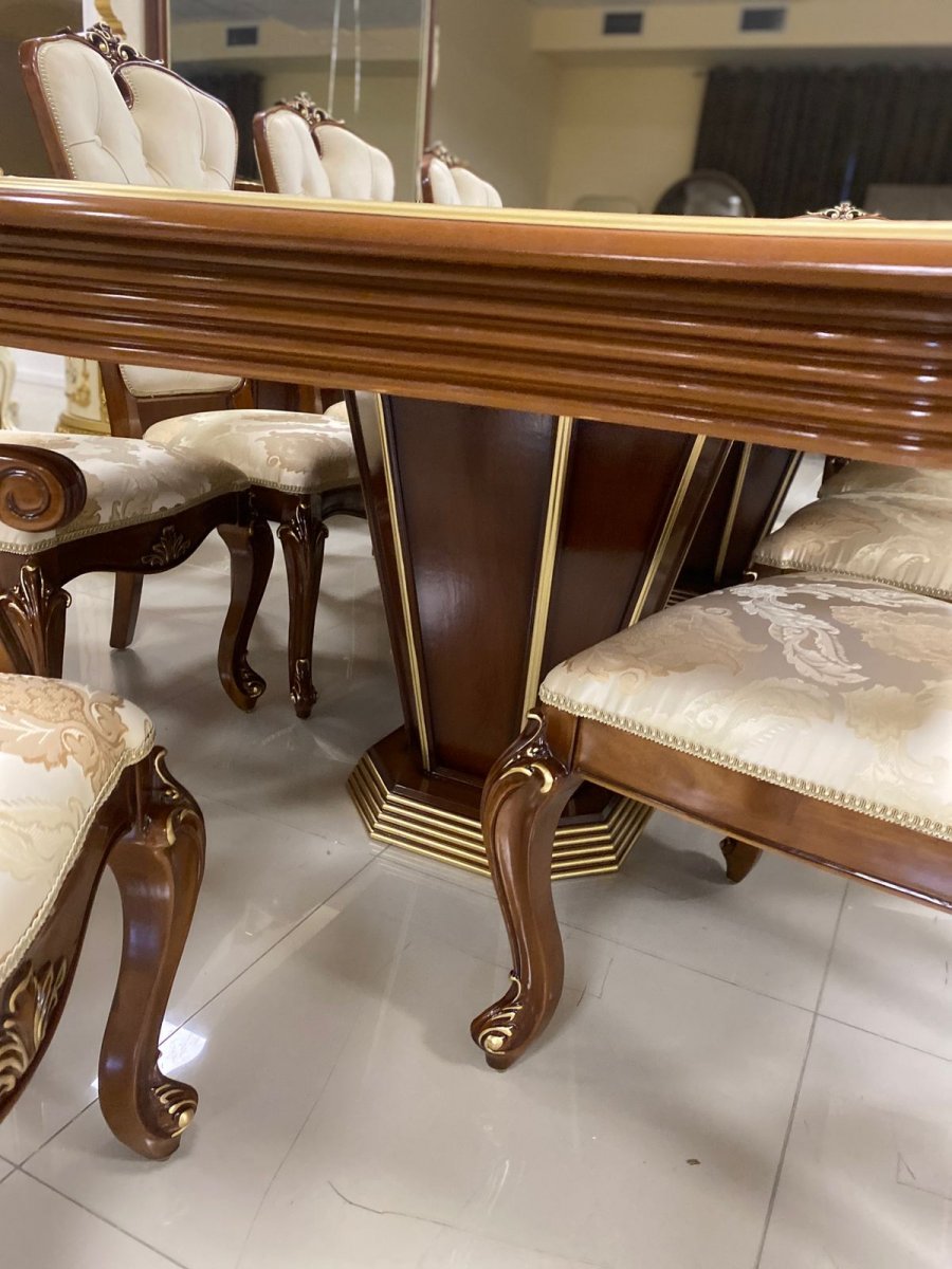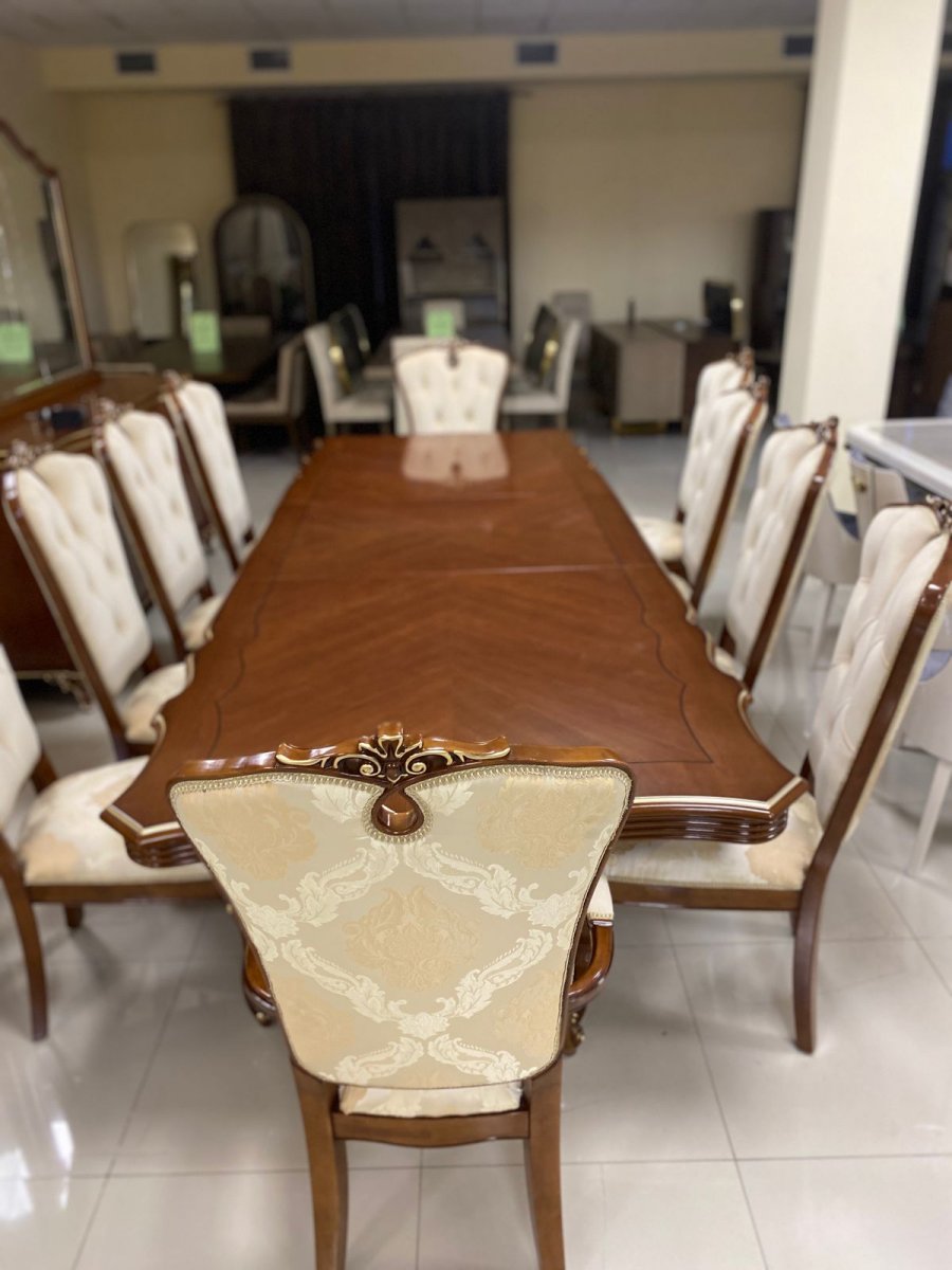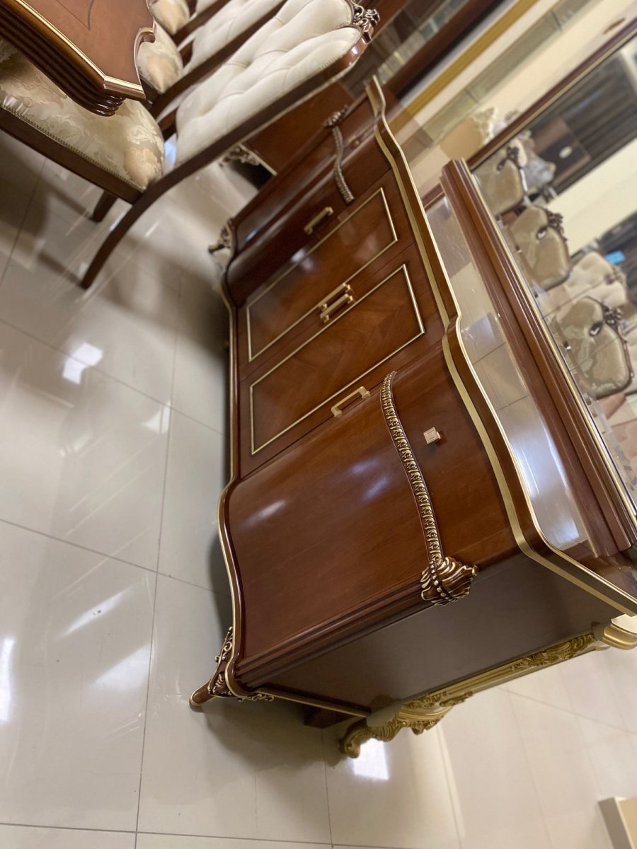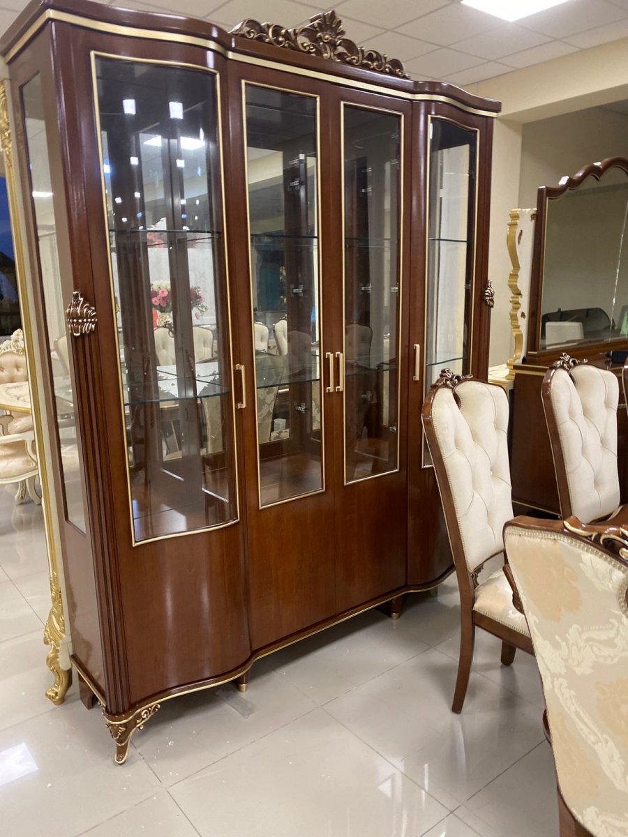 В комплект входит: Витрина 4-х дверная, комод с зеркалом, стол обеденный 2.4-3.0м, стул 8 шт, кресло 2 шт