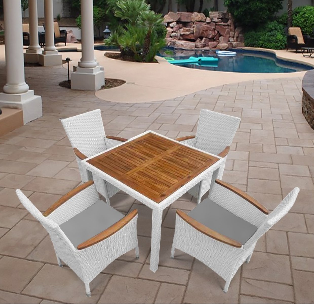 В составе комплекта: стол и 4 кресла. Первоклассная лоза из синтетического ротанга белого цвета стойкая к любым погодным проявлениям. Крепкий каркас из стали с полимерным антивандальным покрытием и отличным качеством сварки. Изделие сплетено вручную нашими мастерами под жестким контролем качества на каждом этапе производства. Лоза максимально приближена по рельефу и текстуре к естественному материалу. Подходит для использования на улице и внутри помещения в любую погоду. Не боится влаги, прямых солнечных лучей и холода. Серые подушки в комплекте с креслами.
