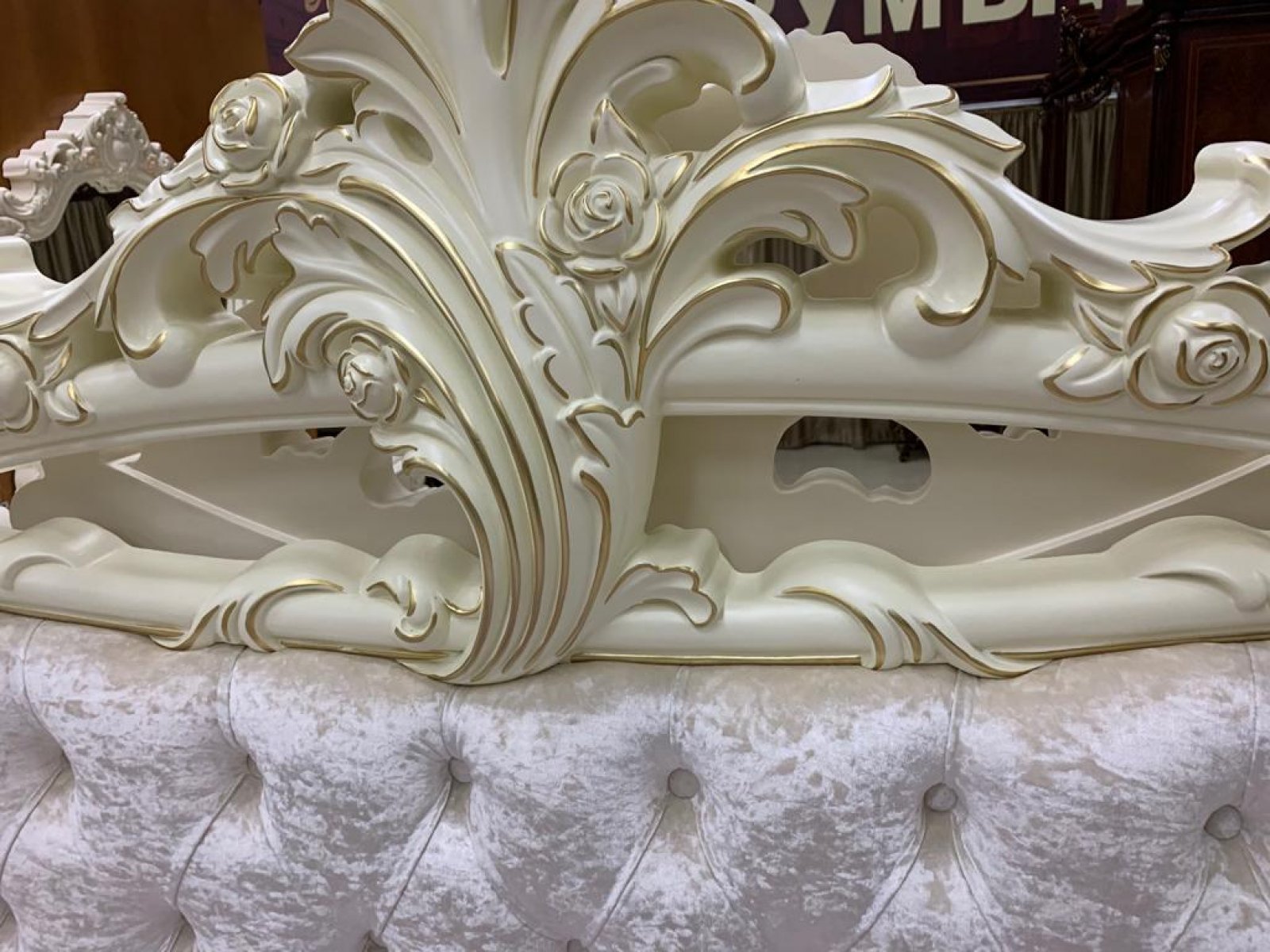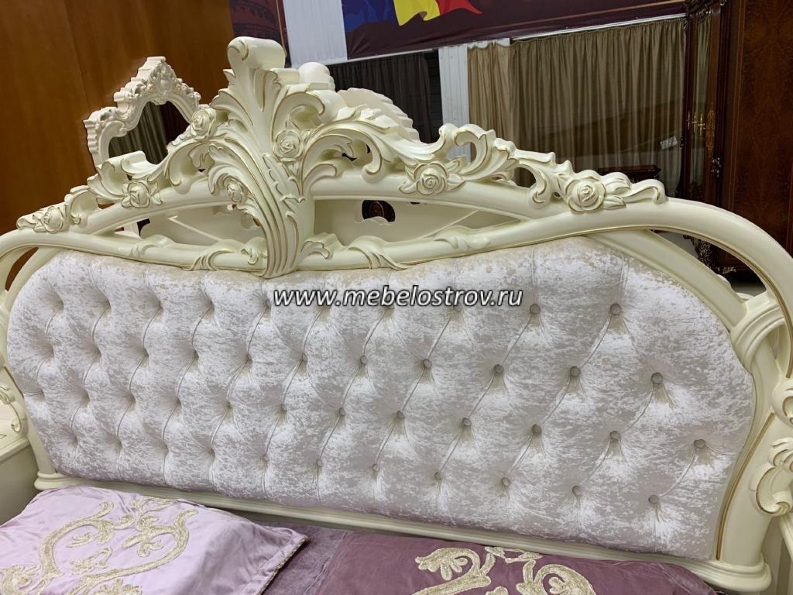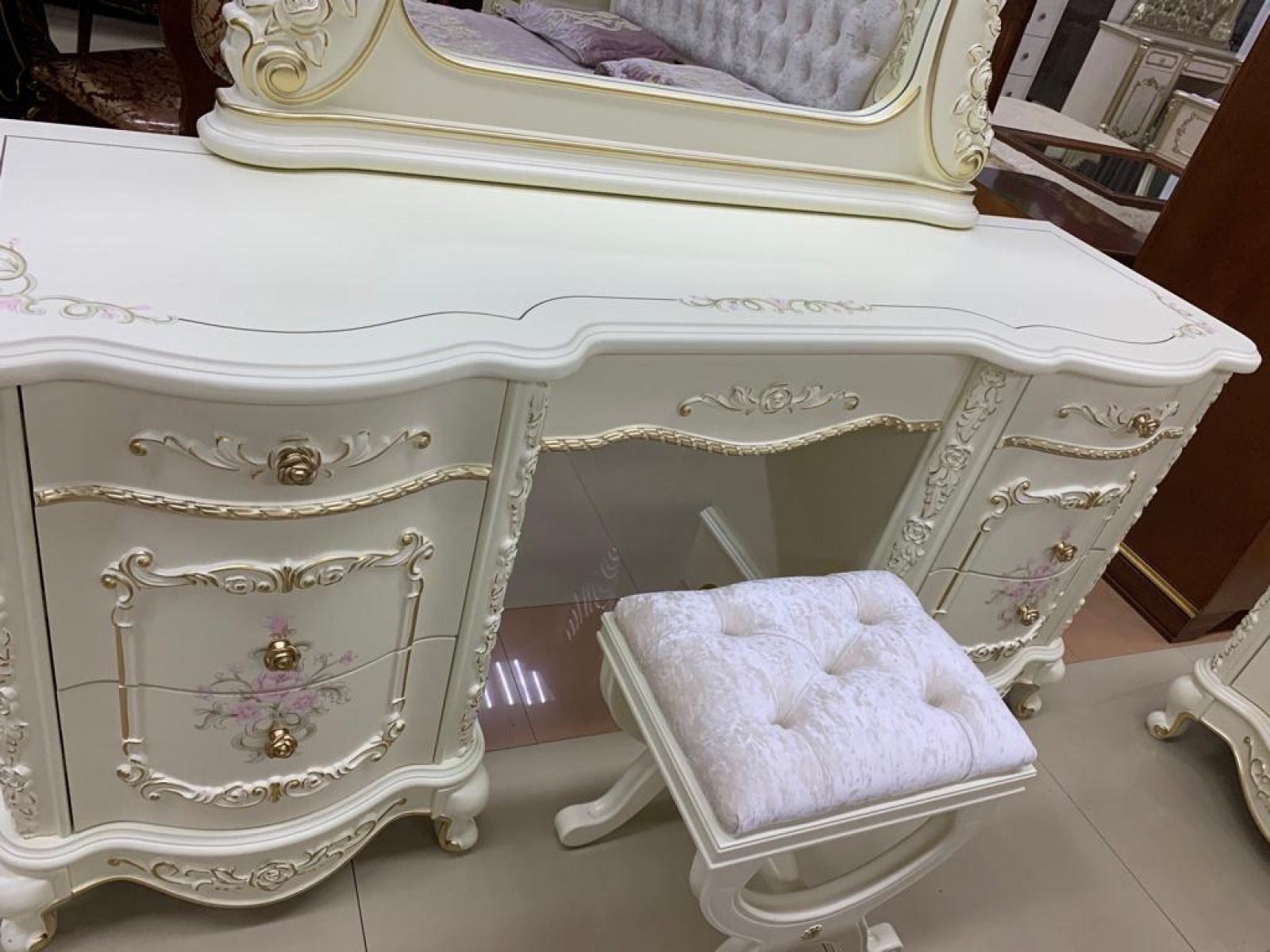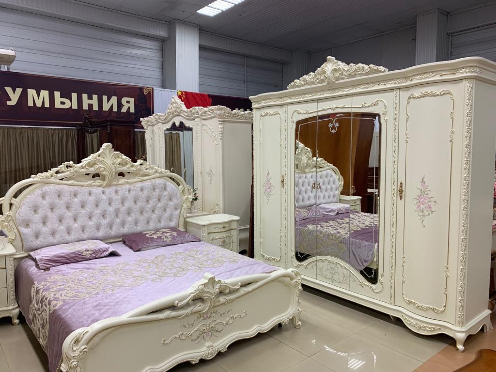 В комплект спальни входит кровать, 2 тумбы, туалетный стол с зеркалом, пуф, шкаф 5-ти дверный.