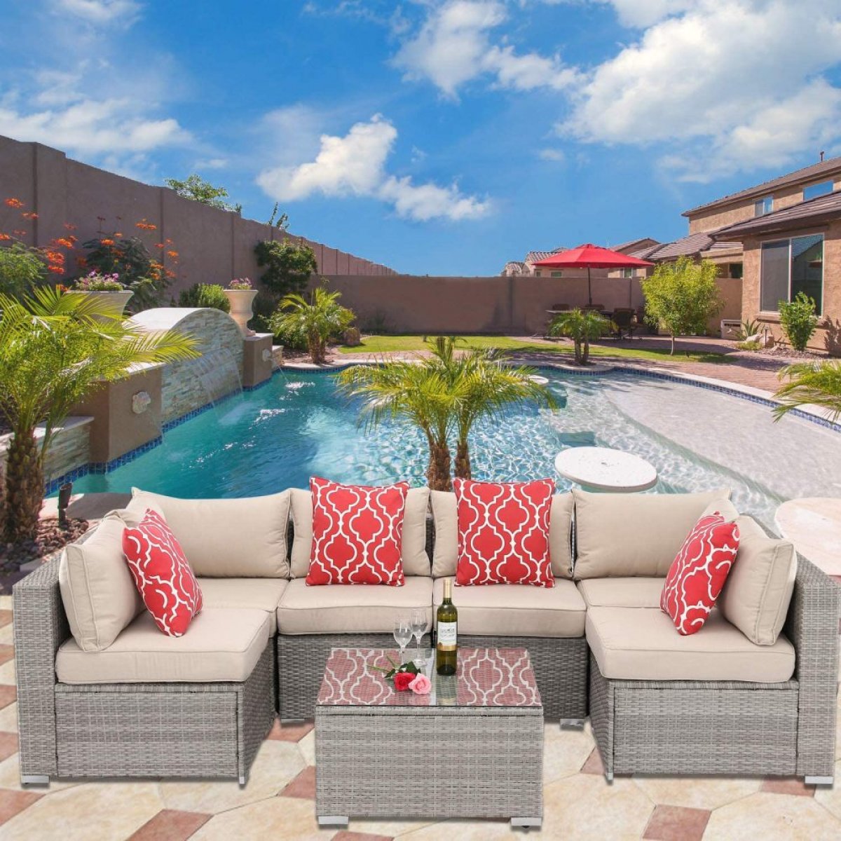 Комплект мебели состоит из: Угол (2шт.): W81xD81xH66 см., Середина (4 шт.): W62xD81xH66 см., Стол: L68xW75xH36 см. Стекло: закаленное-5мм. Каркас: сталь. Материал: искусственный ротанг серого цвета. Подушки для сидения (10см. ) в комплекте бежевого цвета. Оттенки на фото и дизайн подушек могут отличаться от образца.