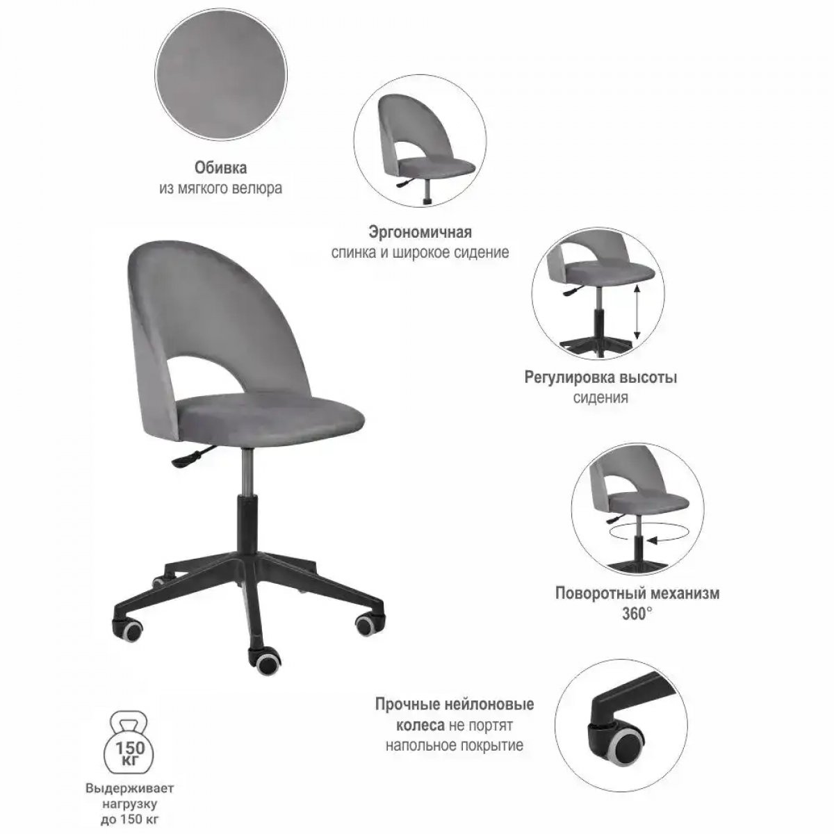 | Спецификация: | Мягкий компьютерный стул на пятилучье. Обивка из износостойкого мебельного велюра устойчива к истиранию. Размер: 49x52x78-88см Глубина сиденья 44 см. Высота сиденья 42-52 см. Диаметр крестовины 60 см. Вес стула 7 кг. Максимальная нагрузка 120 кг. Поставляется в разобранном виде. |