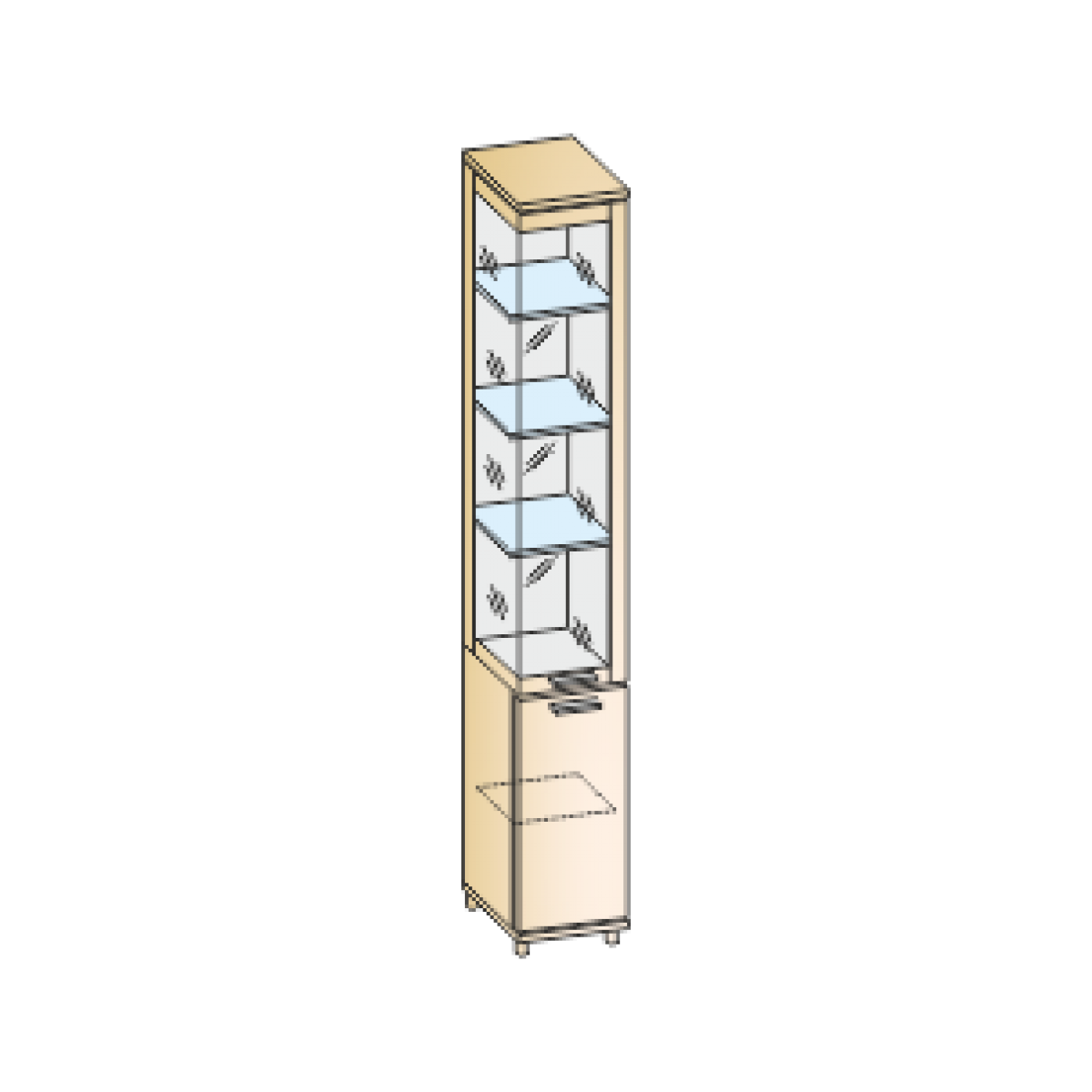 Интересная дизайнерская разработка со стеклянным фасадом и стеклянной боковой стенкой у витрин и антресольных секций стильно выделит интерьер уникальной композицией, а также позволит создавать уникальные буфетные варианты.