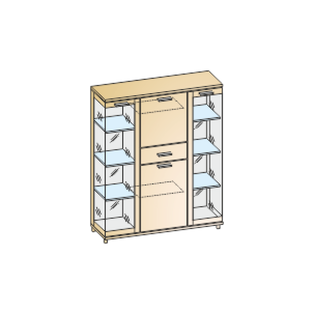 Интересная дизайнерская разработка со стеклянным фасадом и стеклянной боковой стенкой у витрин и антресольных секций стильно выделит интерьер уникальной композицией, а также позволит создавать уникальные буфетные варианты.
