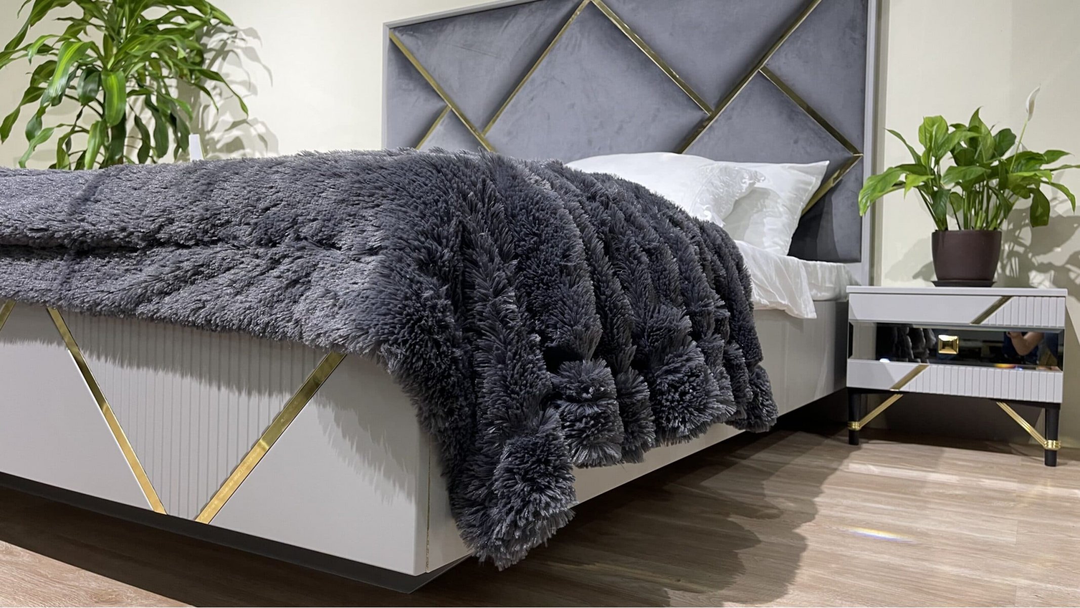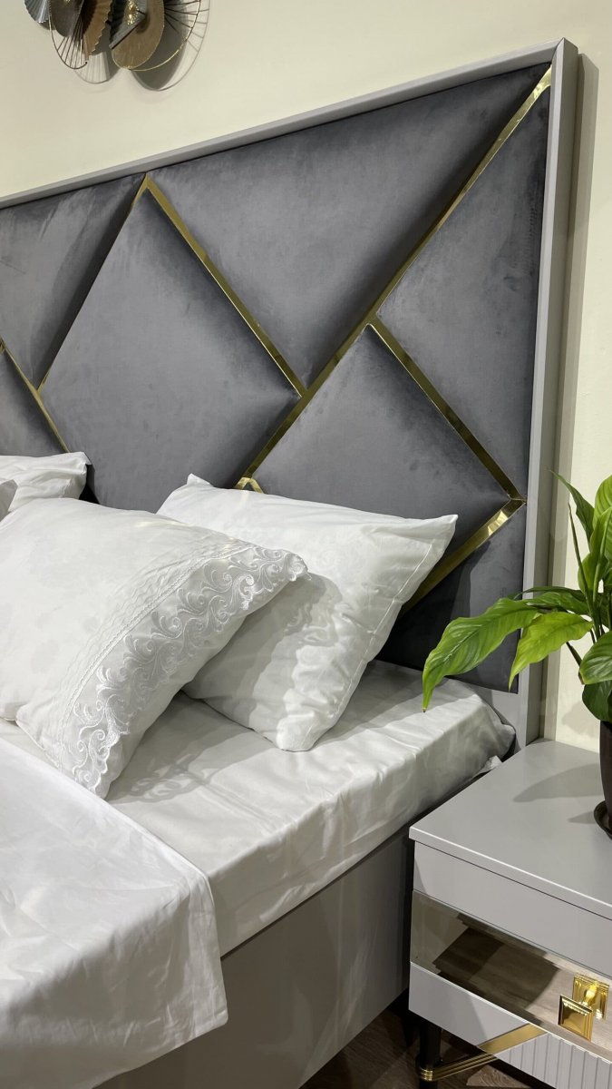 Изголовье кровати: мягкое основание микровелюр темно-серого или бежево-серебристого цвета