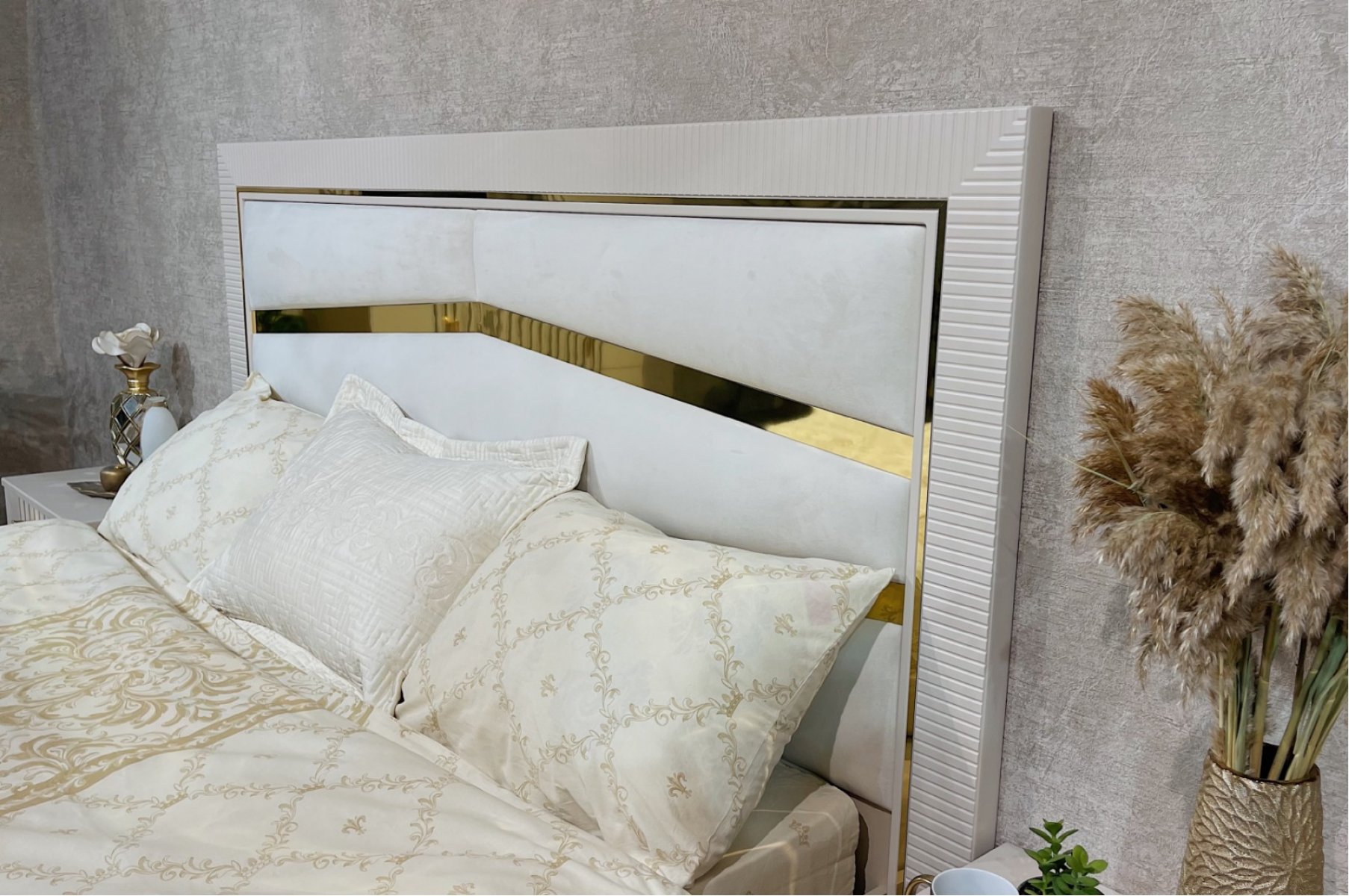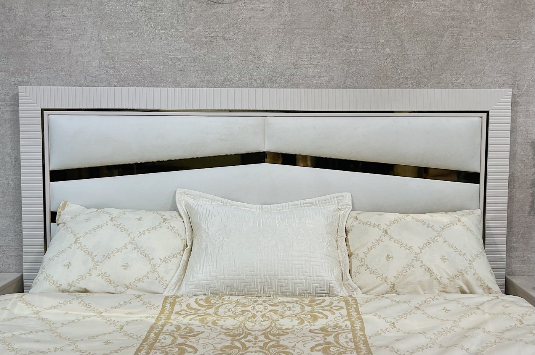 Изголовье кровати: мягкое основание микровелюр светло-бежевого цвета