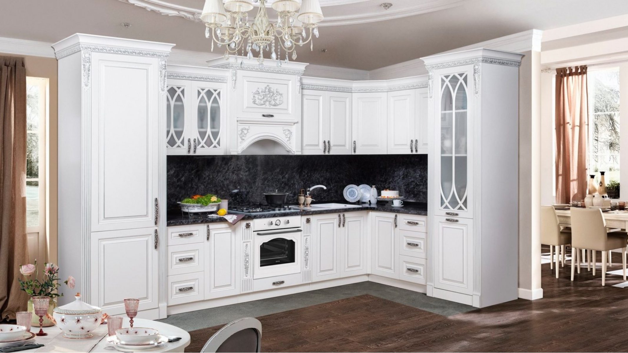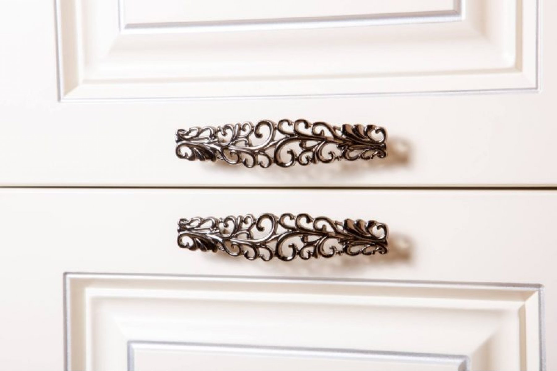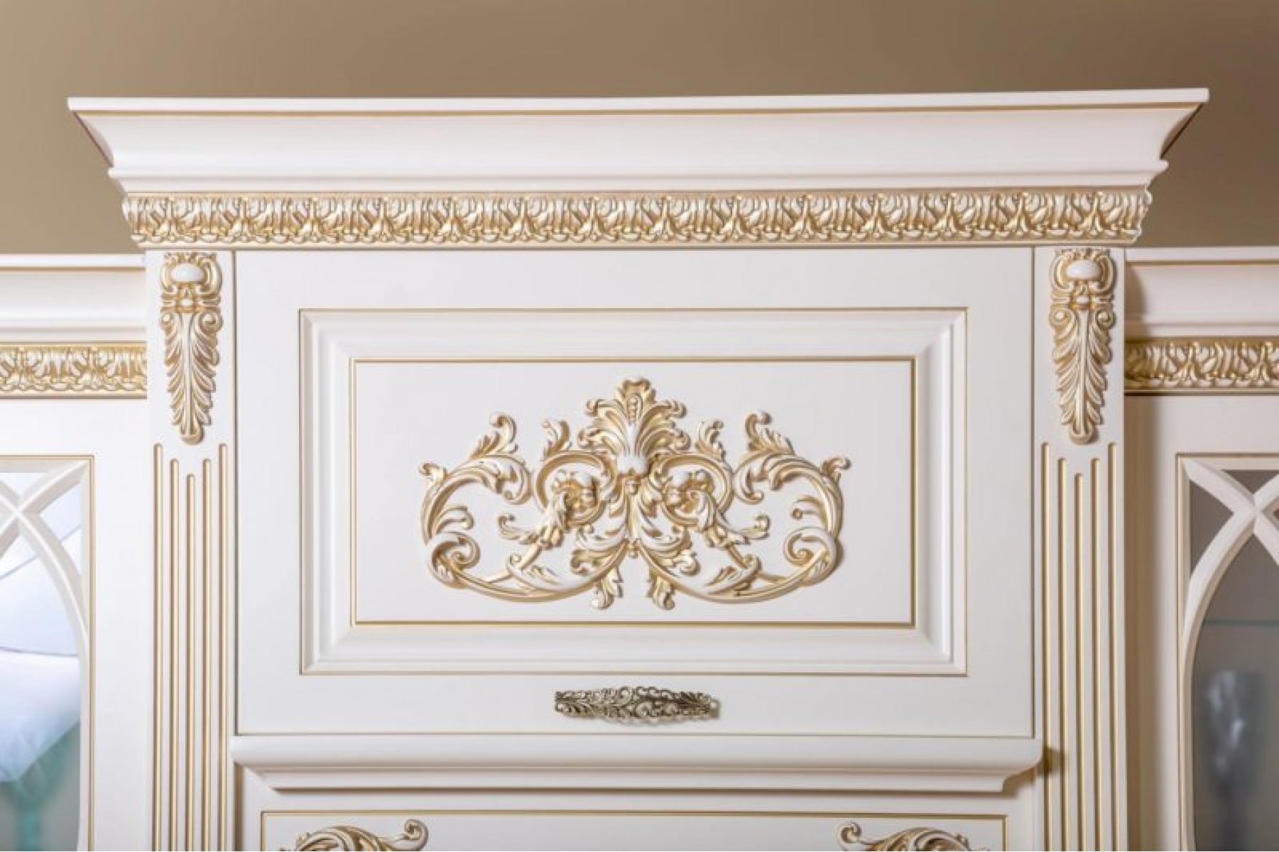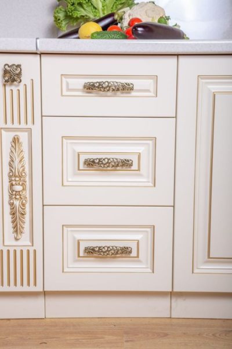 Фасады кухни «Ариана» толщиной 19 мм покрыты тепло-белым водостойким итальянским лаком и элегантно украшены фактурной резьбой с серебристой патиной Борма. Фигурные ручки и изысканный декор подчеркивают презентабельность и выраженный аристократических дух гарнитура.