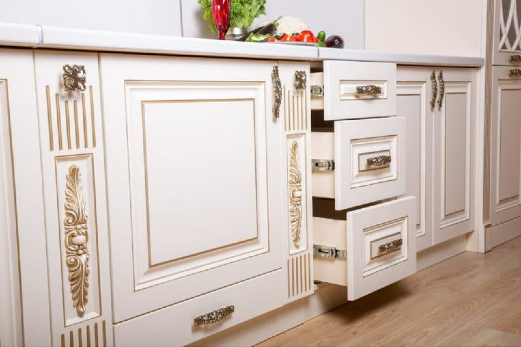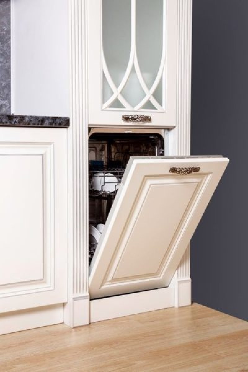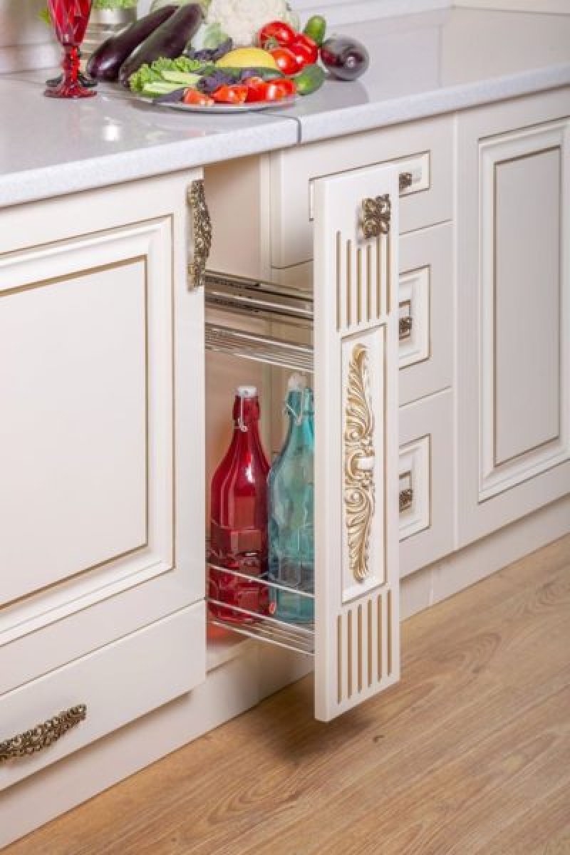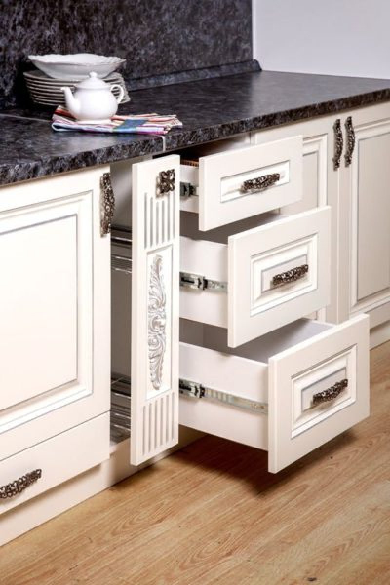 Фасады кухни «Ариана» толщиной 19 мм покрыты тепло-белым водостойким итальянским лаком и элегантно украшены фактурной резьбой с серебристой патиной Борма. Фигурные ручки и изысканный декор подчеркивают презентабельность и выраженный аристократических дух гарнитура.