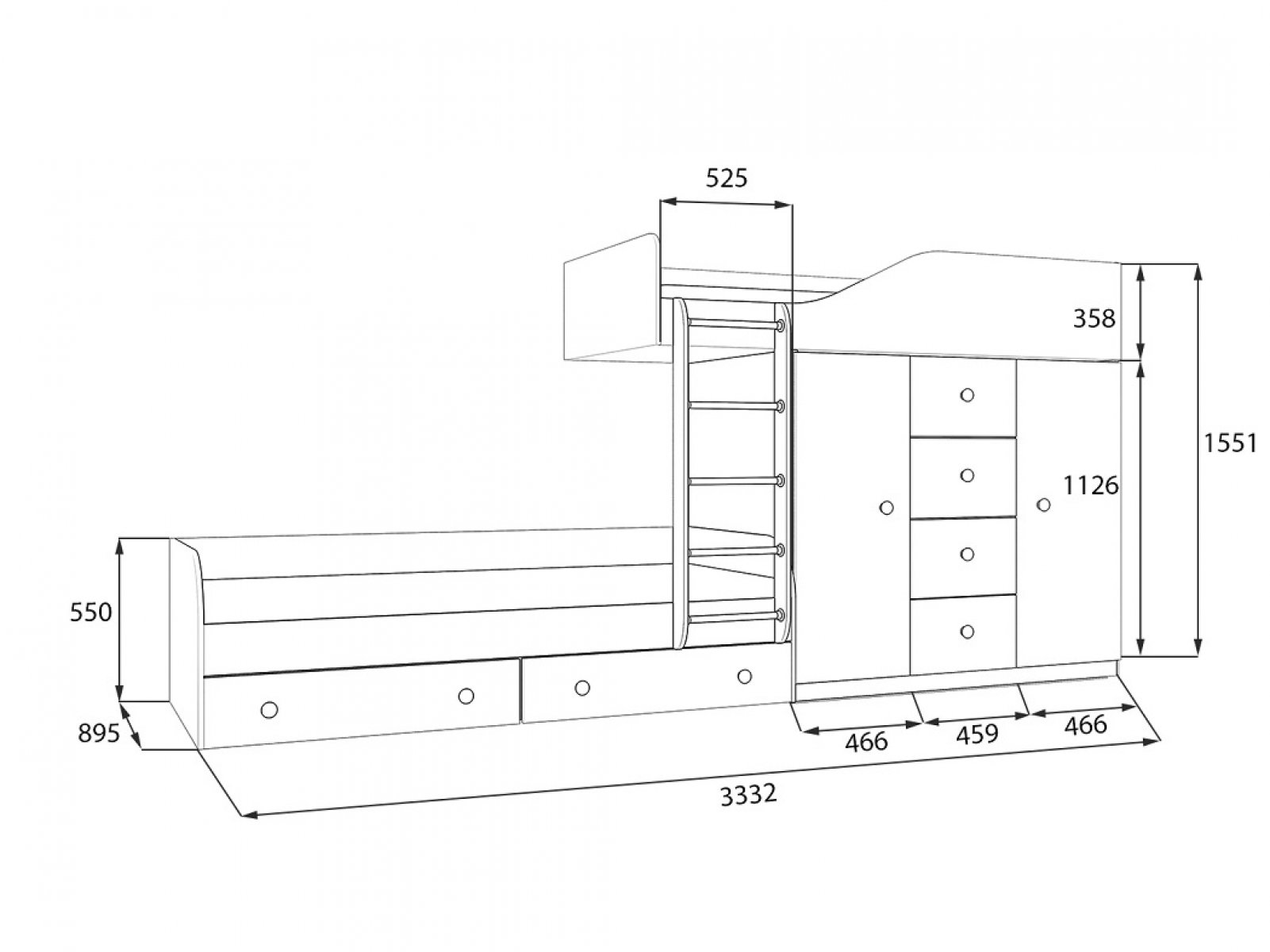 Наличие элементов для хранения придает удобство данному комплекту. Дети останутся довольны, ведь каждый обзаведется своими собственными шкафчиками и ящиками. Верхнее спальное место снабжено защитным бортиком.