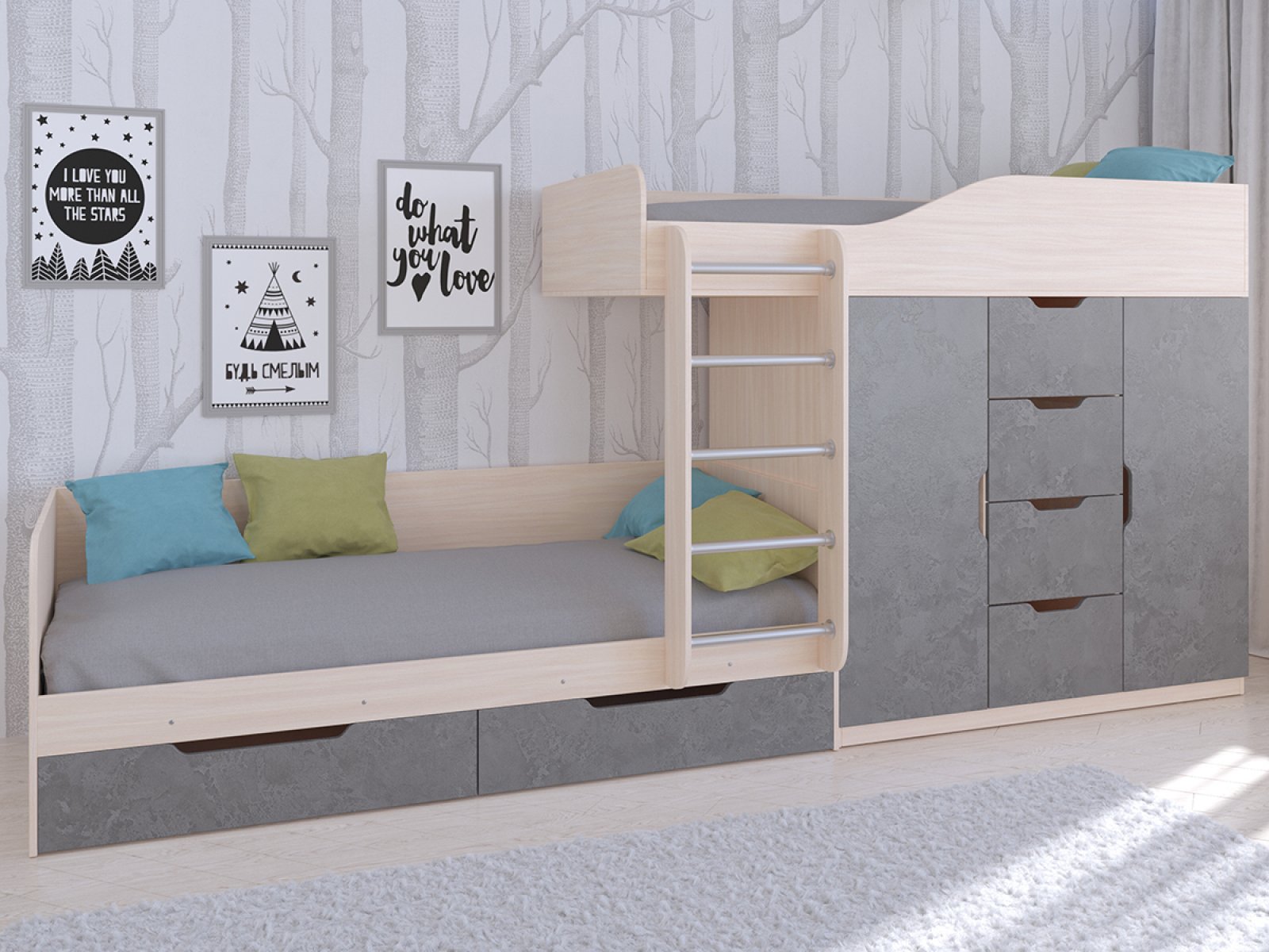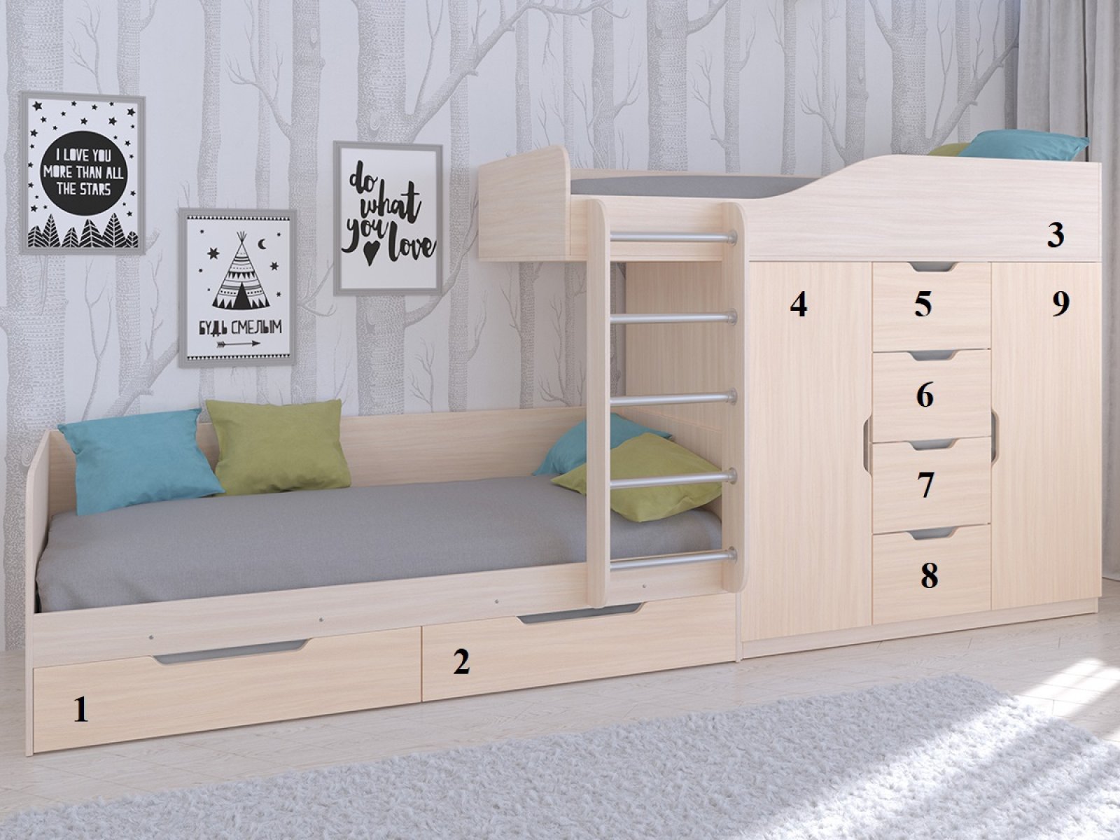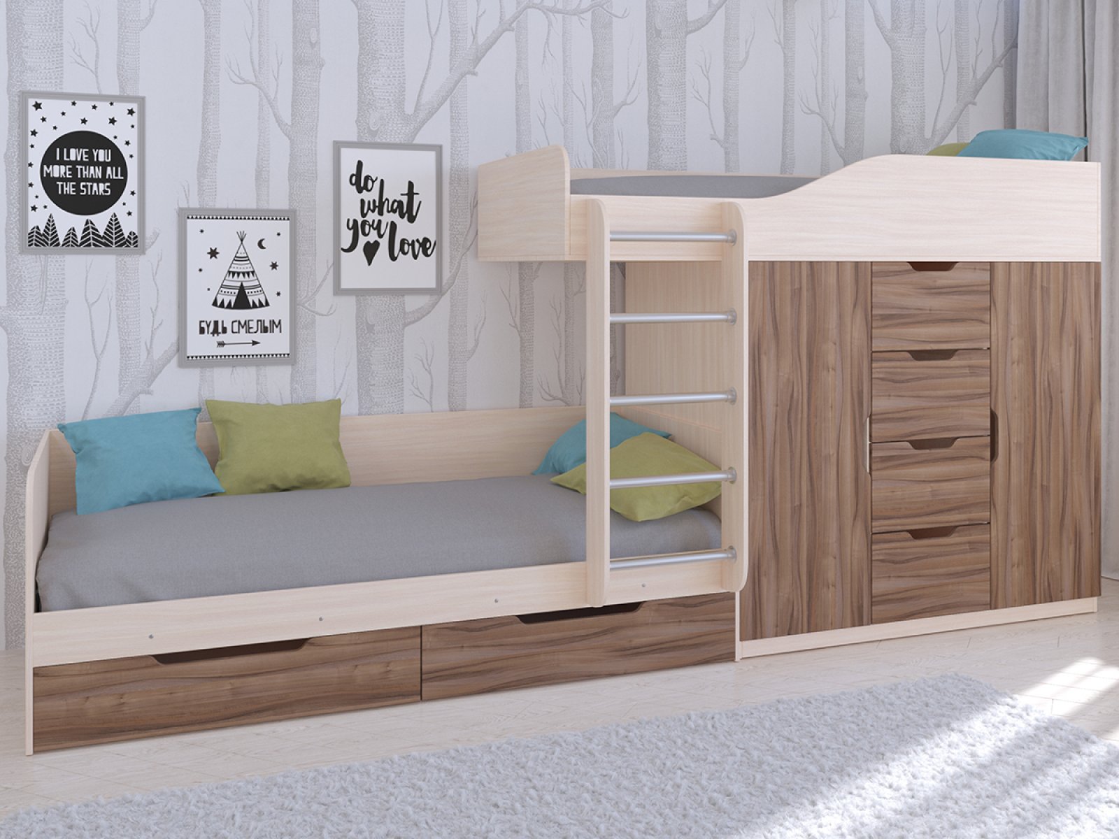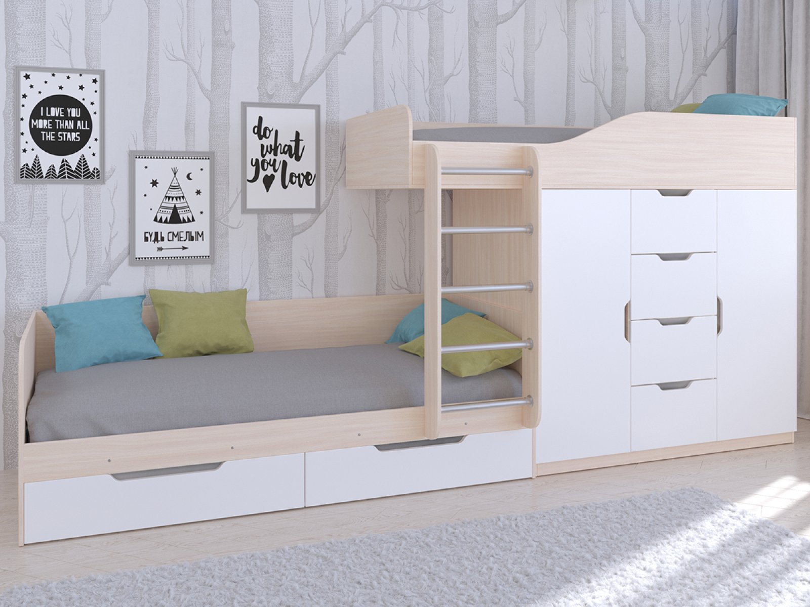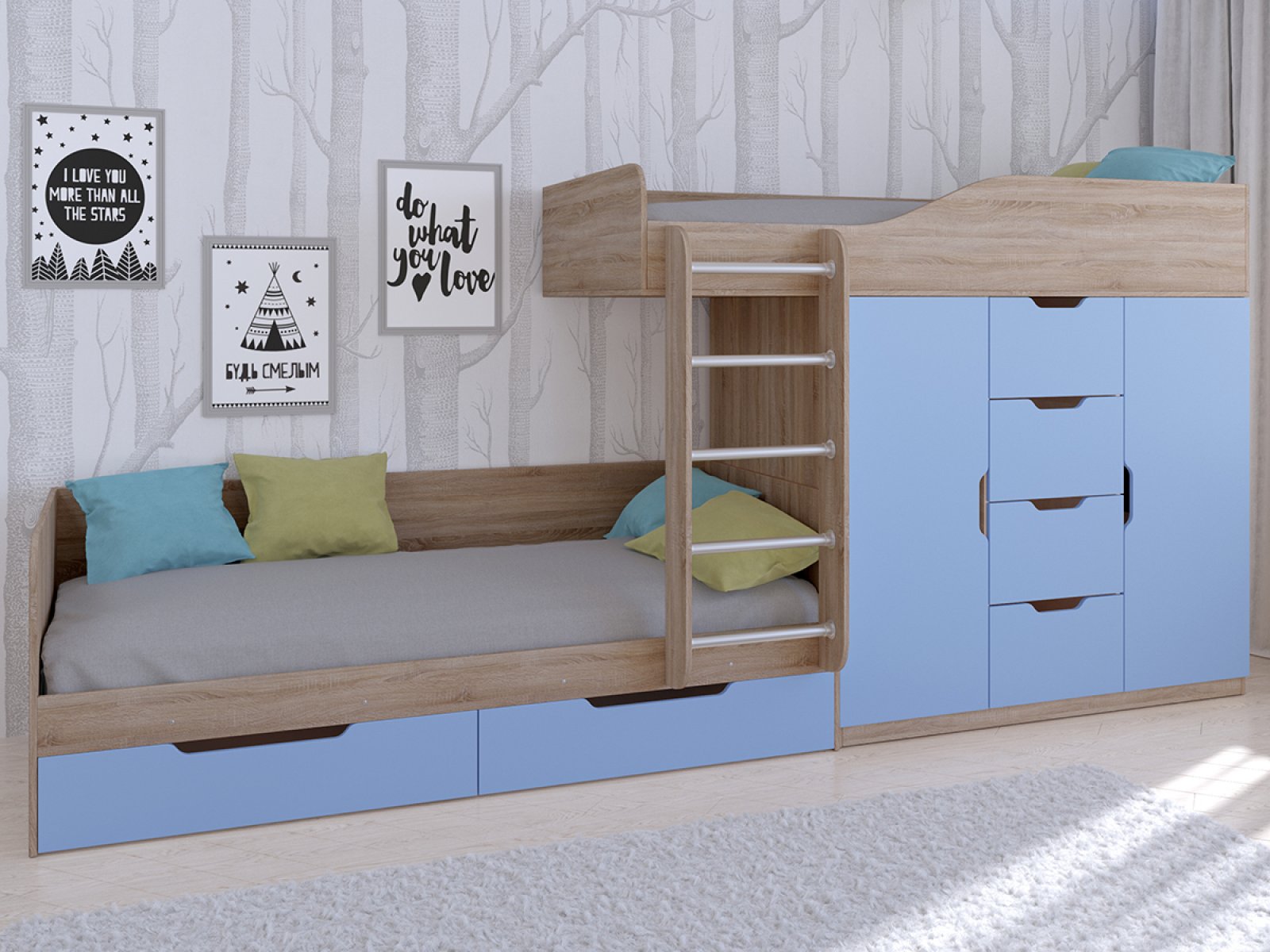 Функциональная и оригинальная двухъярусная кровать Астра 6 мультицвет производства фабрики РВ-мебель подойдет детям любого возраста, а также подросткам, так как она оборудована просторными спальными местами. При этом она смотрится легко и изящно, оставляя достаточно пространства в комнате для игр и другой необходимой мебели. Впрочем, большая часть детских вещей сможет поместиться в этом комплексе.
