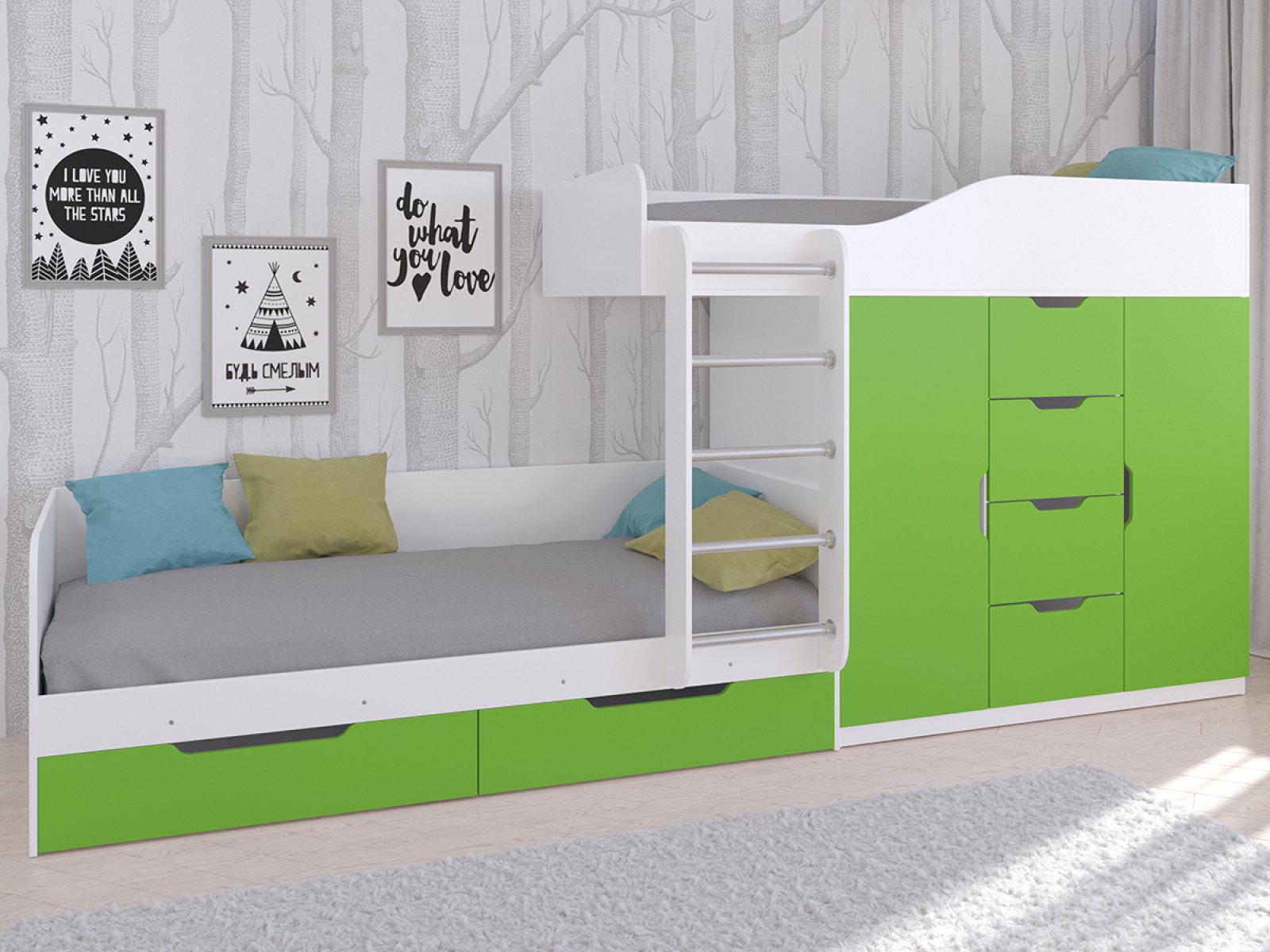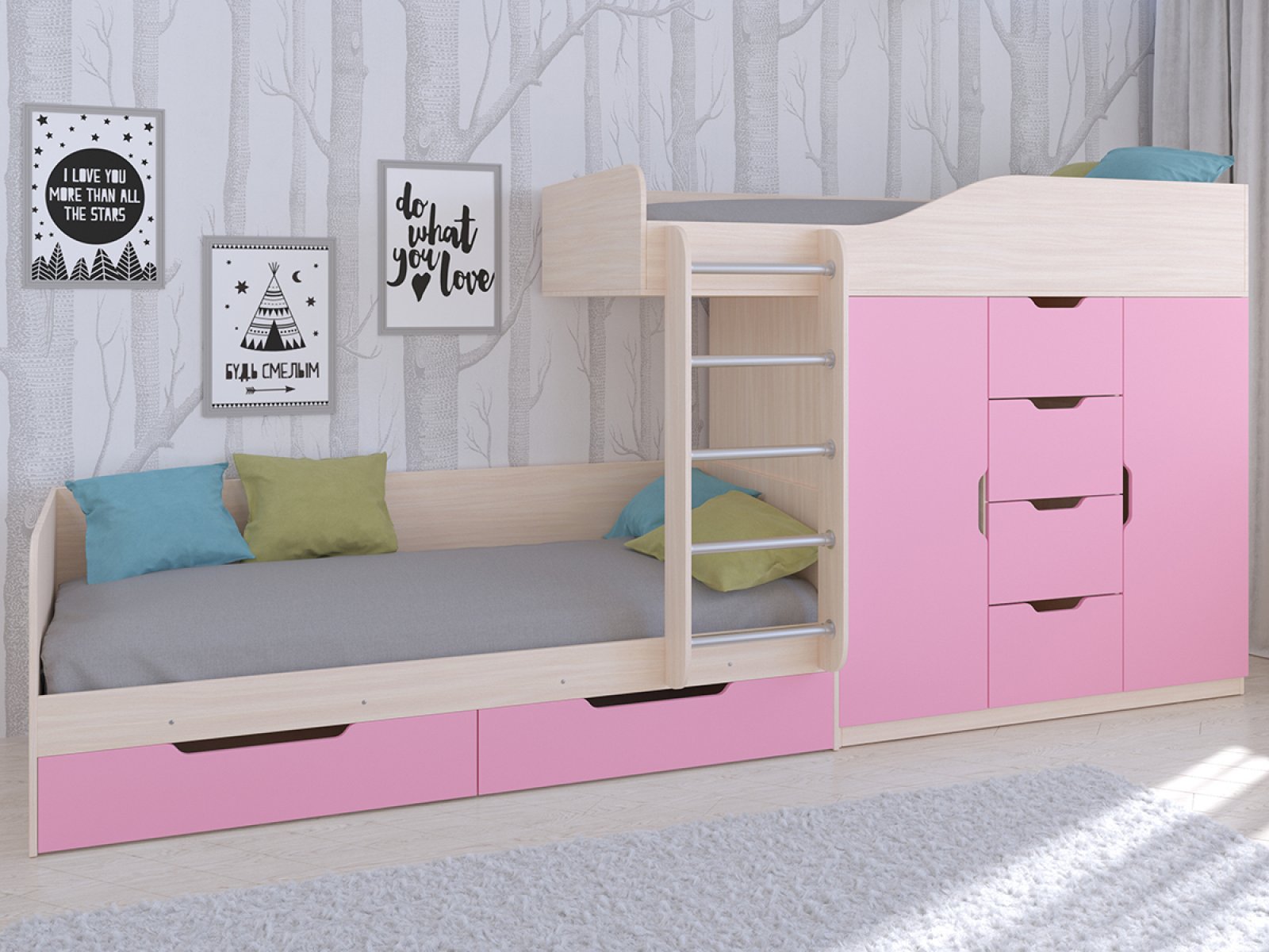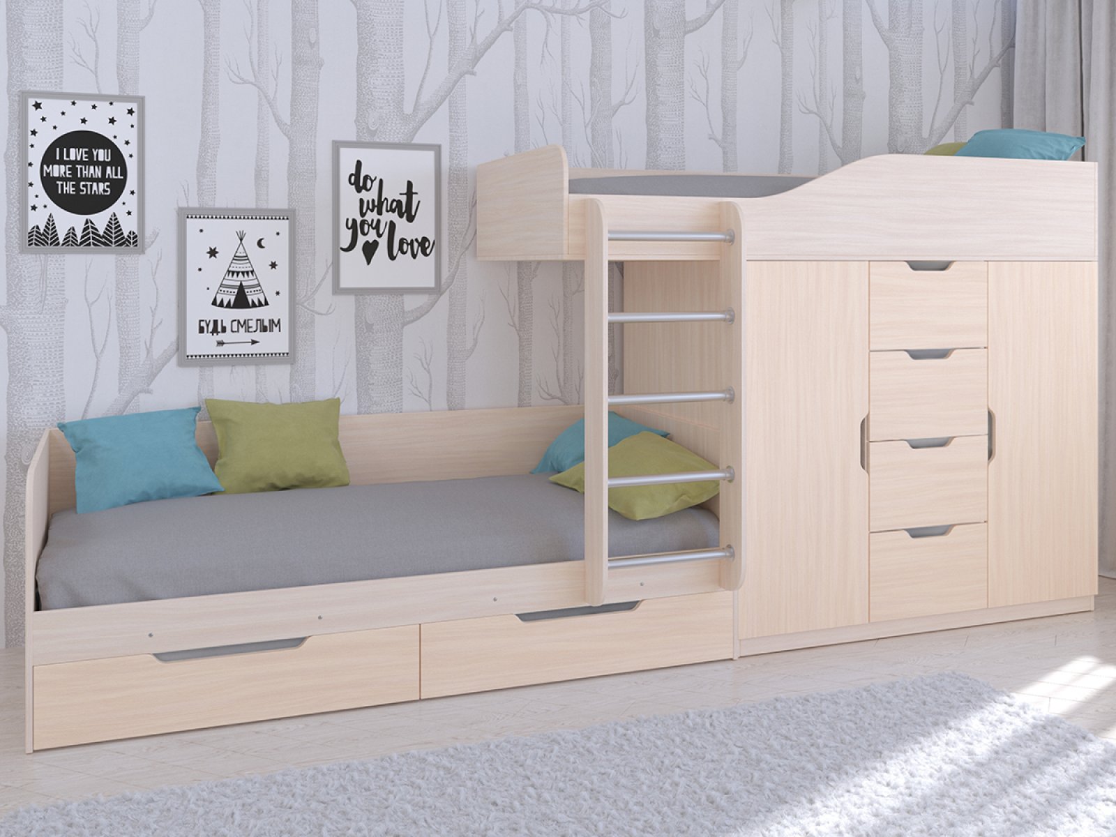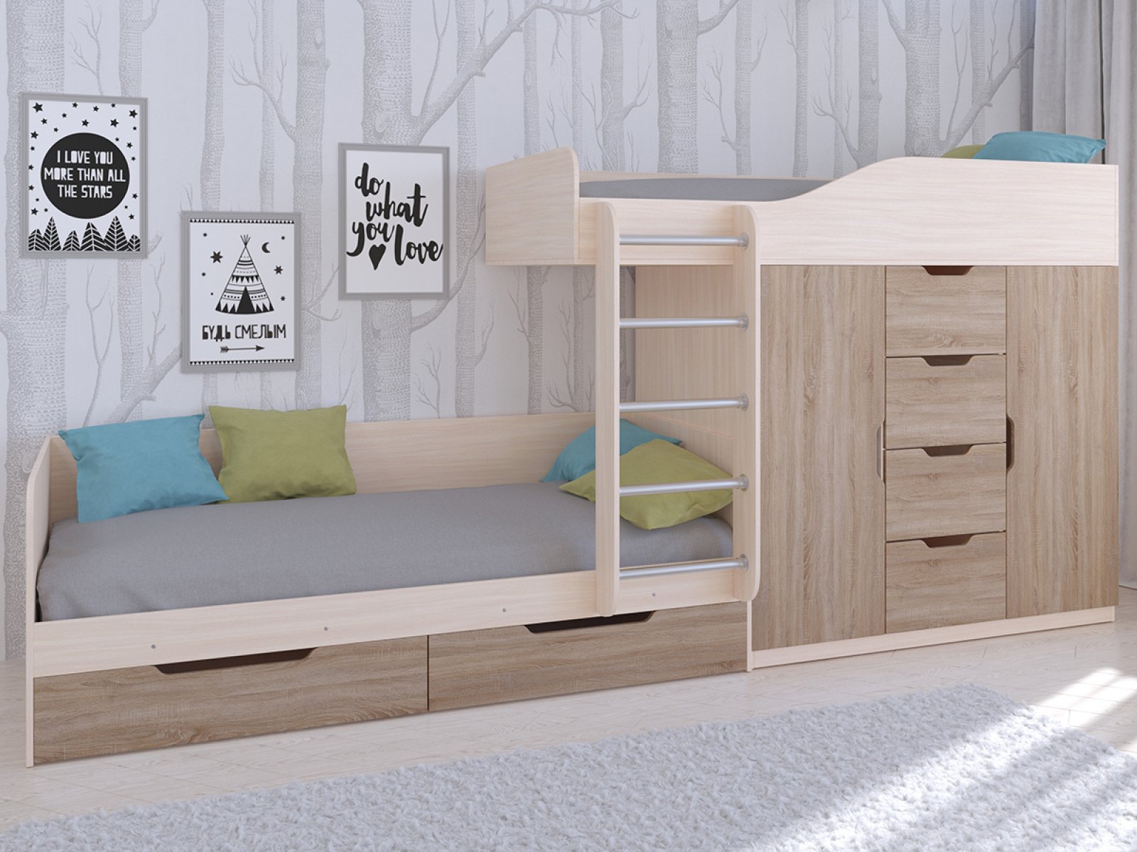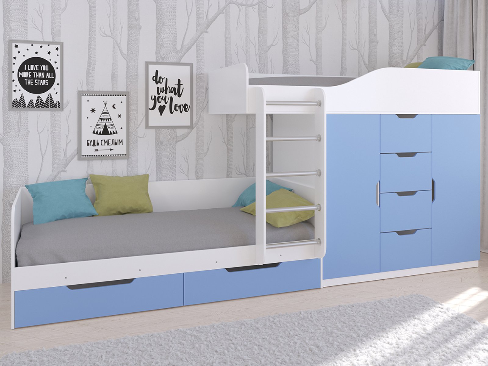 Функциональная и оригинальная двухъярусная кровать Астра 6 мультицвет производства фабрики РВ-мебель подойдет детям любого возраста, а также подросткам, так как она оборудована просторными спальными местами. При этом она смотрится легко и изящно, оставляя достаточно пространства в комнате для игр и другой необходимой мебели. Впрочем, большая часть детских вещей сможет поместиться в этом комплексе.