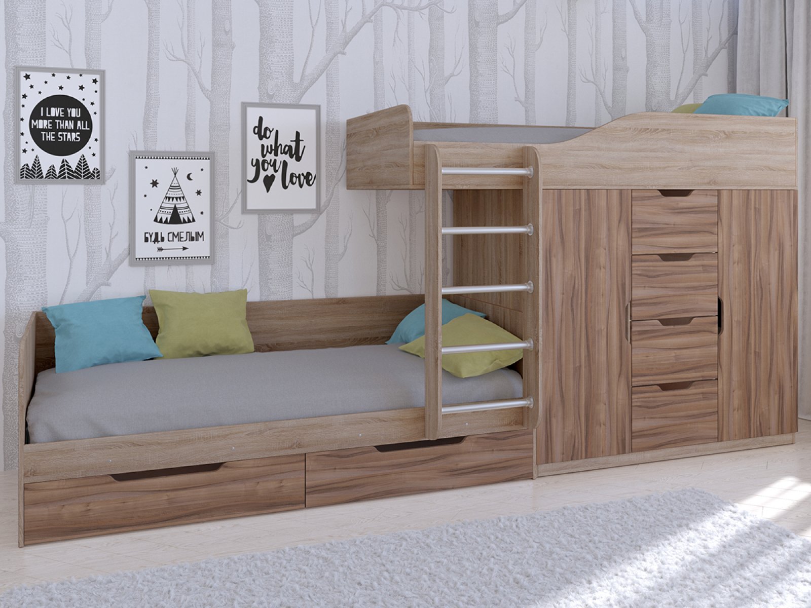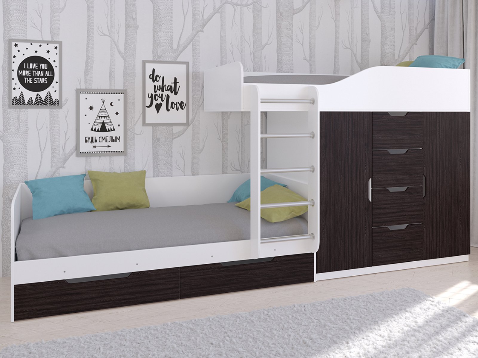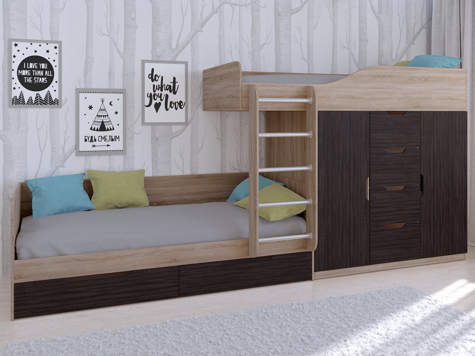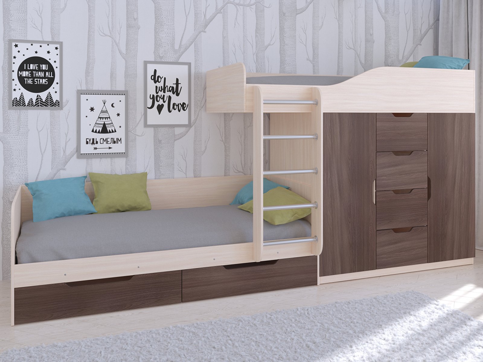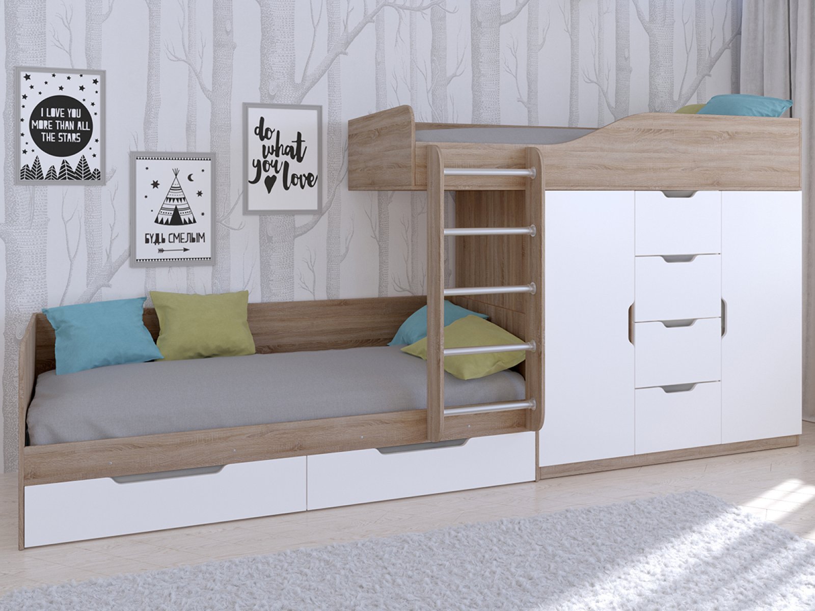 Функциональная и оригинальная двухъярусная кровать Астра 6 мультицвет производства фабрики РВ-мебель подойдет детям любого возраста, а также подросткам, так как она оборудована просторными спальными местами. При этом она смотрится легко и изящно, оставляя достаточно пространства в комнате для игр и другой необходимой мебели. Впрочем, большая часть детских вещей сможет поместиться в этом комплексе.