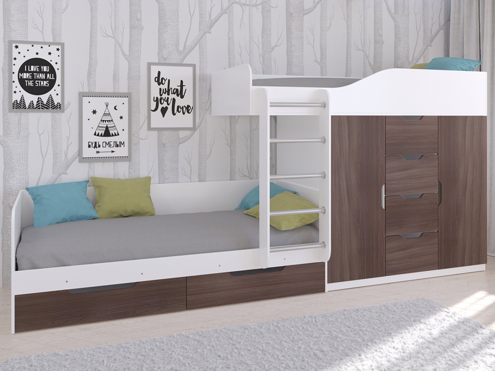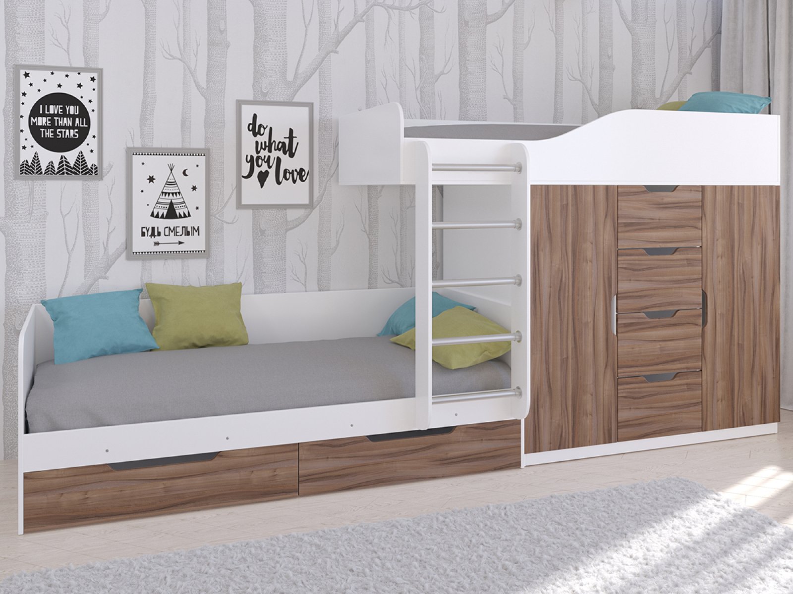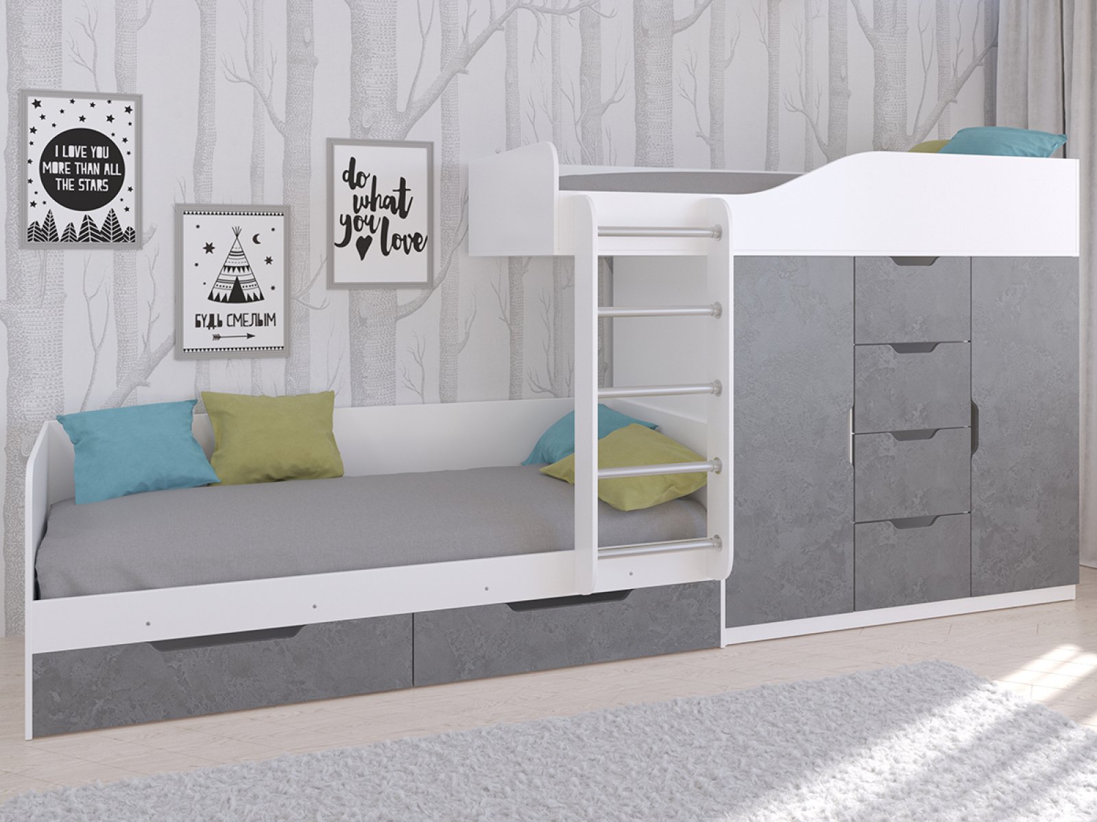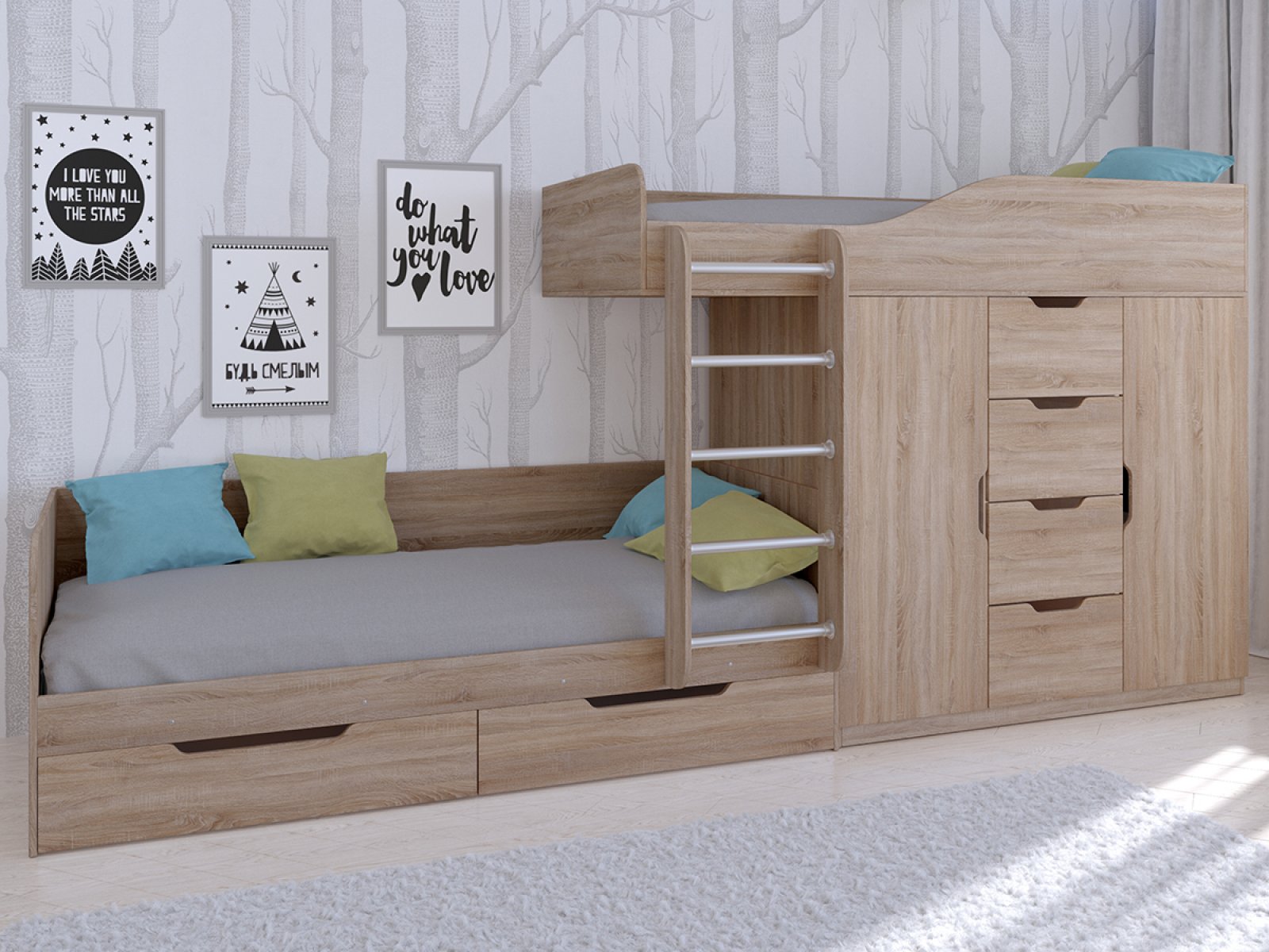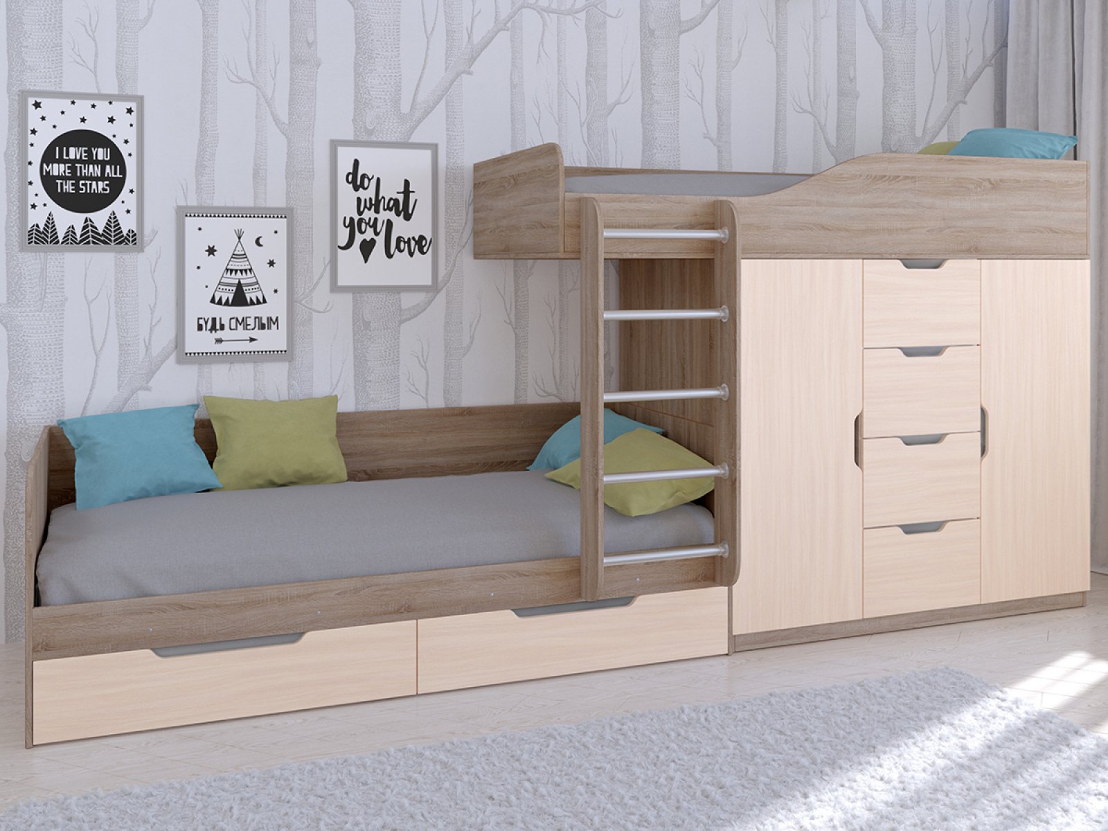 Функциональная и оригинальная двухъярусная кровать Астра 6 мультицвет производства фабрики РВ-мебель подойдет детям любого возраста, а также подросткам, так как она оборудована просторными спальными местами. При этом она смотрится легко и изящно, оставляя достаточно пространства в комнате для игр и другой необходимой мебели. Впрочем, большая часть детских вещей сможет поместиться в этом комплексе.