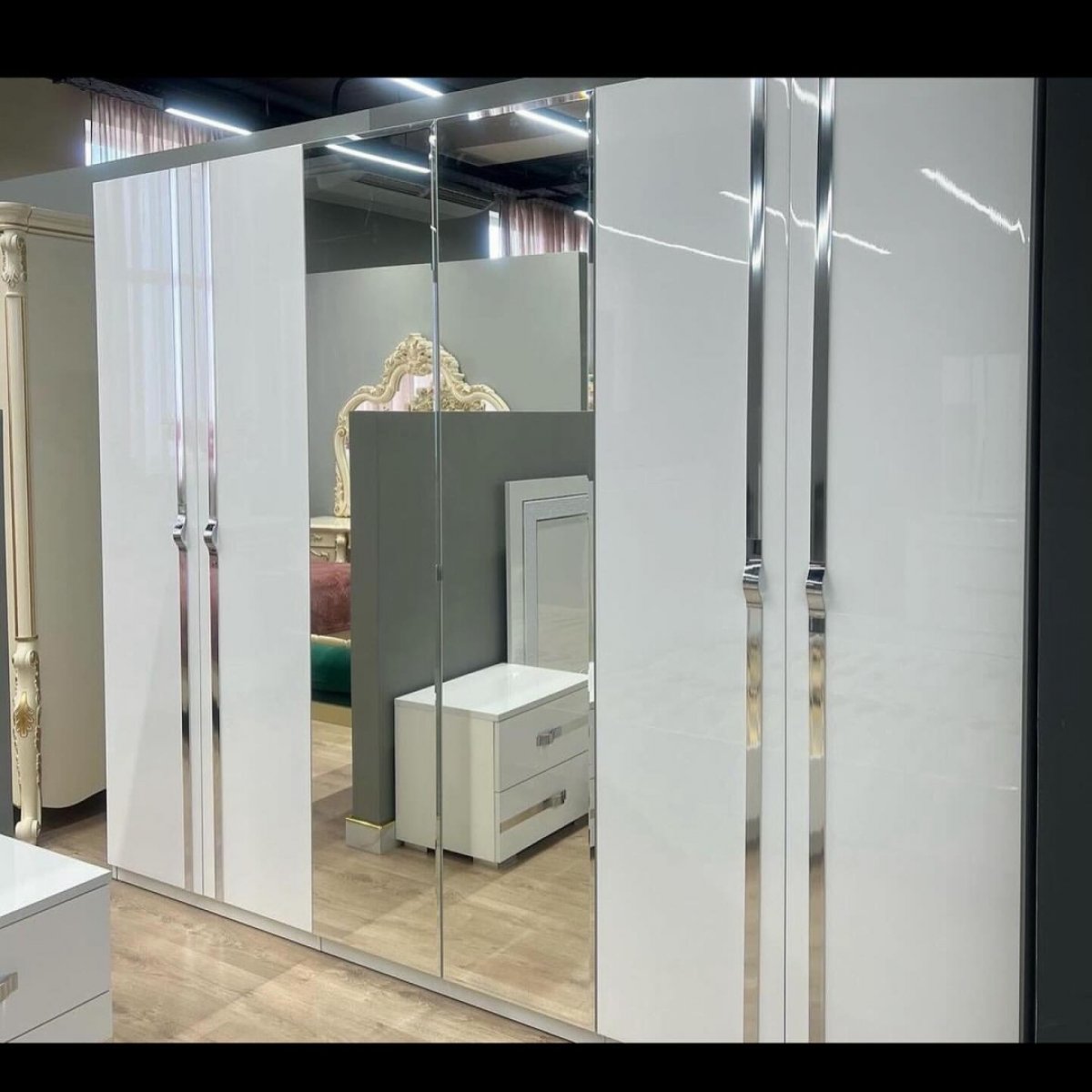 Каркас и фасад – ДСП, цвет – белый, отделка – высокоглянцевые полиакриловые лакокрасочные материалы УФ отверждения, цвет глянца – белый