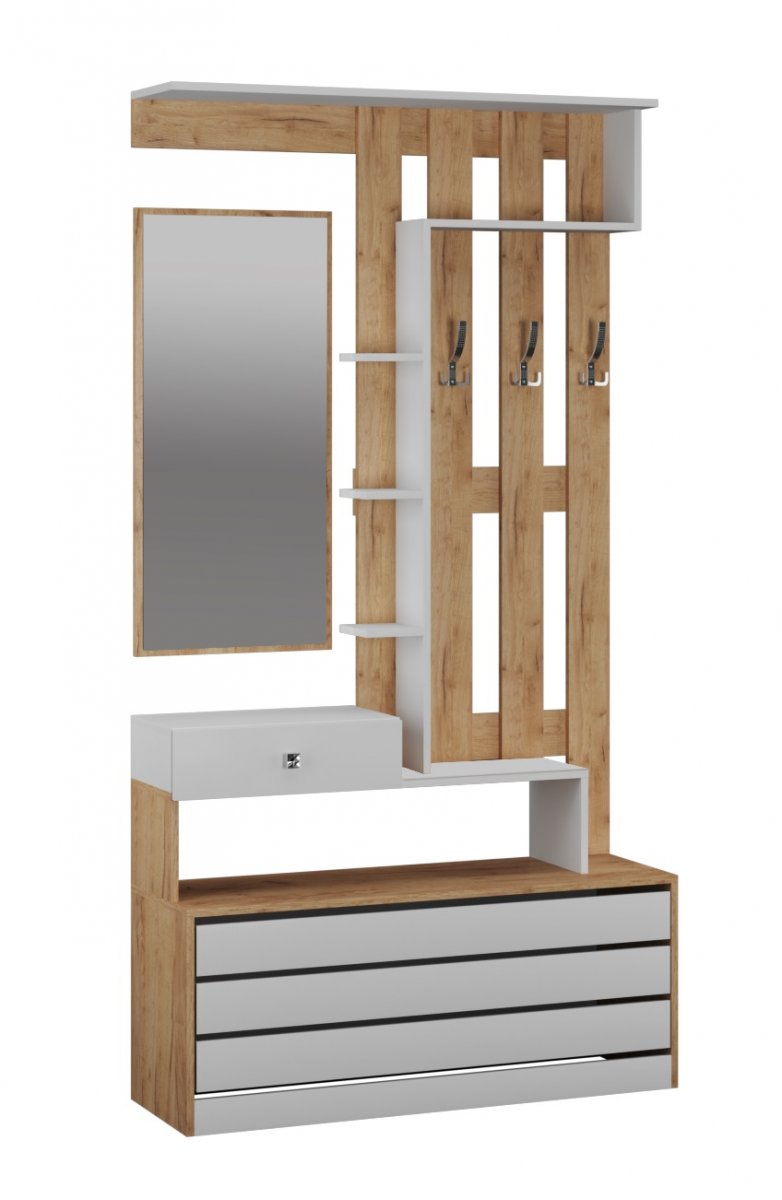 Если пространство Вашей прихожей не позволяет расположить много мебели, советуем обратить внимание на секцию из коллекции Ямайка. Модуль уникален по своей функциональности и содержит нишу для обуви с откидной дверцей, выдвижной ящик для мелочей, открытую вешалку с 3-мя крючками, полку-антресоль, набор открытых полок и зеркало. Ширина в 110 см позволит Вам расположить секцию даже в малогабаритной прихожей.