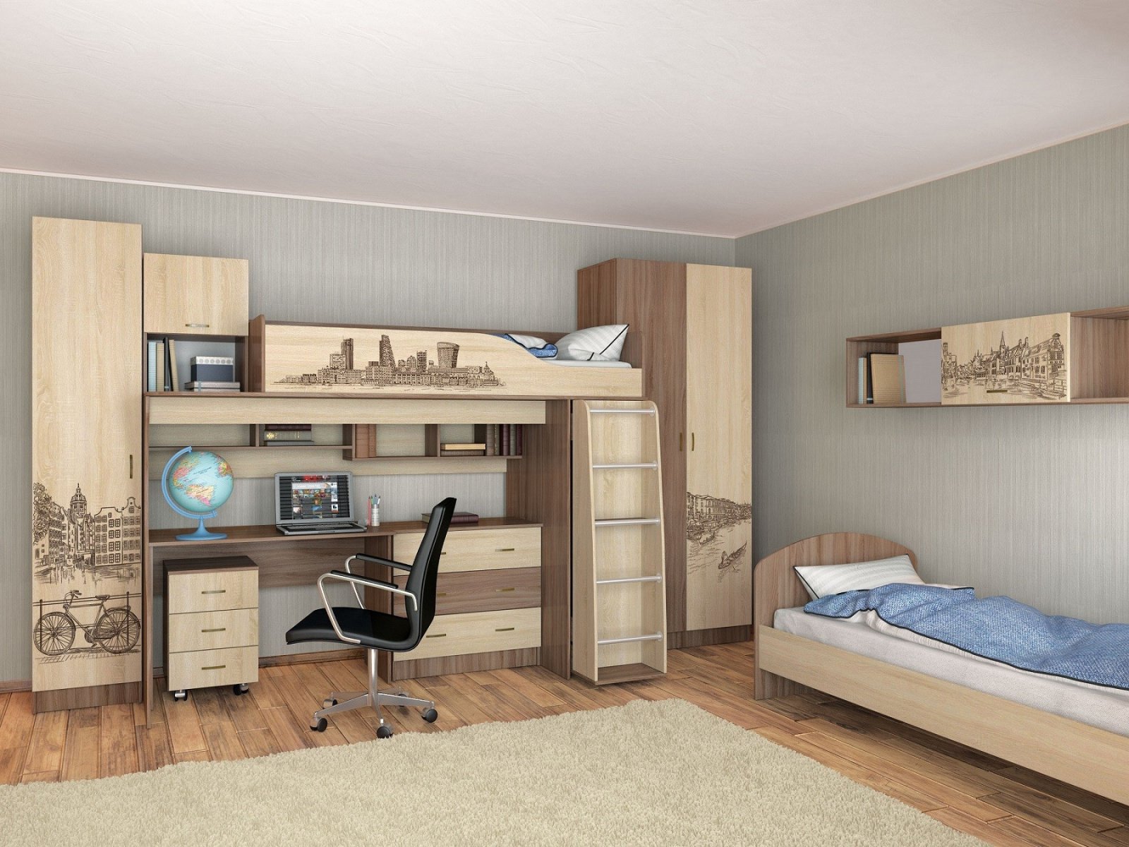 - Широкий выбор модулей: функциональная кровать-чердак, вместительные шкафы и пенал с выдвижными ящиками