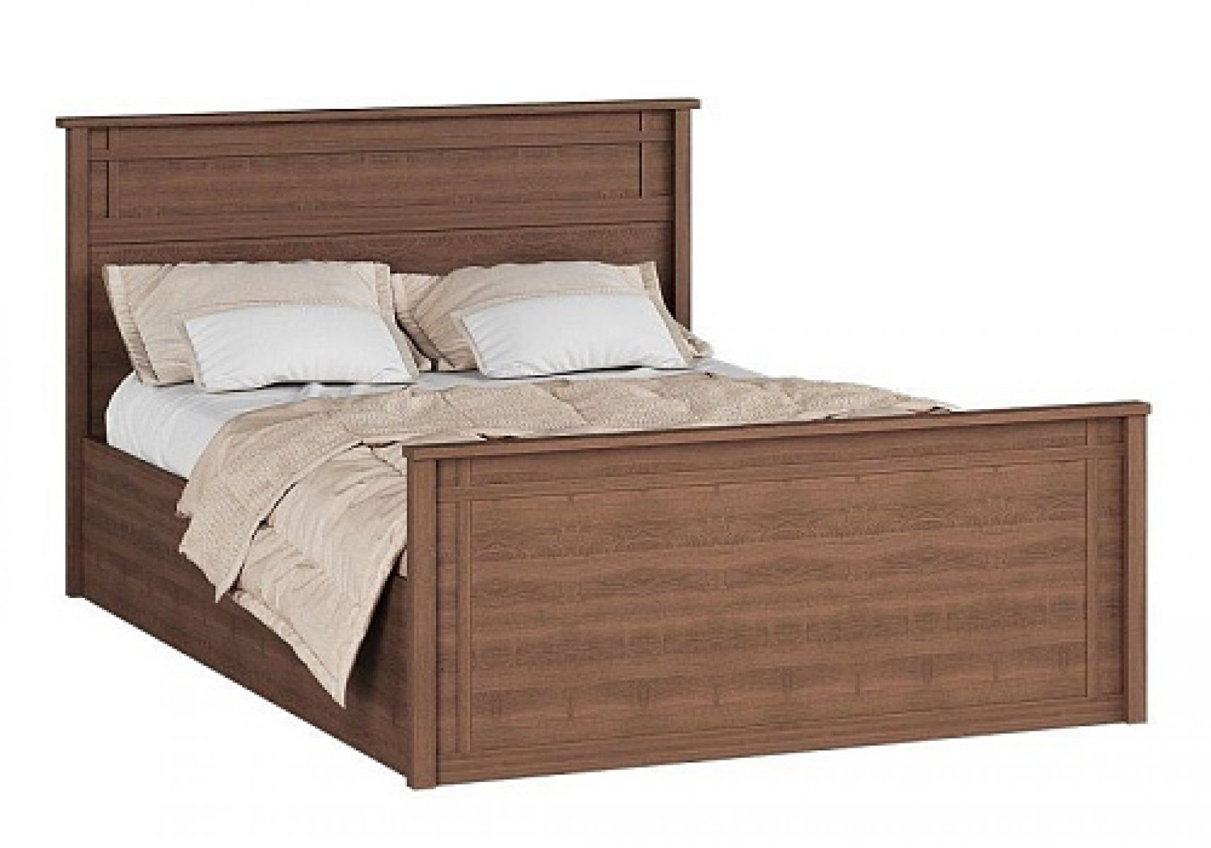 Глухое строгое изголовье и изножье украшены МДФ-раскладками.