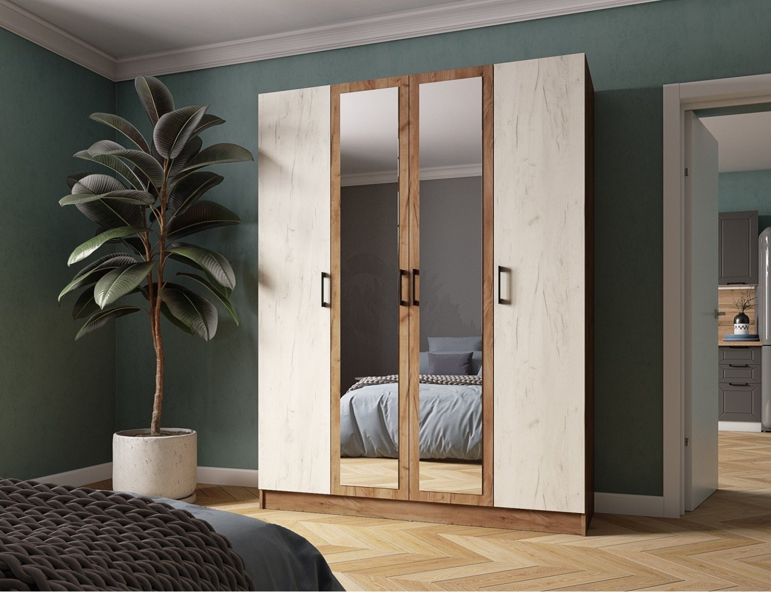 Вместительный четырехстворчатый шкаф Вегас - это продуманная до мелочей полноценная система хранения для просторной прихожей или спальни. Зеркальные фасады визуально облегчают конструкцию шкафа и делают ее менее массивной. Внутри модуля расположена хромированная стационарная штанга и комплект полок.