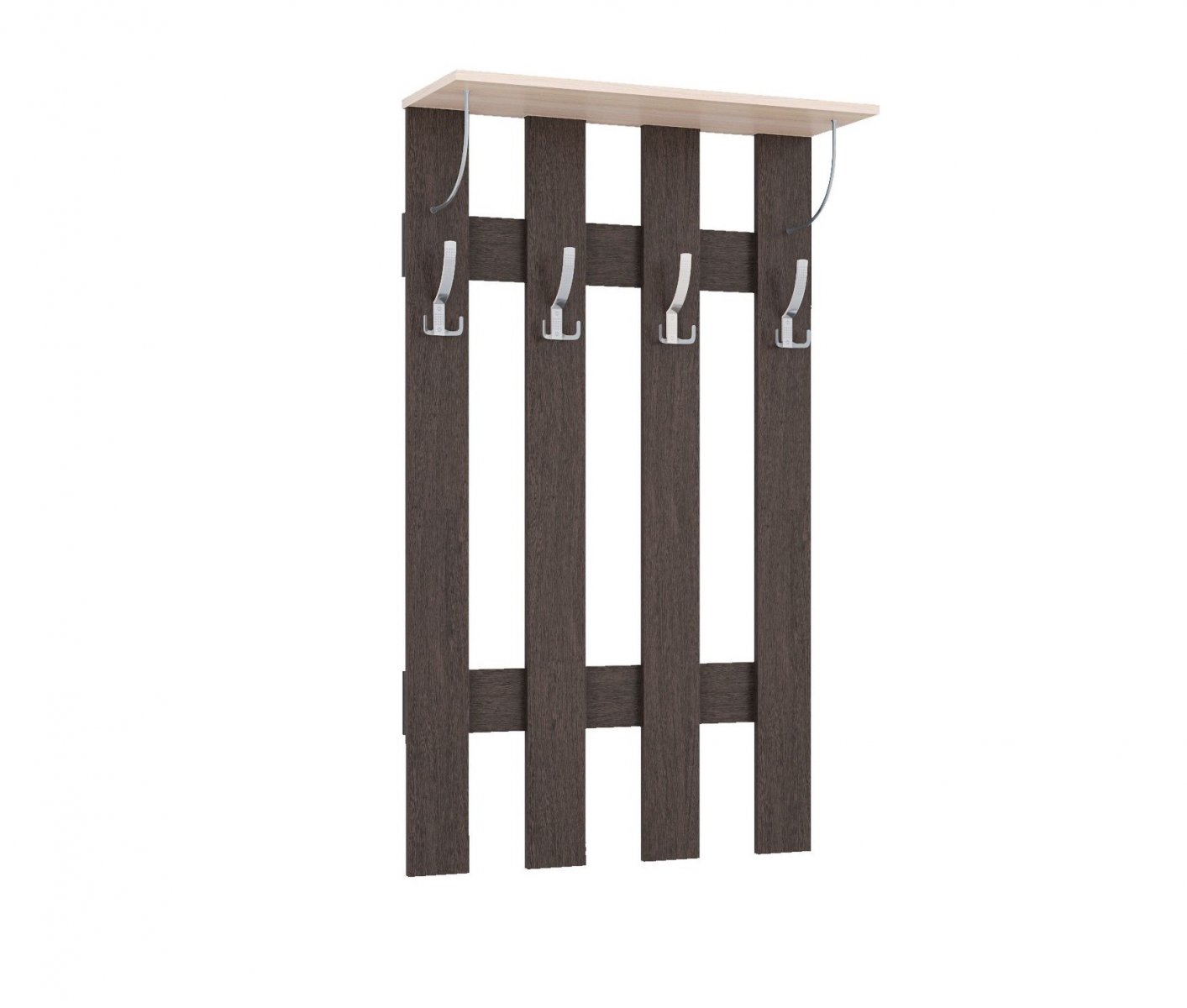 В поисках практичнойвешалки для Вашей прихожей обратите внимание на модель из коллекции Ямайка. Вешалка состоит из панелей ЛДСП, соединенных между собой надежными креплениями, 4-х крючков и открытой полки-антресоли. Это отличное решение для малогабаритных помещений, где не хватит места полноценной системе хранения. Вешалка подойдет для верхнейодежды ежедневной носки.