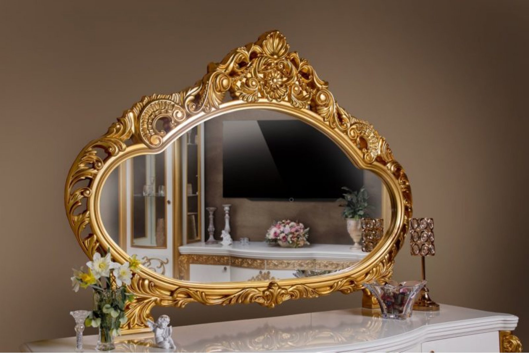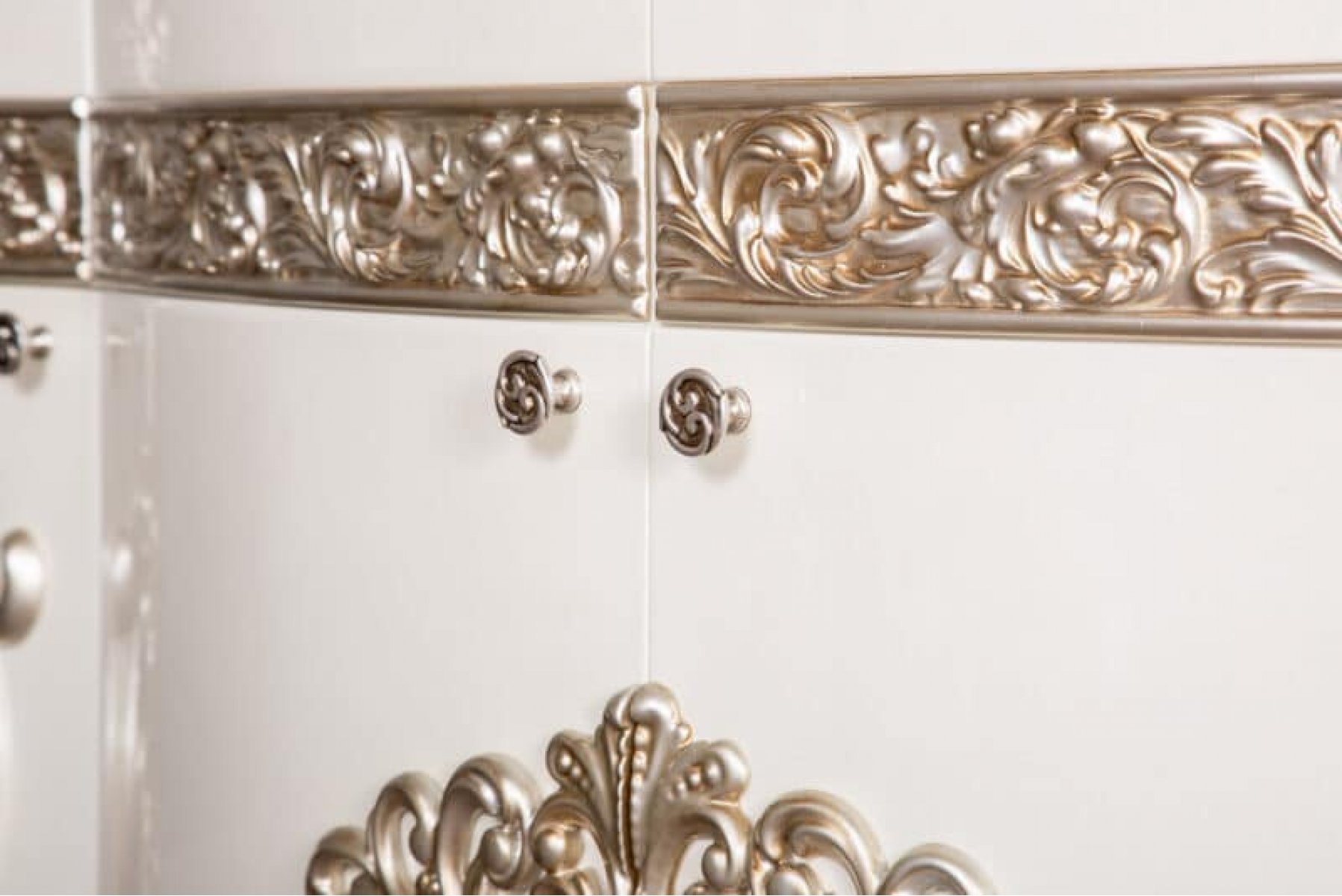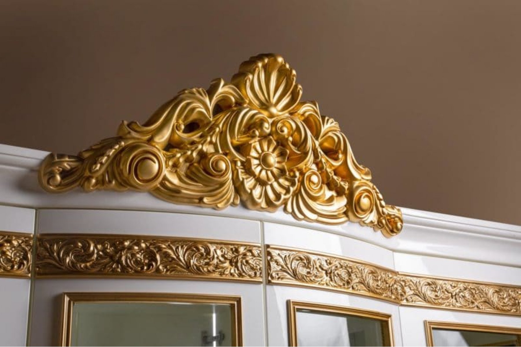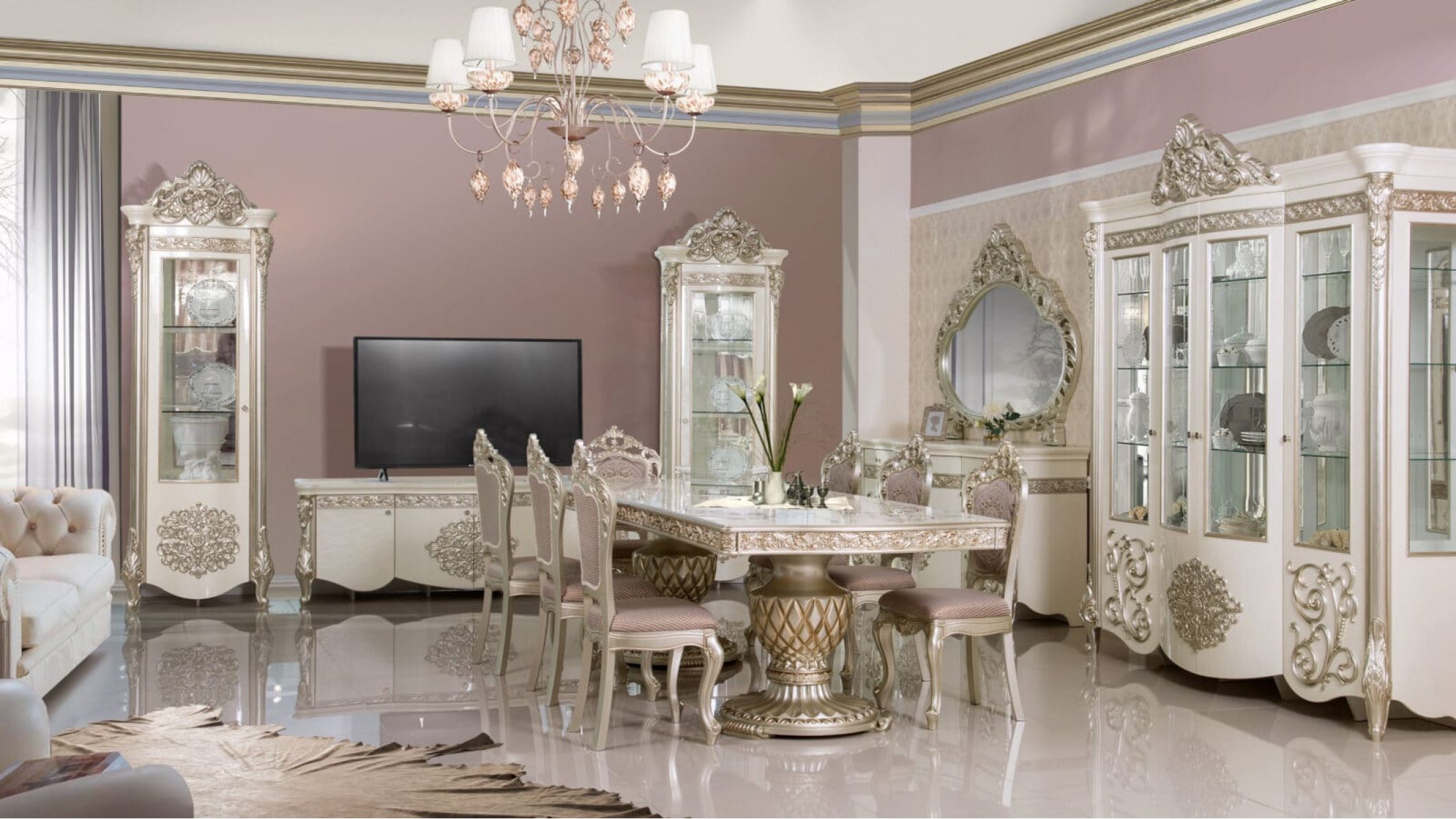 Гостиная "Маркиза" в стиле классика гармонично дополнит интерьер вашего дома. Фасады серванта, пеналов, TV тумбы и комода с зеркалом, входящих в мебель, отделаны декоративными резными узорами, что придаст гостиной изящества