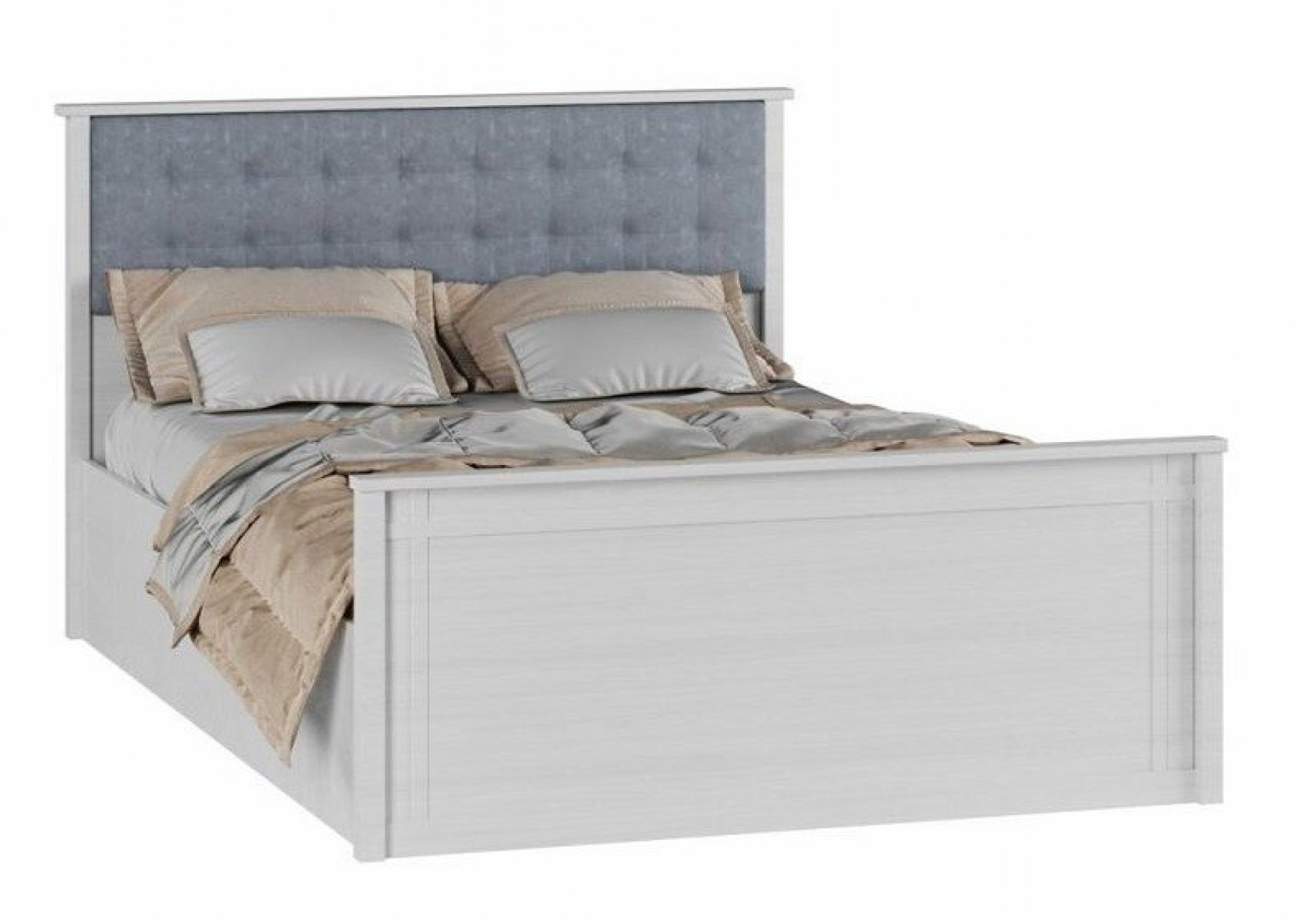 Мягкая накладка в изголовье подобрана в тон исполнения спального гарнитура: «Пастельно-голубая» в Ясене Анкоре Светлом и «Латте» в Орехе Донском. Изножье украшено МДФ-раскладками.