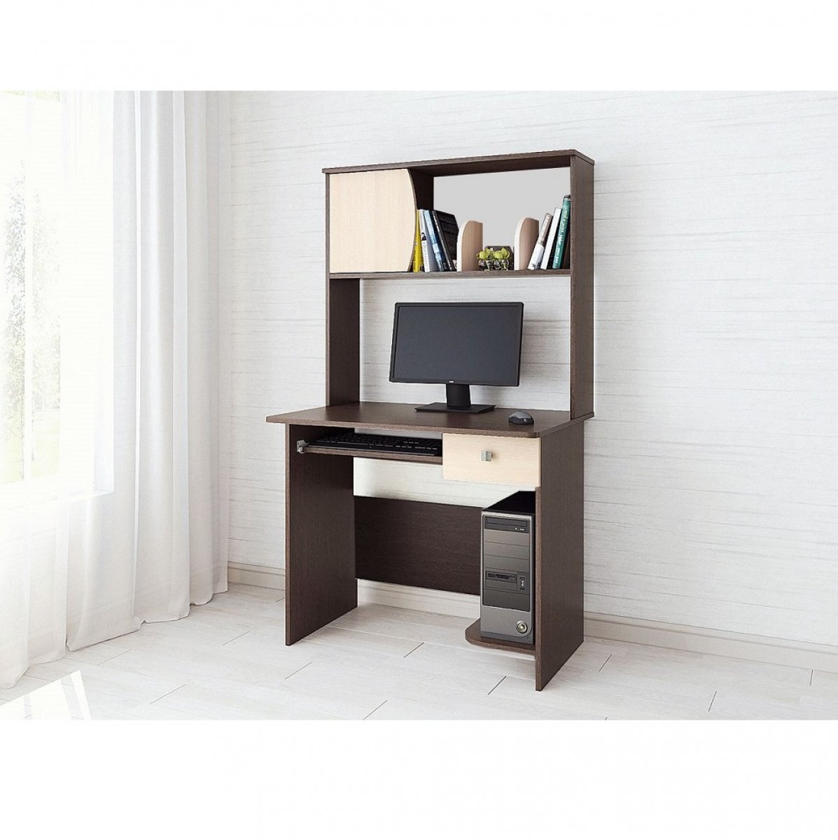 Может ли рабочее место дома быть функциональным, но при этом компактным? Конечно, если это компьютерный стол Грета-4. Ширина модуля всего 90 см, а это значит, что Вы сможете установить его даже в малогабаритной комнате. Стол оснащен выдвижной панелью для клавиатуры и ящиком на роликовых направляющих, полкой под процессор, а также надстройкой с отрытой и закрытой нишами. Опоры стола имеют пластиковые подпятники, предохраняющие напольное покрытие от деформации.