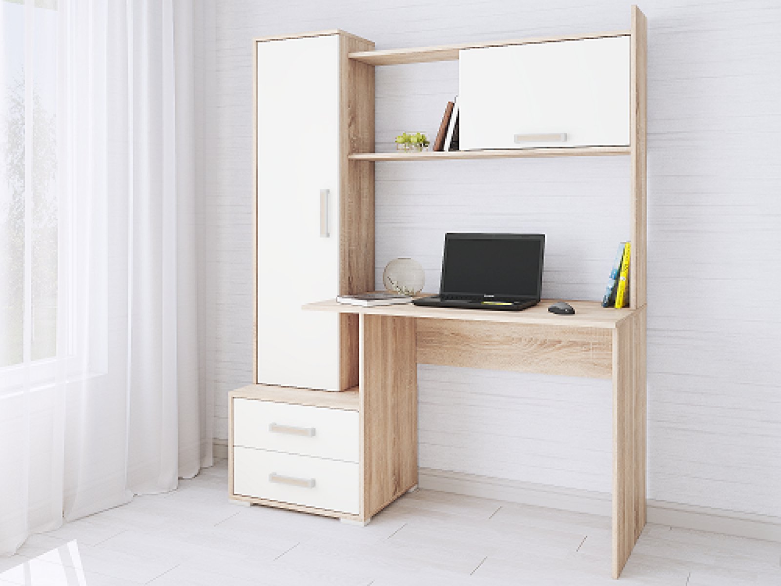 Компьютерный стол Квартет-9 - модуль, продуманный до мелочей и созданный для Вашего максимального комфорта в процессе работы или учебы дома. Прямоугольная столешница с плавными углами, надстройка с открытой и закрытой полками, закрытый шкаф-пенал и тумба с двумя выкатными ящиками - все, чтобы обеспечить удобное и грамотное хранение на рабочем месте. Приятный декор с имитацией текстуры натурального дерева придется по душе любителям эко-стиля в интерьере.