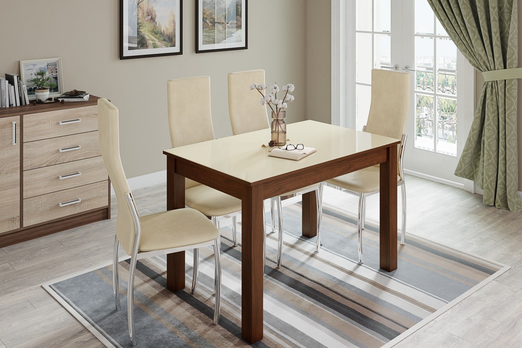 Обеденный стол Норман по достоинству оценят любители качественной и привлекательной мебели. Столешница изготовлена из ЛДСП и покрыта стеклом в декоре "лакобель ваниль". Имеет скругленные углы, что не только визуально привлекательно, но и безопасно для ежедневного использования. Опоры из МДФ облицованы высококлассной финиш-пленкой цвета "орех шоколадный". Сочетание светлой столешницы и темных ногвыглядит контрастно, но стильно.