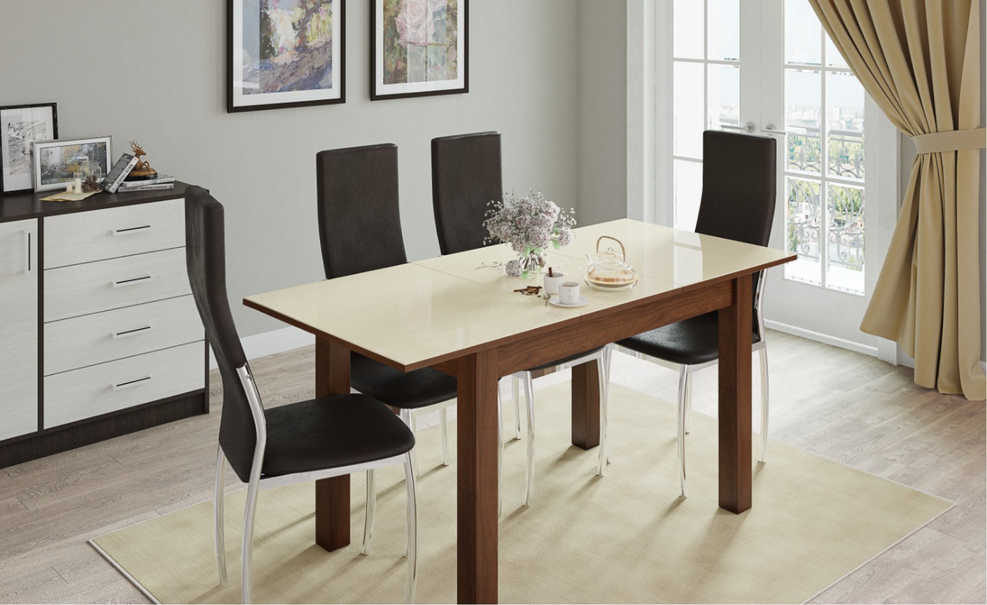 Купить раскладной стол для кухни в трендовом декоре сегодня не составит труда. Обратите внимание на модель Бруно. Столешница выполнена из высококлассного ЛДСП и покрыта стеклом лакобель ваниль, а опоры из МДФ облицованы защитной финиш-пленкой цвета "орех шоколадный". В разложенном виде ширина столешницы увеличивается на 40 см, что позволит Вам разместить за столом всех желающих. Механизм разложения "бабочка" удобен для частого использования и долговечен.