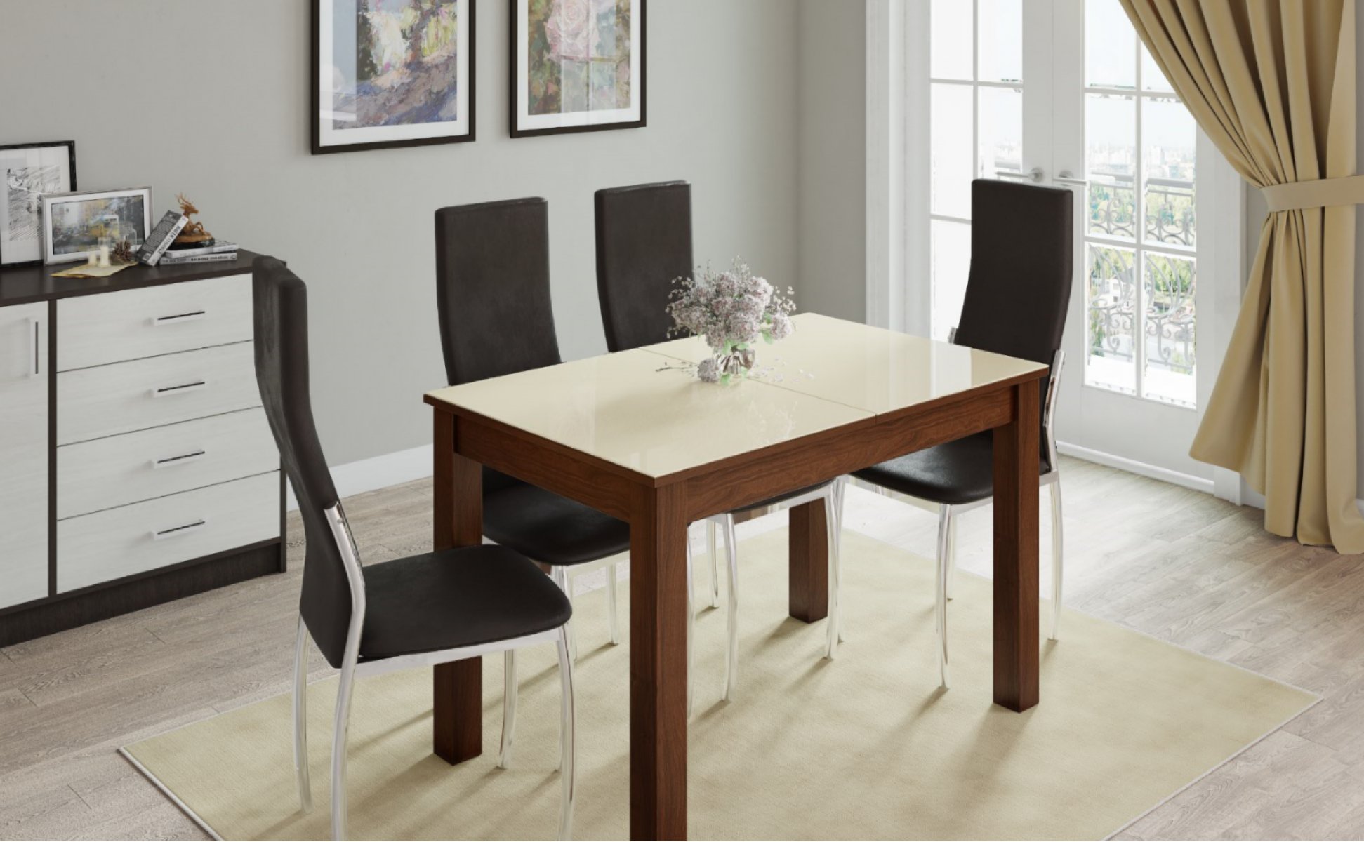Купить раскладной стол для кухни в трендовом декоре сегодня не составит труда. Обратите внимание на модель Бруно. Столешница выполнена из высококлассного ЛДСП и покрыта стеклом лакобель ваниль, а опоры из МДФ облицованы защитной финиш-пленкой цвета "орех шоколадный". В разложенном виде ширина столешницы увеличивается на 40 см, что позволит Вам разместить за столом всех желающих. Механизм разложения "бабочка" удобен для частого использования и долговечен.
